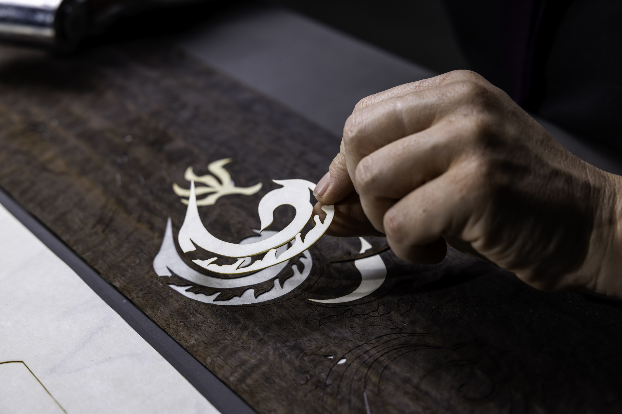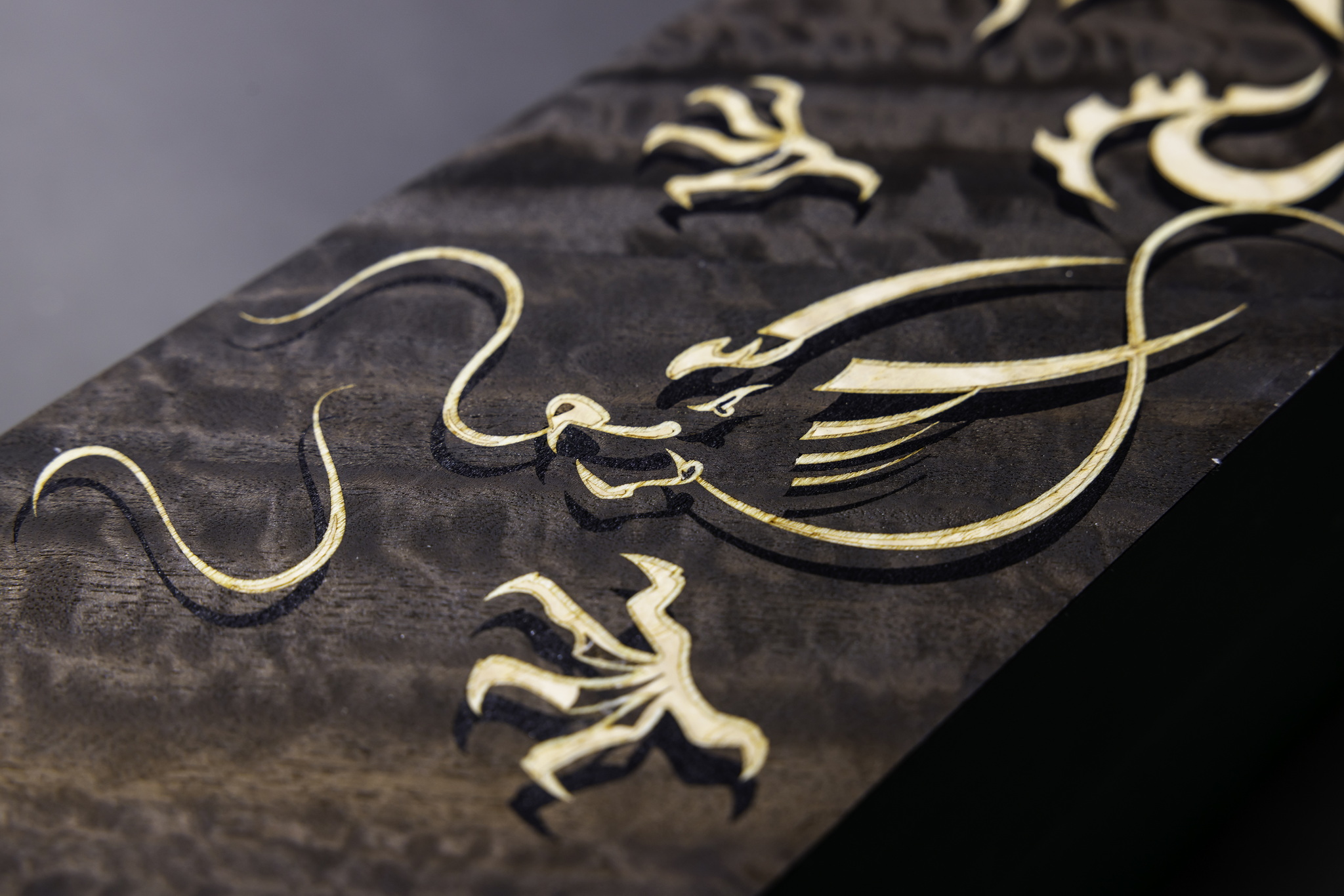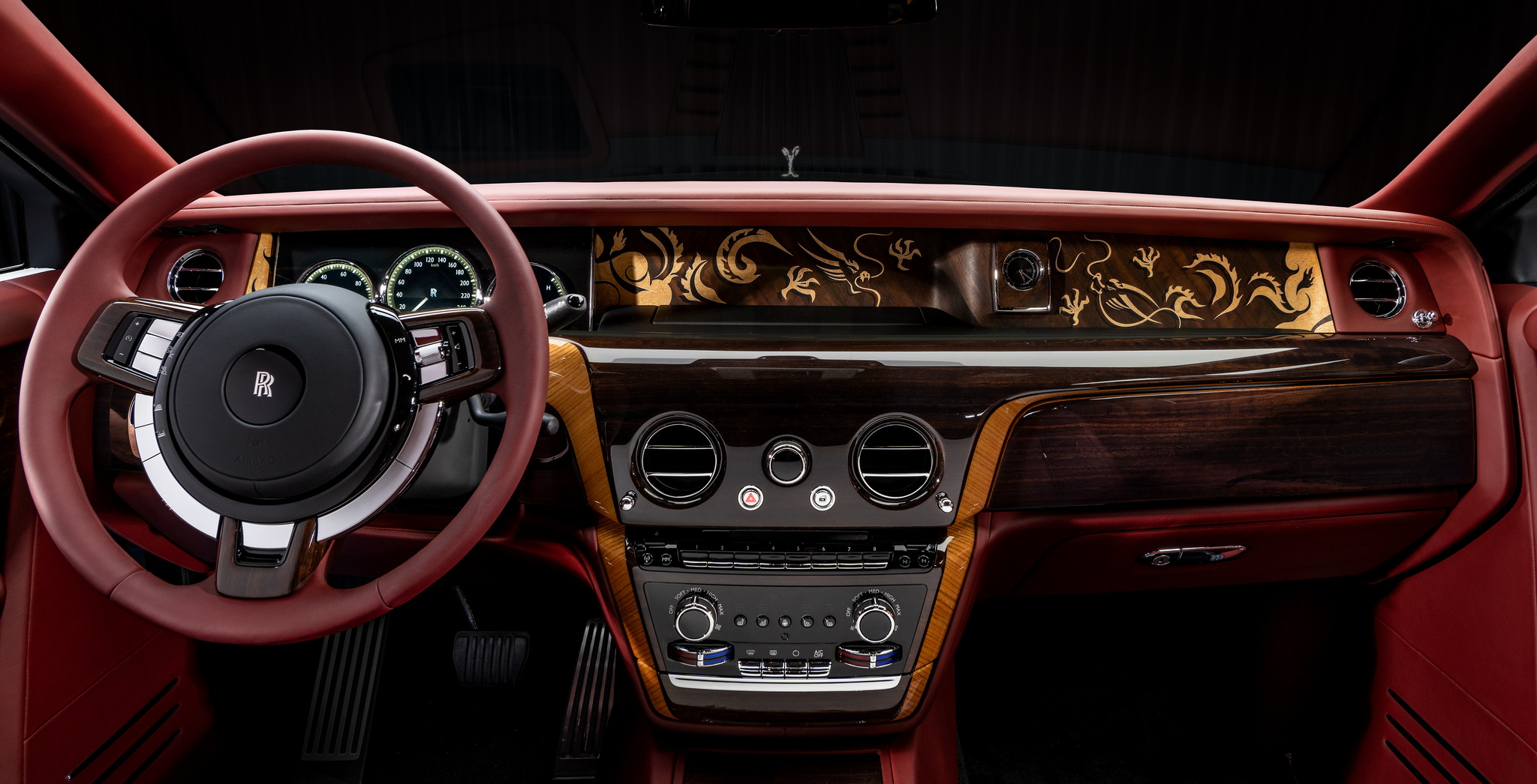 ภายนอกมากับสีตัวถังดำด้าน Iced Diamond Black ห้องโดยสารหุ้มด้วยหนังสีแดง Ardent Red และหนังสีดำ บนแผงคอนโซลหน้าที่เรียกว่า The Gallery คือจุดสำหรับโชว์ผลงานศิลปะ เป็นผลงาน Marquetry (มาร์เก็ตรี) ประกอบด้วยชิ้นส่วนไม้ 297 ชิ้นจากไม้ 4 ชนิด สร้างขึ้นโดยช่างฝีมือจาก Home of Rolls-Royce ใช้เวลาทำ 3 เดือน โดยกระบวนการในการตัดและประกอบแผ่นเวเนียร์ถูกทำด้วยมือทุกขั้นตอน ตัวลวดลายจะเป็นมังกร 2 ตัว ลายล้อมเมฆหมอก กำลังปกป้องไข่มุกที่แสดงออกผ่านนาฬิกา Bespoke พื้นฐานของแผงนี้ทำจากไม้ยูคาลิปตัสรมควัน โดยขอบของรูปทรงต่างๆ ที่มีความกว้างเพียง 0.5 มม. ถูกตัดจากไม้ Sycamore veneer และเติมเต็มด้วยไม้ Ash burr ซึ่งได้รับการคัดสรรลายไม้ที่เลียนแบบพื้นผิวของเมฆ เพื่อเพิ่มมิติมากขึ้นลวดลายมังกรจะมีการใช้ไม้ Bolivar สีดำเงา ทำให้มังกรดูเหมือนลอยอยู่