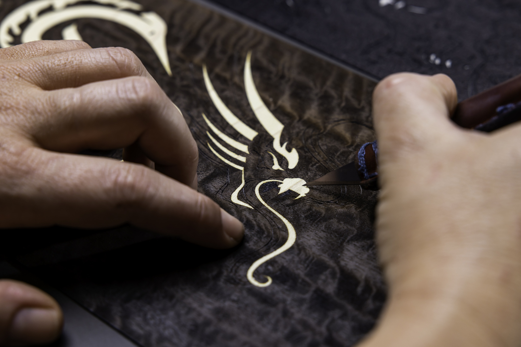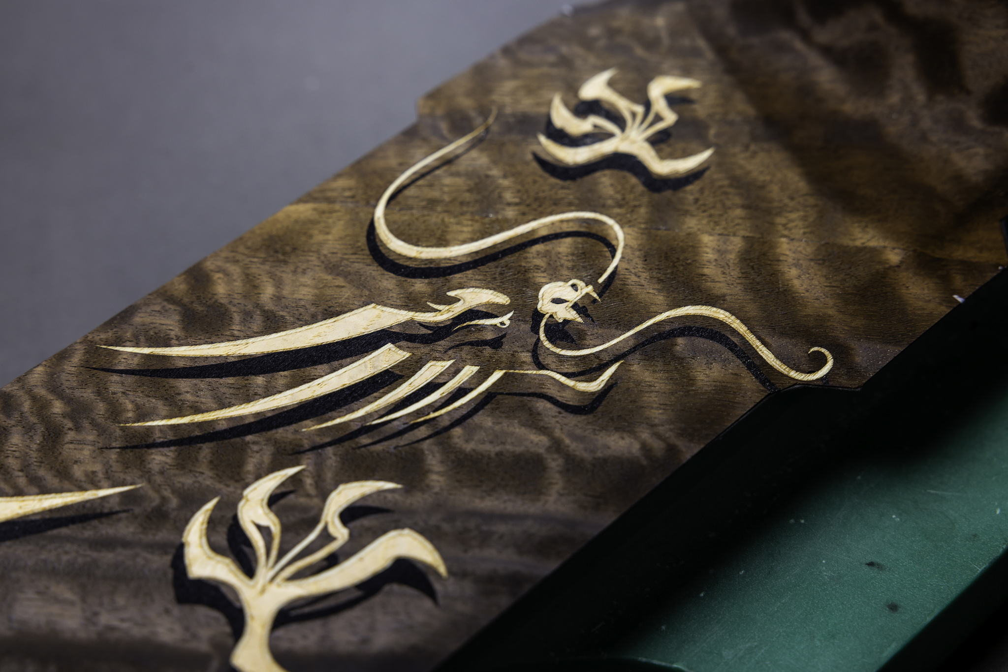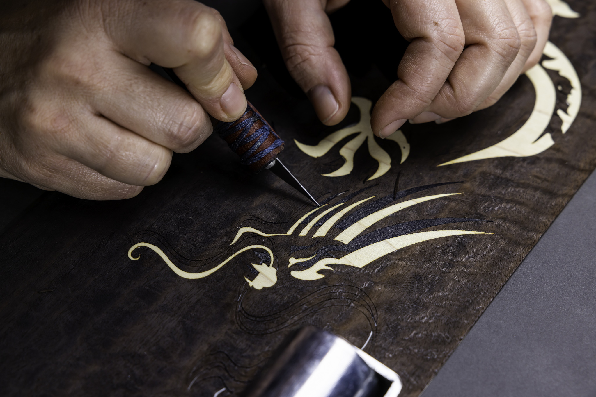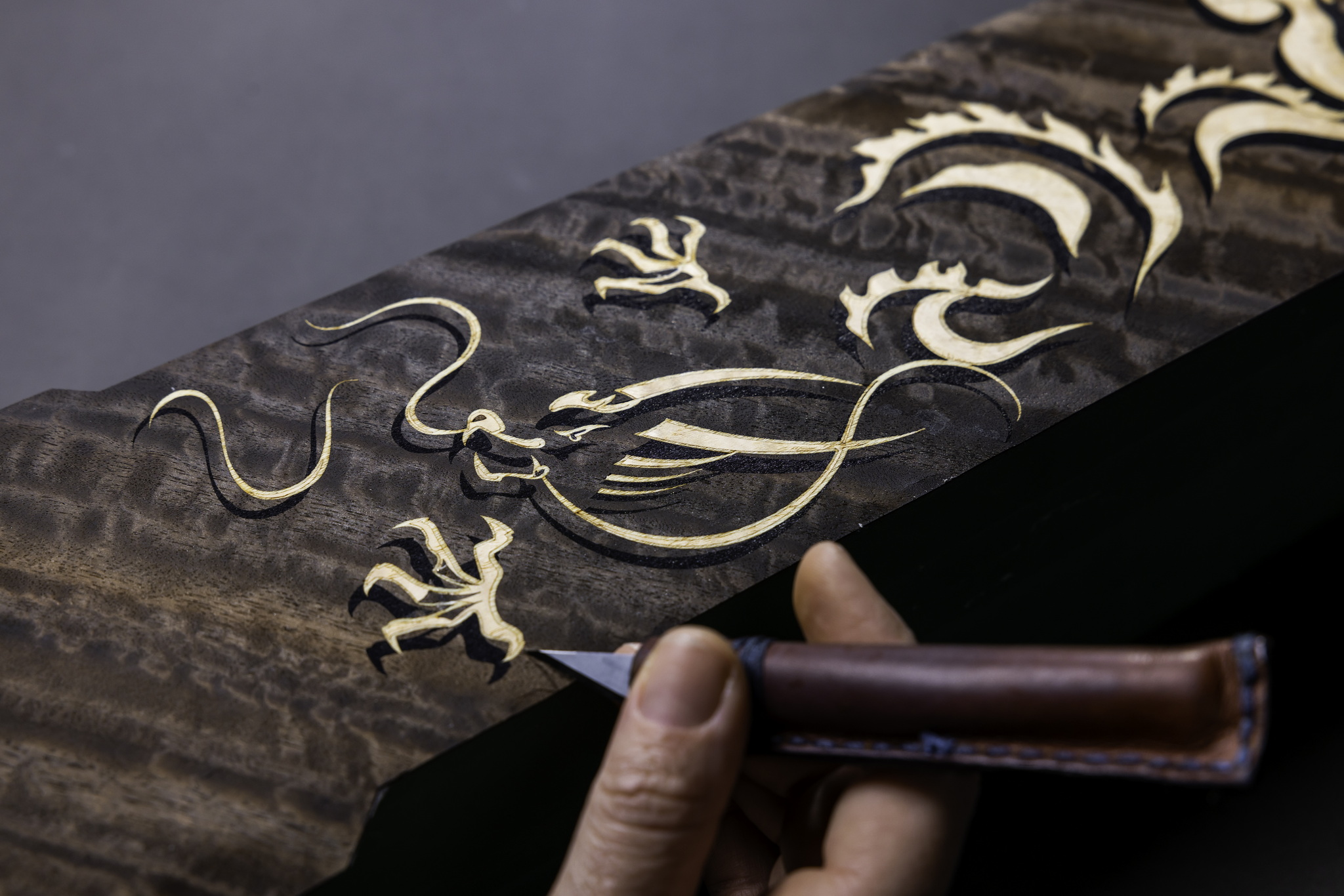ภายนอกมากับสีตัวถังดำด้าน Iced Diamond Black ห้องโดยสารหุ้มด้วยหนังสีแดง Ardent Red และหนังสีดำ บนแผงคอนโซลหน้าที่เรียกว่า The Gallery คือจุดสำหรับโชว์ผลงานศิลปะ เป็นผลงาน Marquetry (มาร์เก็ตรี) ประกอบด้วยชิ้นส่วนไม้ 297 ชิ้นจากไม้ 4 ชนิด สร้างขึ้นโดยช่างฝีมือจาก Home of Rolls-Royce ใช้เวลาทำ 3 เดือน โดยกระบวนการในการตัดและประกอบแผ่นเวเนียร์ถูกทำด้วยมือทุกขั้นตอน ตัวลวดลายจะเป็นมังกร 2 ตัว ลายล้อมเมฆหมอก กำลังปกป้องไข่มุกที่แสดงออกผ่านนาฬิกา Bespoke พื้นฐานของแผงนี้ทำจากไม้ยูคาลิปตัสรมควัน โดยขอบของรูปทรงต่างๆ ที่มีความกว้างเพียง 0.5 มม. ถูกตัดจากไม้ Sycamore veneer และเติมเต็มด้วยไม้ Ash burr ซึ่งได้รับการคัดสรรลายไม้ที่เลียนแบบพื้นผิวของเมฆ เพื่อเพิ่มมิติมากขึ้นลวดลายมังกรจะมีการใช้ไม้ Bolivar สีดำเงา ทำให้มังกรดูเหมือนลอยอยู่