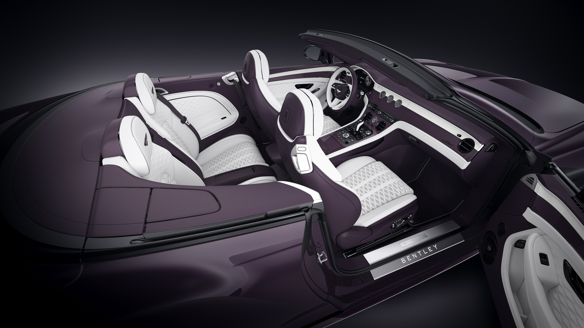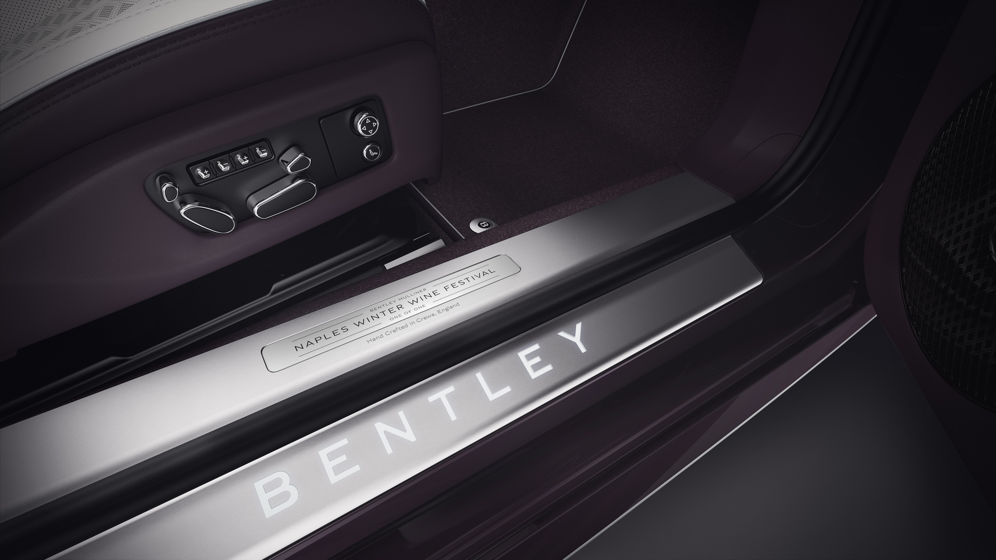 Continental GTC Speed คันนี้สร้างขึ้นหนึ่งเดียว ออกแบบพิเศษสำหรับงาน Naples Winter Wine Festival โดยเฉพาะ เรียบหรูด้วยตัวถังสีม่วง Damson หลังคาผ้าใบสีเทาเข้ม Dark Grey Metallic ขณะที่หลังคาภายในใช้สีเทาอ่อน Light Grey พวกชิ้นส่วนโครเมียมรอบคัน แผงช่องลม มือจับประตู จะเป็นสีดำเงาดุดัน ห้องโดยสารมาแบบทูโทนใช้สีขาวตัดกับสีม่วง Damson งานเดินด้ายใช้สีเงิน แผงไม้วีเนียร์คอนโซลหน้าเป็นแบบผิวเคลือบเงาสีขาว-ม่วงตัดด้วยแถบโครเมียมเงา ชิ้นส่วนโครเมียมในห้องโดยสารจะเป็นสีดำ Dark Chrome กาบบันไดบ่งบอกความพิเศษด้วยอักษร Naples Winter Wine Festival