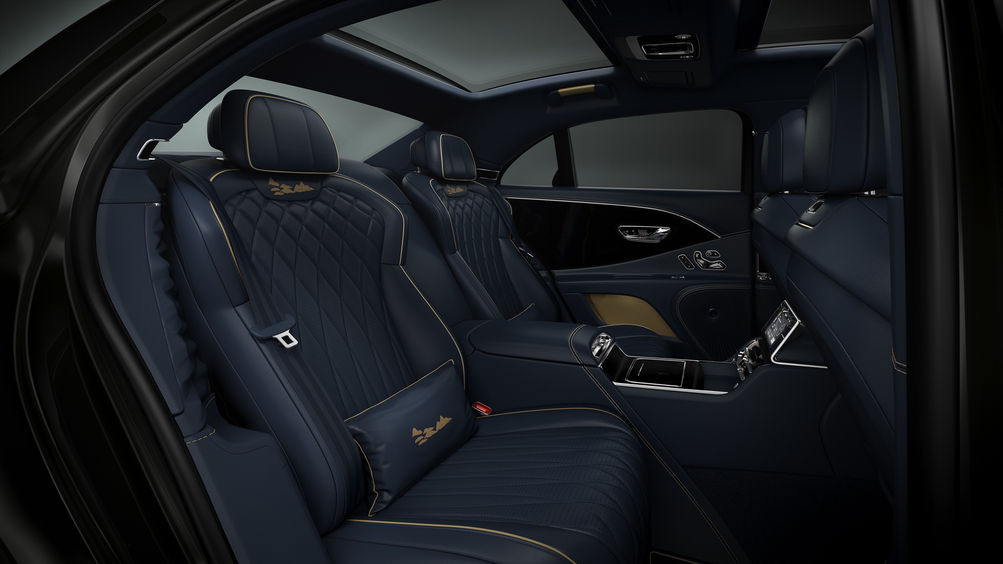 อีกหนึ่งรุ่นที่งดงามไม่แพ้กันของคอลเลกชันนี้คือ Flying Spur Azure ซึ่งได้รับแรงบันดาลใจจากหนึ่งในผลงานศิลปะที่มีชื่อเสียงของจีน A Thousand Miles of Rivers and Mountains โดย Wang Ximeng ภาพวาดภูมิทัศน์ขนาดใหญ่ที่มีชื่อเสียงจากยุคราชวงศ์ซ่งนี้เต็มไปด้วยสีฟ้า เขียว และทอง ซึ่งเป็นแนวทางหลักในการออกแบบภายในห้องโดยสารที่เน้นสีฟ้าสุดพิเศษที่มีการปักและรายละเอียดที่สื่อถึงทิวทัศน์ที่สงบและยิ่งใหญ่ของภาพวาด