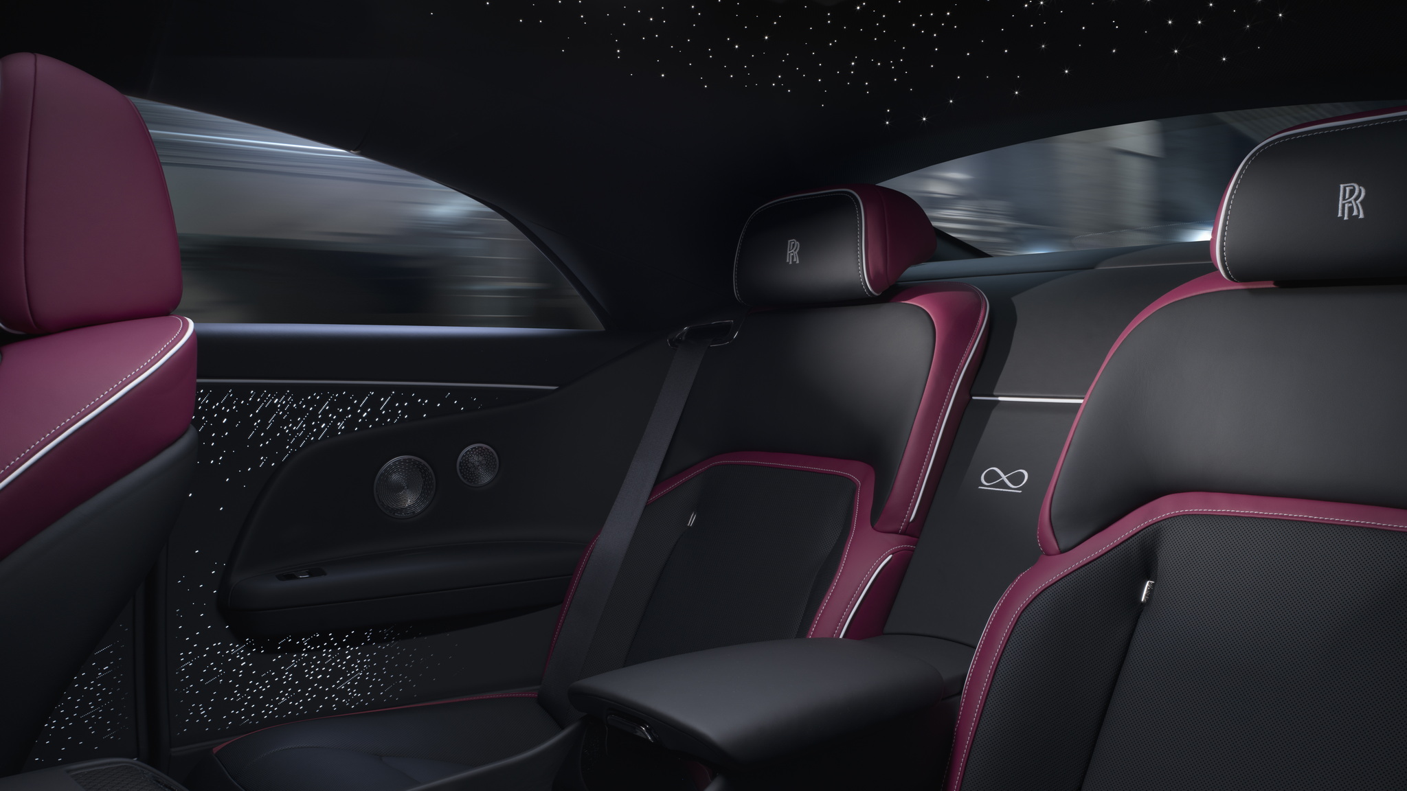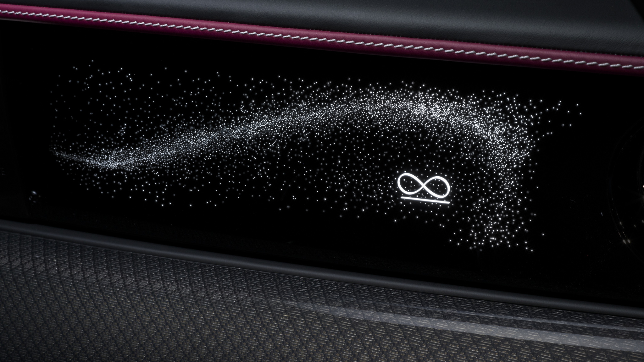 ห้องโดยสารมากับมาตรวัดคนขับสามารถเลือกธีมสีได้ 5 ธีม ได้แก่ Vivid Grellow, Neon Nights, Cyan Fire, Ultraviolet และ Synth Wave แผงคอนโซลหน้าเรืองแสงด้วยดวงดาวกว่า 5,500 ดวง พร้อมโลโก้อินฟินิตี้ และงานตกแต่งด้วยวัสดุ Technical Fiber ที่มีฐานไม้โบลิวาร์สีดำที่ด้านบนมีการทอเป็นรูปสี่เหลี่ยมขนมเปียกปูน ซึ่งประกอบด้วยคาร์บอนไฟเบอร์และโลหะแบบละเอียด