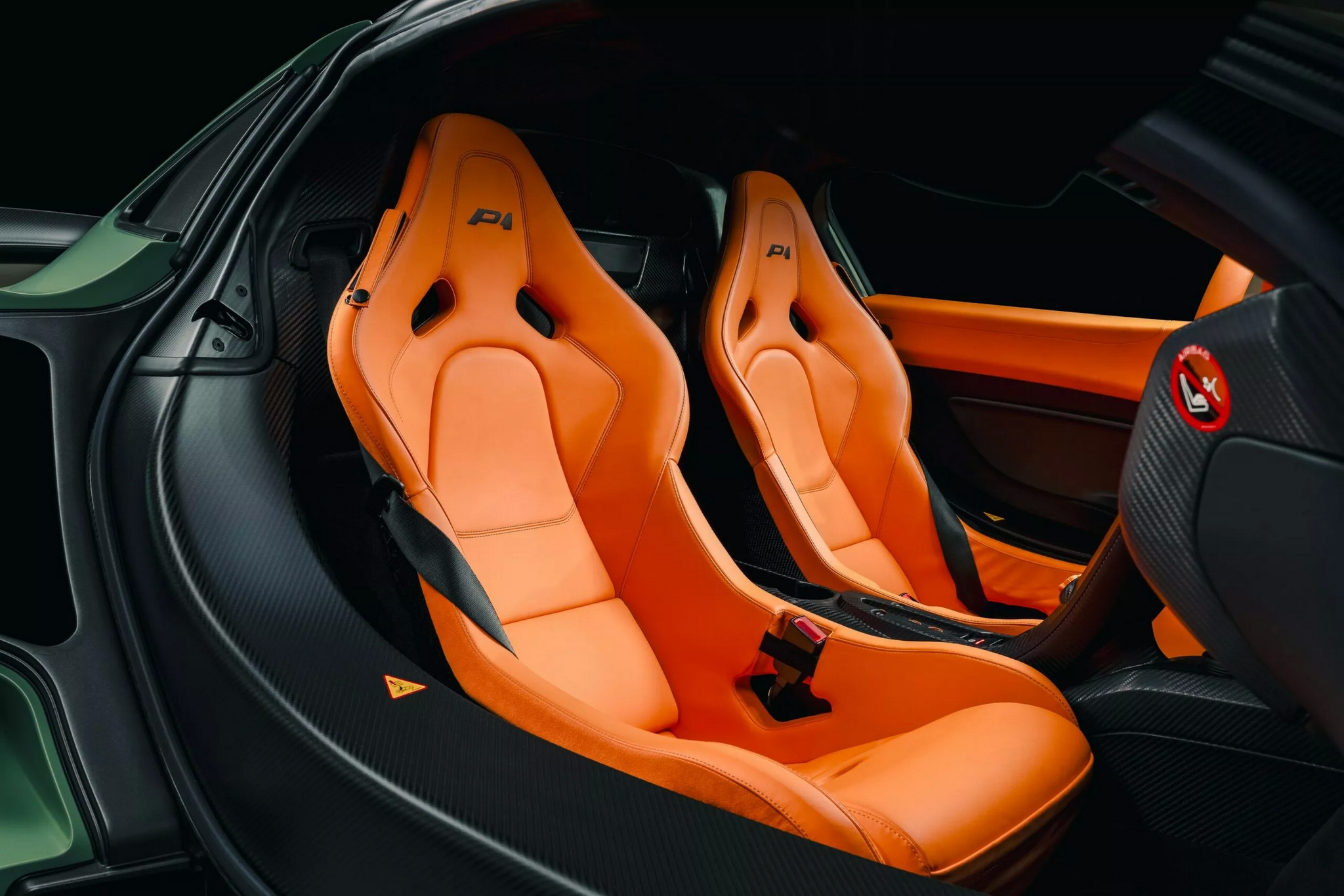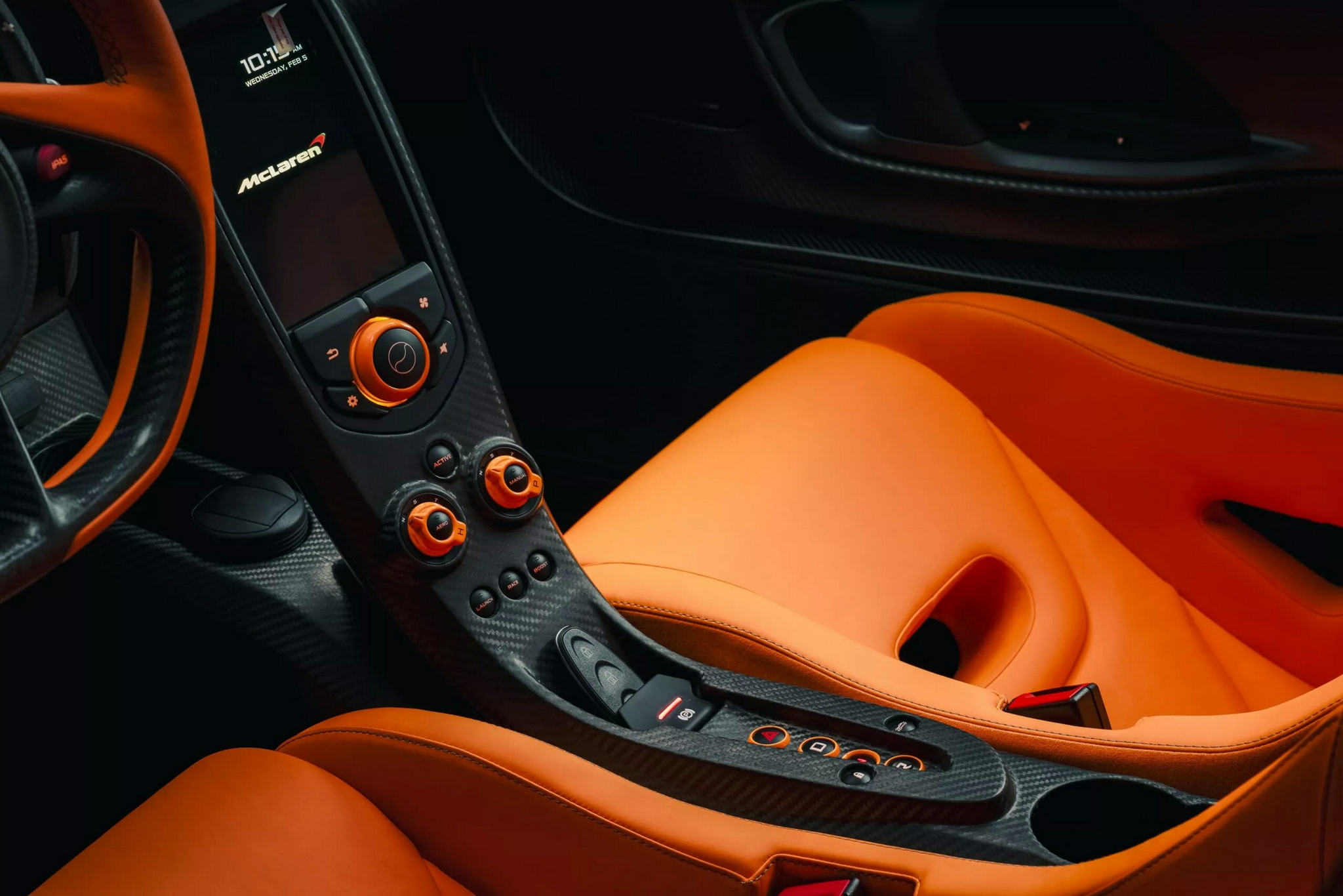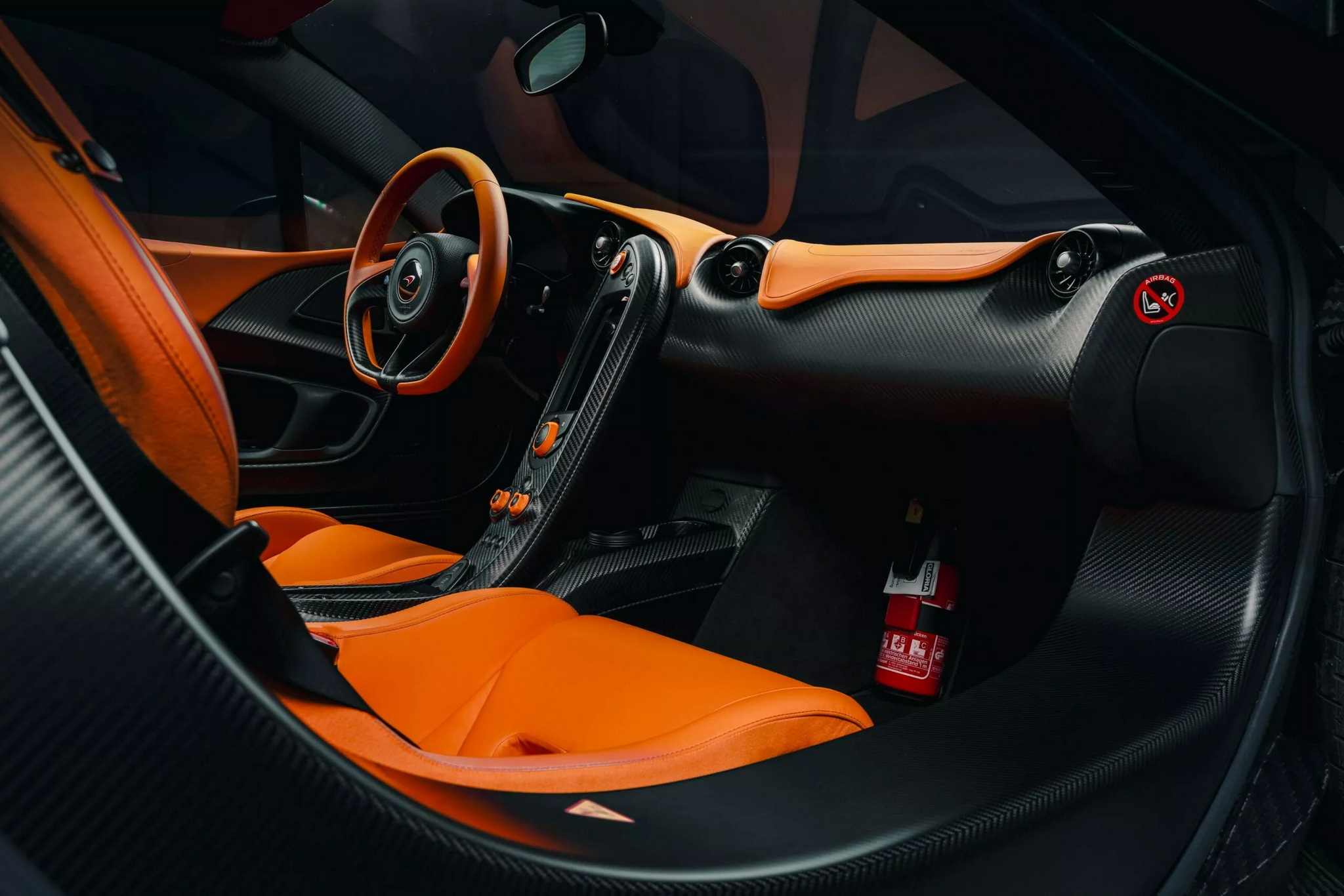 สีส้ม McLaren Orange ยังต่อเนื่องไปถึงห้องโดยสาร เบาะหนังมีการเย็บตะเข็บสีดำตัดกับสีเบาะพร้อมโลโก้ P1 ปักบนพนักศีรษะ แผงแดชบอร์ดด้านบนและพวงมาลัยก็ใช้สีส้ม McLaren Orange แม้แต่สวิตช์ปุ่มต่างๆ ก็ใช้สีส้ม McLaren Orange ซึ่งสีนี้ก็ตัดเข้ากับวัสดุคาร์บอนไฟเบอร์โดยรอบได้อย่างดี