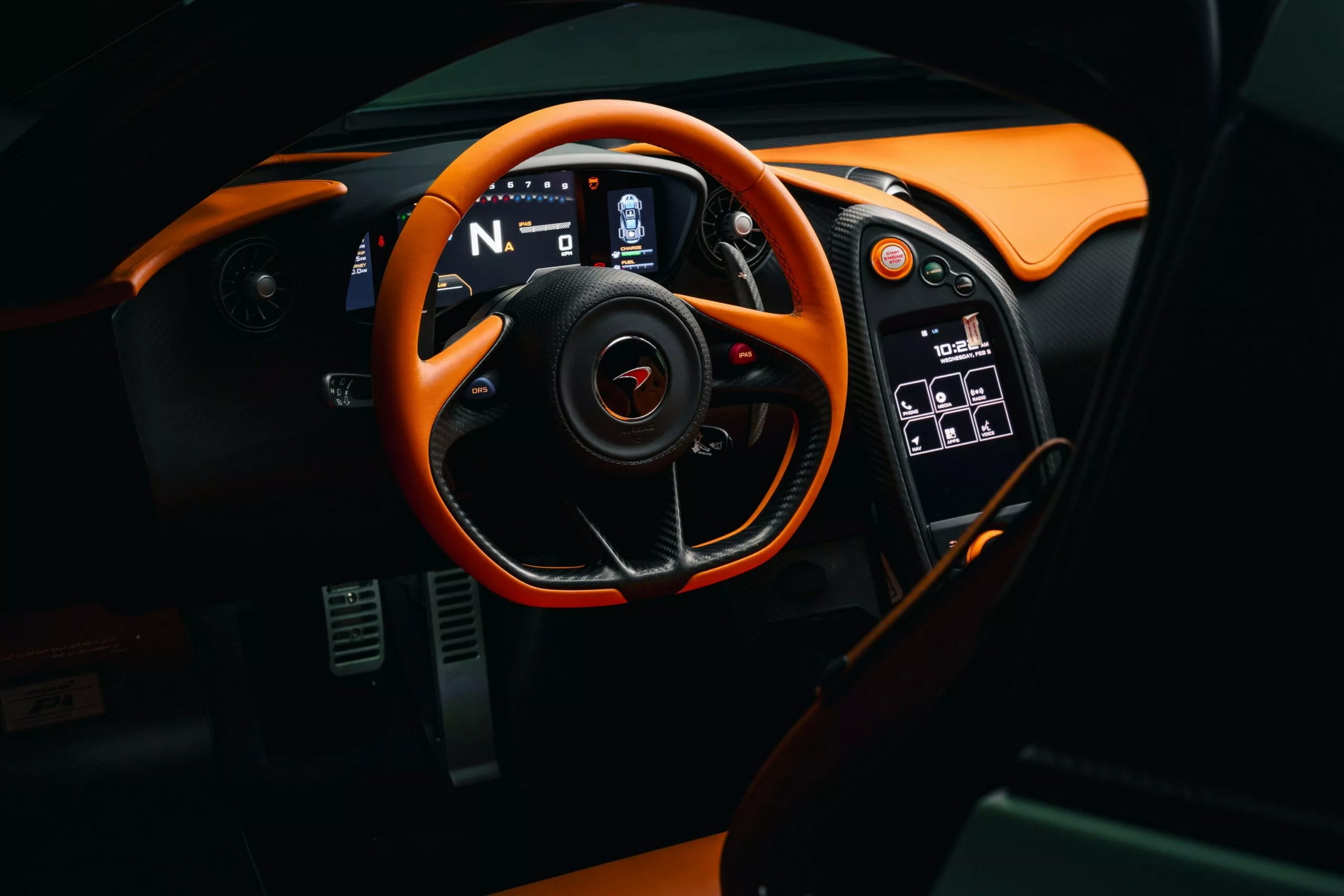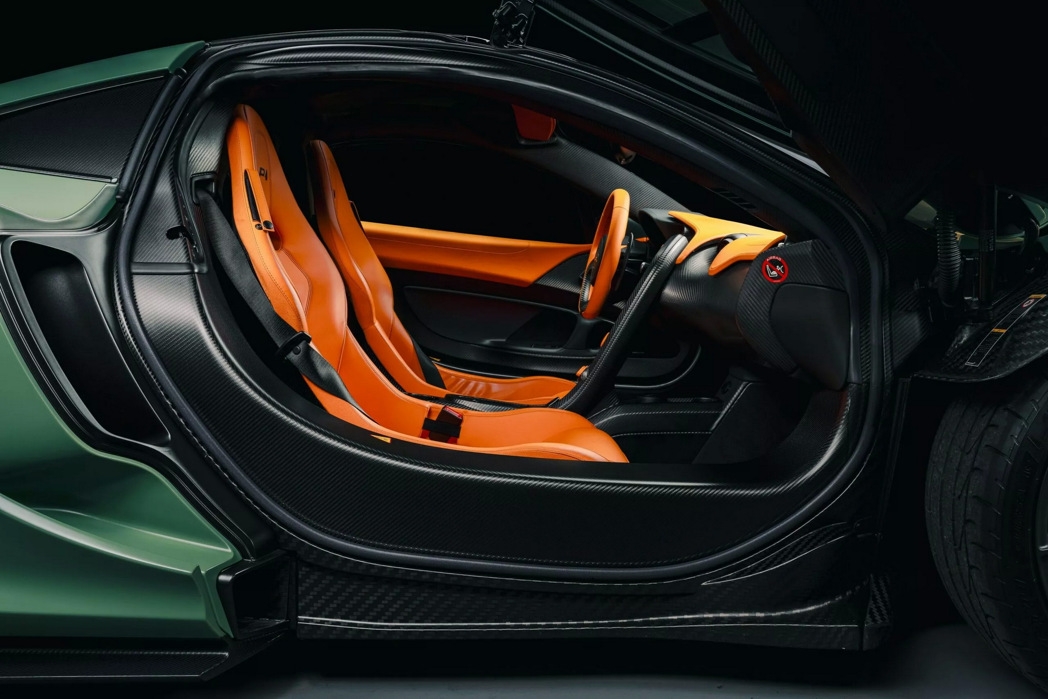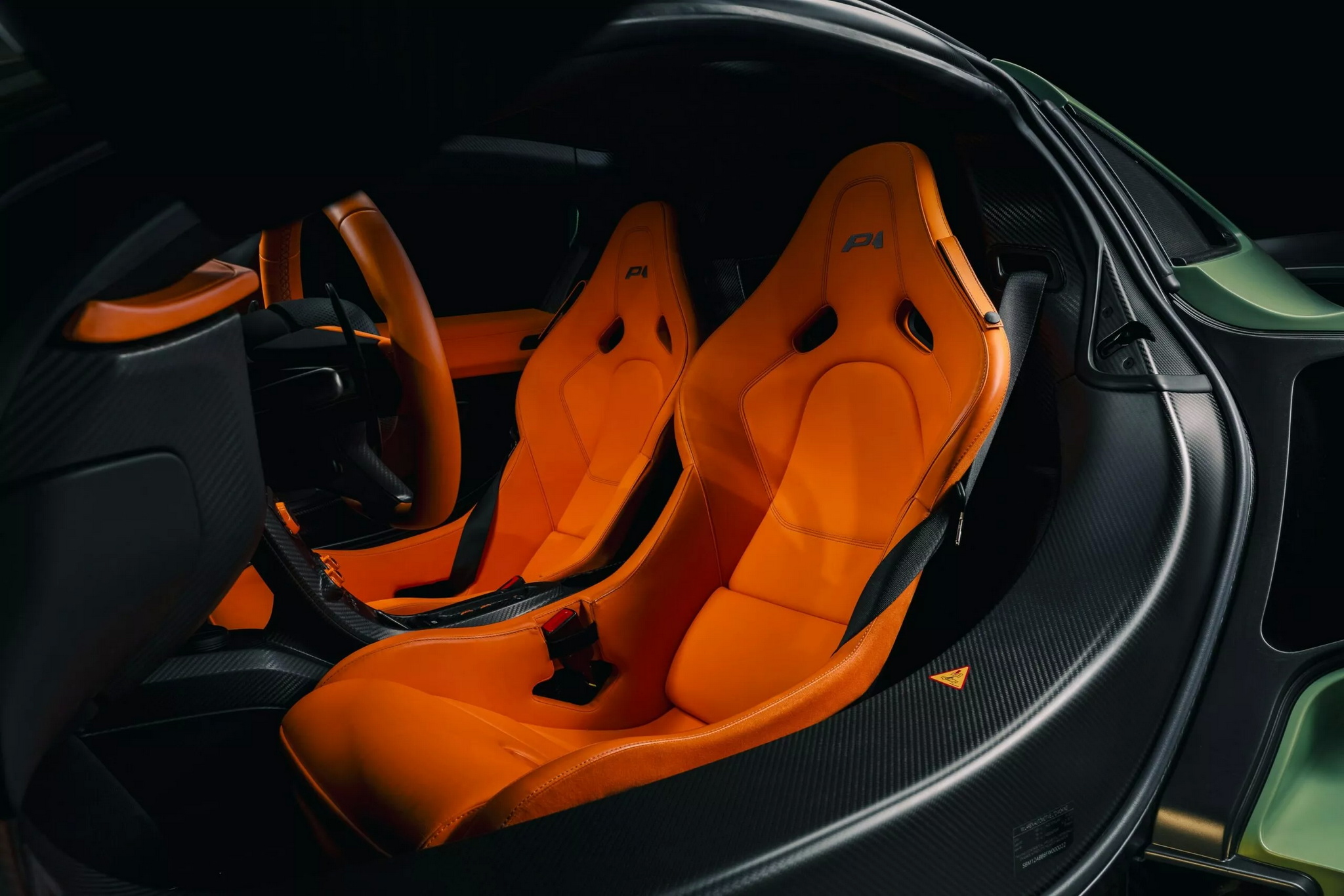 สีส้ม McLaren Orange ยังต่อเนื่องไปถึงห้องโดยสาร เบาะหนังมีการเย็บตะเข็บสีดำตัดกับสีเบาะพร้อมโลโก้ P1 ปักบนพนักศีรษะ แผงแดชบอร์ดด้านบนและพวงมาลัยก็ใช้สีส้ม McLaren Orange แม้แต่สวิตช์ปุ่มต่างๆ ก็ใช้สีส้ม McLaren Orange ซึ่งสีนี้ก็ตัดเข้ากับวัสดุคาร์บอนไฟเบอร์โดยรอบได้อย่างดี