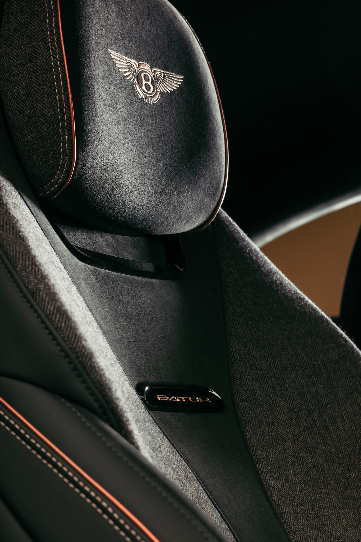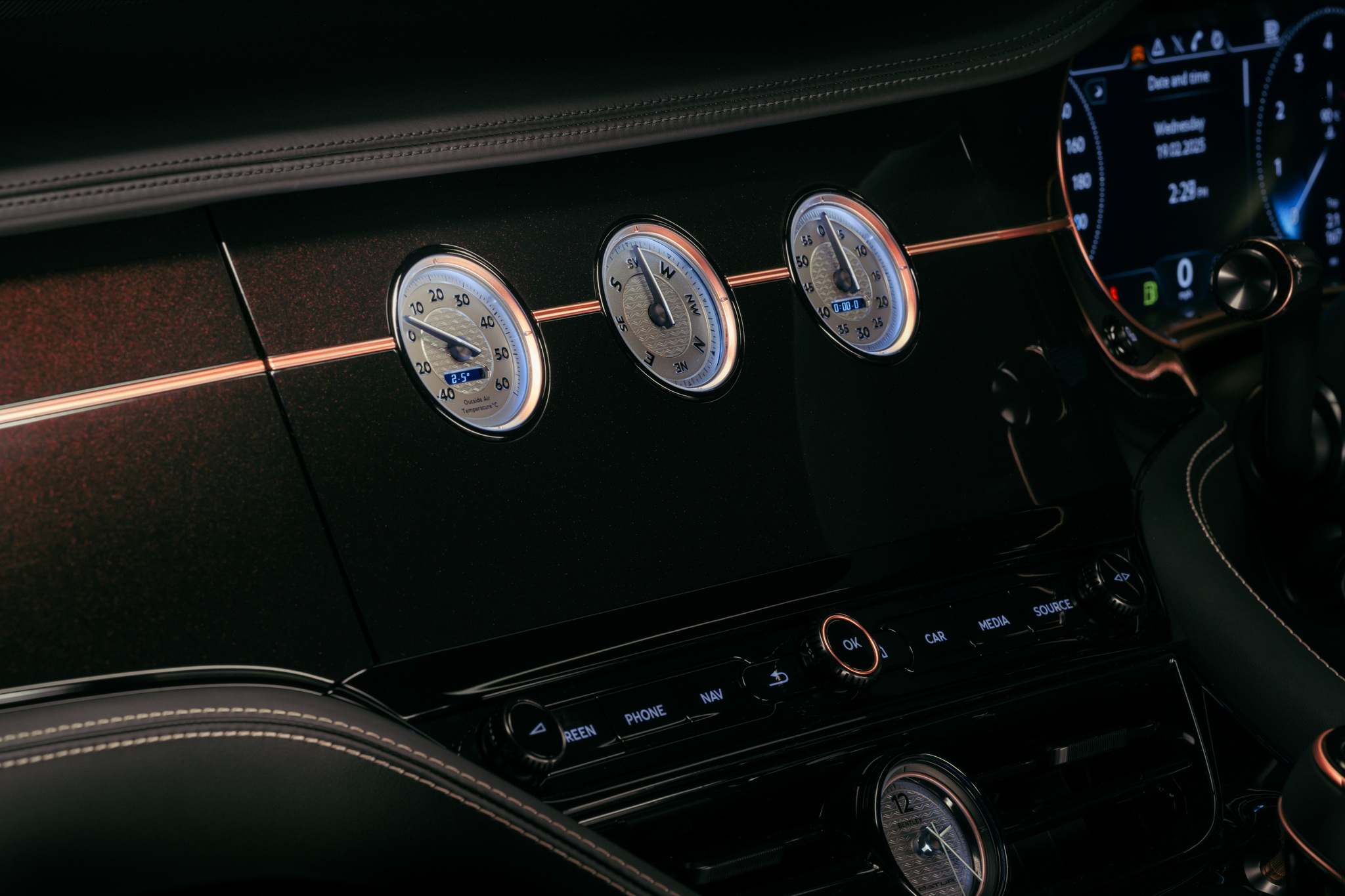 ห้องโดยสารก็หรูหราจัดเต็ม บรรยากาศสอดรับกับภายนอก แผงคอนโซลหน้าใช้สีเมทัลลิก Black Rose เบาะนั่งหุ้มหนังสีดำ Beluga สลับกับผ้าทวีดสีเทา charcoal grey และหนึ่งในจุดเด่นคือการใช้ทองคำ Rose Gold 18 กะรัตที่พิมพ์ 3 มิติ เป็นครั้งแรกของ Bentley โดยจะนำมาตกแต่งในจุดต่างๆ เช่น ปุ่มทรงกลมเลือกโหมดการขับขี่ และก้านเปิด-ปิดช่องแอร์ organ stop พวงมาลัยยังสอดแทรกด้วยสี Rose Gold บ่งบอกถึงรายละเอียดที่ยอดเยี่ยม