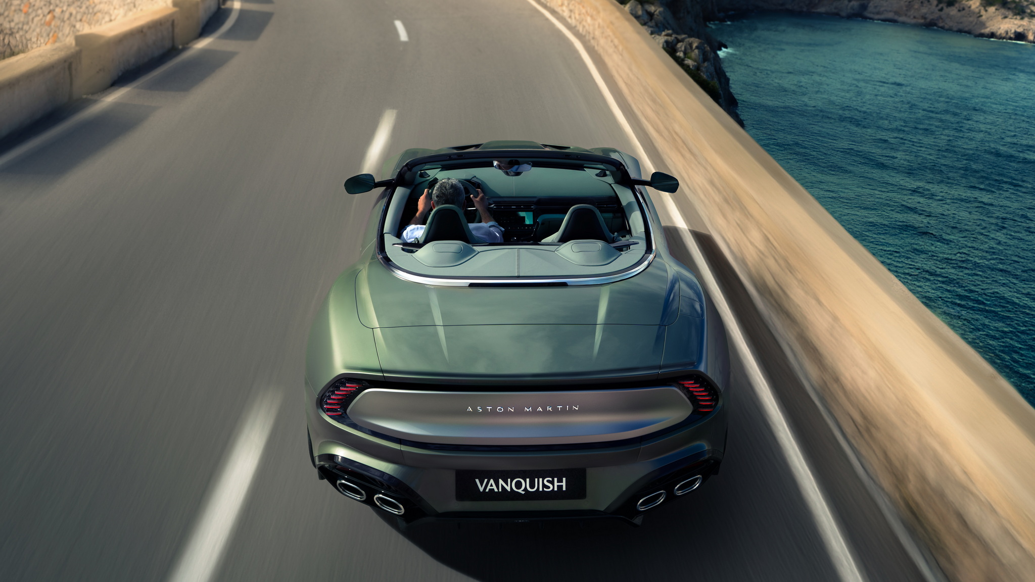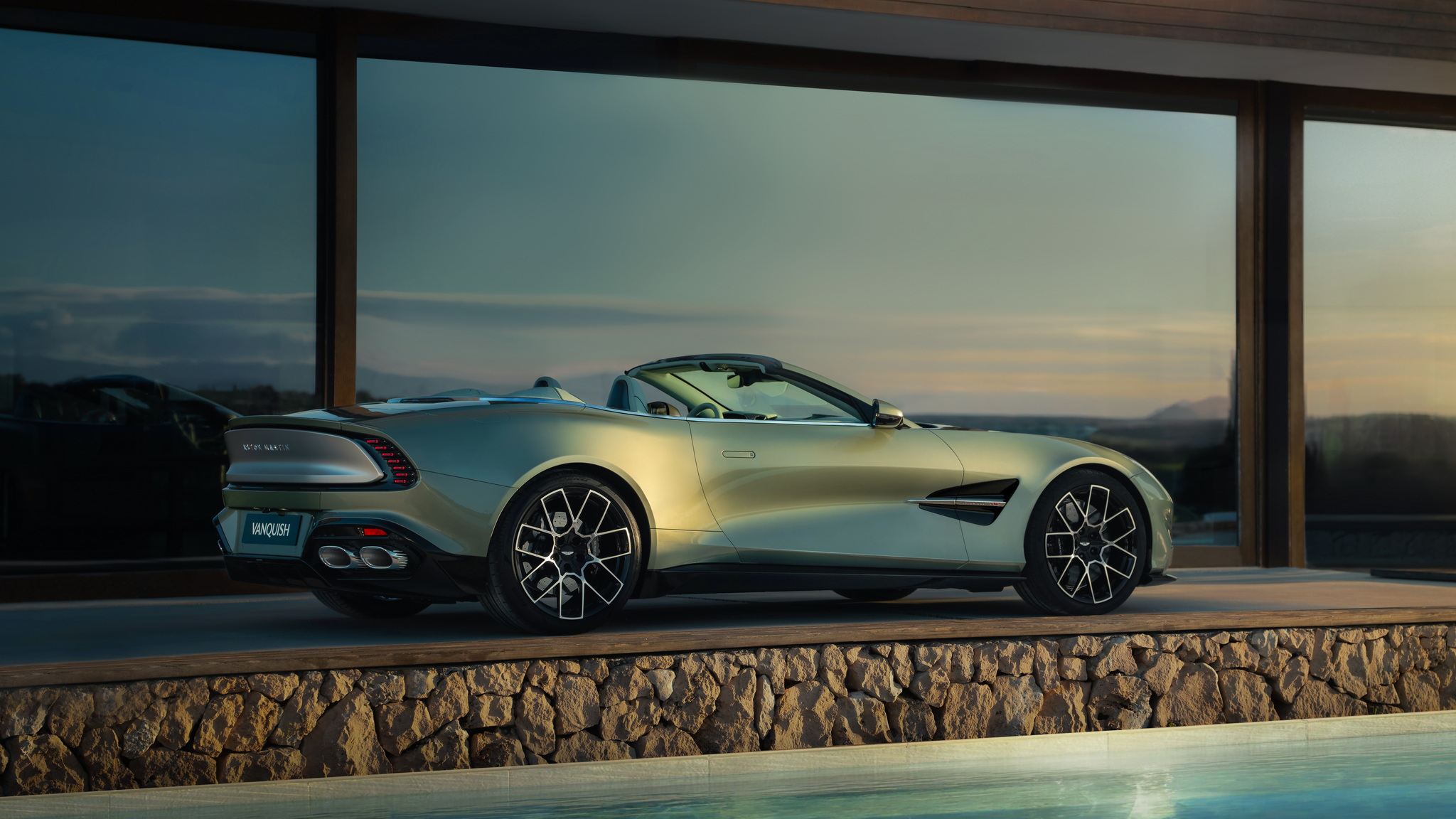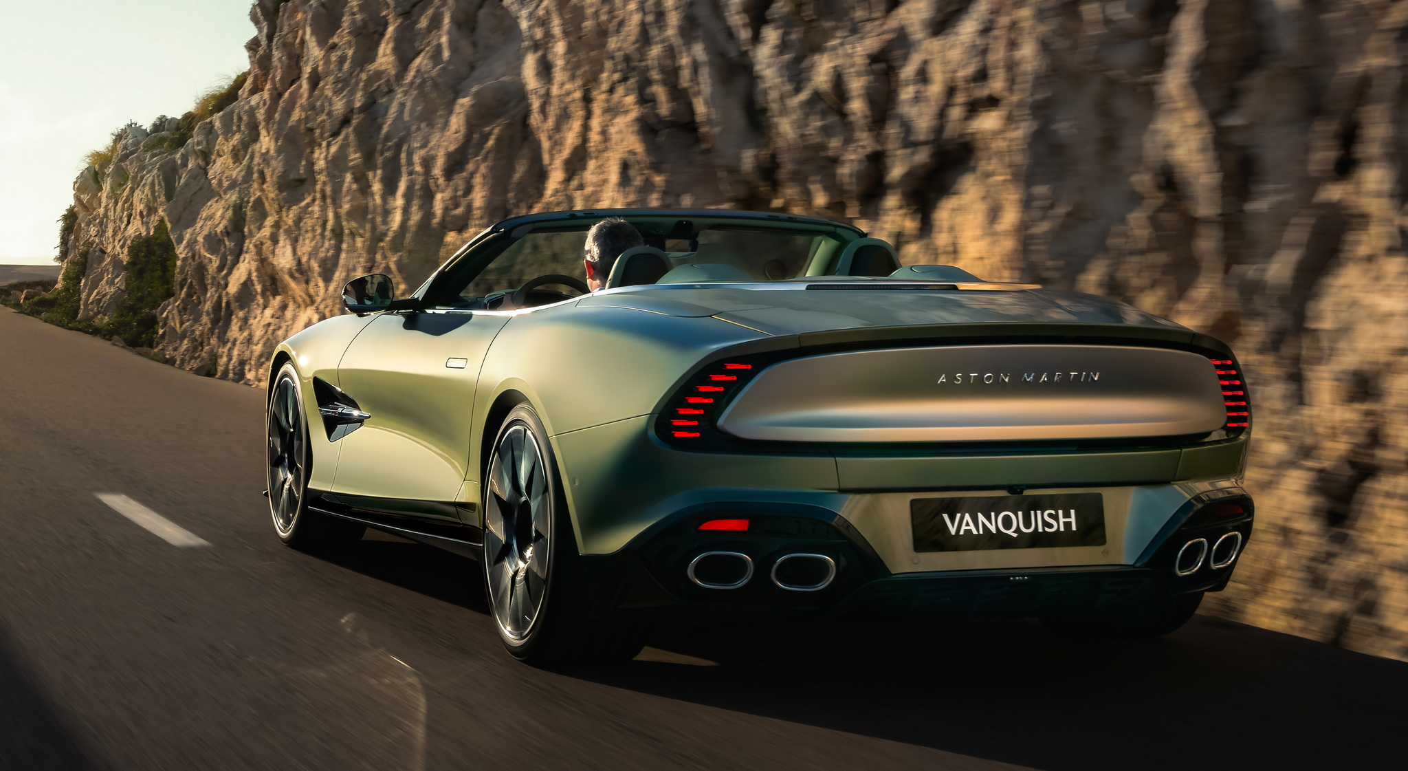 Vanquish Volante เปิดประทุนรุ่นเรือธงล่าสุด ที่ตอนนี้ถือเป็นรถเปิดประทุนเครื่องวางหน้า (Front-engine) ที่เร็วและทรงพลังที่สุดในโลก ตัวรถพัฒนาบนพื้นฐานเดียวกับ Vanquish เวอร์ชั่น Coupe สง่างามด้วยหลังคาผ้าใบ K-fold น้ำหนักเบา เปิดและปิดได้รวดเร็วใน 14 วินาที ทำงานได้ขณะรถวิ่งที่ความเร็วสูงสุด 50 กม./ชม. และเปิดประทุนได้ผ่านรีโมทในรัศมี 2 เมตรจากตัวรถ หลังคาผ้าใบถูกติดตั้งฉนวนหลายชั้นทำให้เรื่องความร้อนและเสียงรบกวนทำได้เยี่ยมเช่นเดียวกับรุ่น Coupe แม้กลไกหลังคาจะทำให้รถหนักขึ้นแต่ก็เพิ่มเพียง 95 กิโลกรัม เท่านั้น