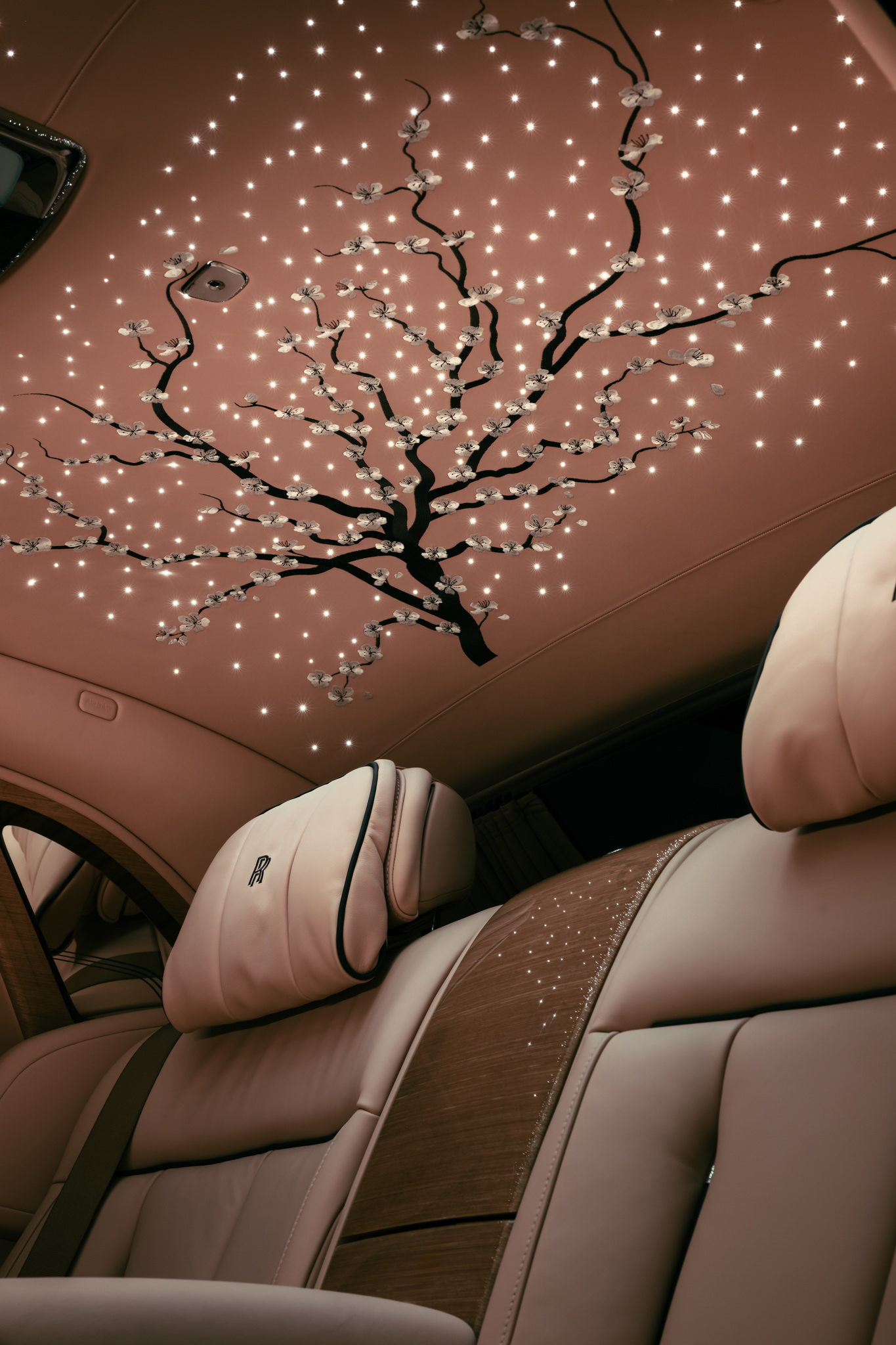 ห้องโดยสารงดงามด้วยหลังคา Starlight ทำพิเศษ เย็บปักถักร้อยเป็นต้นซากุระขนาดใหญ่พร้อมดอกเบ่งบานตามกิ่งก้านรายล้อมด้วยดวงดาวมากมาย ผลงานนี้สร้างขึ้นด้วยมือด้วยงานเย็บอันละเอียดอ่อนมากกว่า 250,000 จุด เป็นงานเย็บแบบ tatami stitch ที่เป็นเทคนิคการทอผ้าโบราณของญี่ปุ่น และเรายังเห็นกลีบดอกซากุระร่วงโรยไปเกาะตามจุดต่างๆ เช่น แผงประตู ซึ่งเป็นงานปักแบบ 3 มิติ สร้างขึ้นโดยการขึ้นรูปและเย็บเข้าไปในตำแหน่งที่ต้องการ ถือเป็นครั้งแรกของ Rolls-Royce ที่ทำแบบนี้