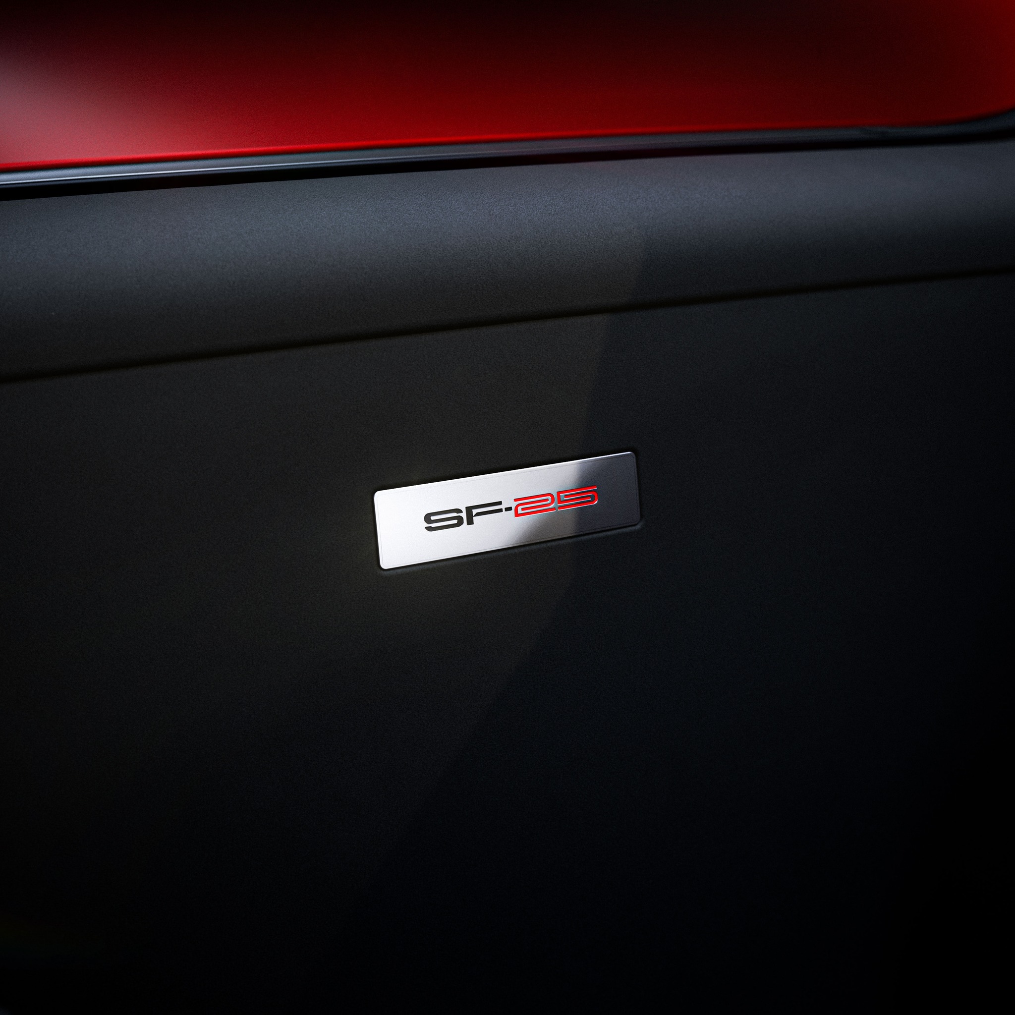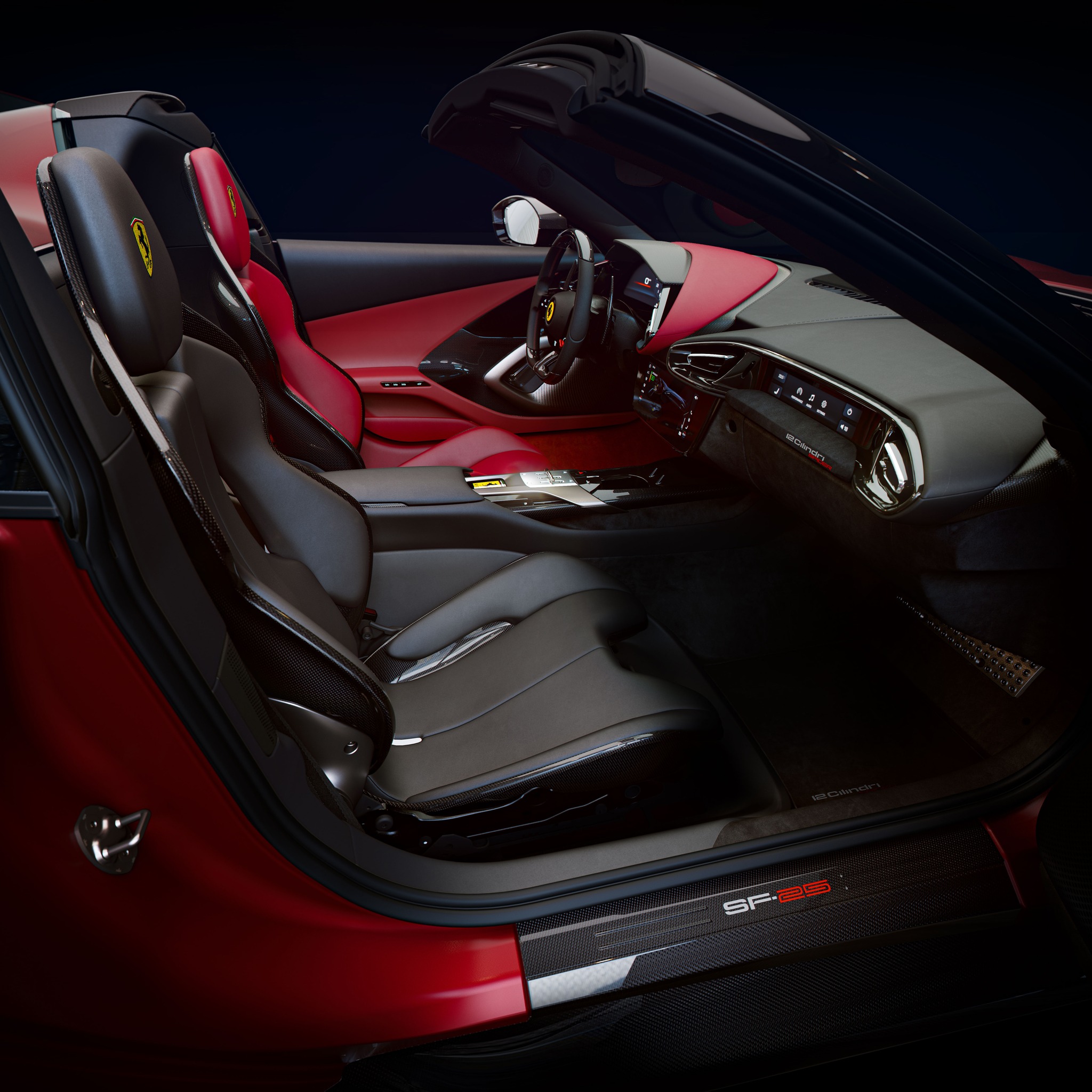 12Cilindri Spider คันที่เราเห็นนี้นอกจากสีใหม่ ยังมีการตกแต่งพิเศษแรงบันดาลใจจากรถแข่ง F1 มีคาดแถบสีขาวข้างตัวรถ พร้อมหมายเลข 25 บนฝากระโปรงหน้า ซึ่งเป็นงานทำสีทั้งหมด ล้อเป็นสีเทาด้านคู่กับคาลิปเปอร์เบรกสีเหลือง ห้องโดยสารให้อารมณ์มอเตอร์สปอร์ต โดยฝั่งคนขับจะใช้วัสดุหนังสีแดงที่เบาะนั่งและบนแผงประตู ส่วนฝั่งผู้โดยสารจะใช้หนังสีดำทั้งตัวเบาะและแผงประตู และกาบบันไดคาร์บอนไฟเบอร์พร้อมโลโก้ SF-25