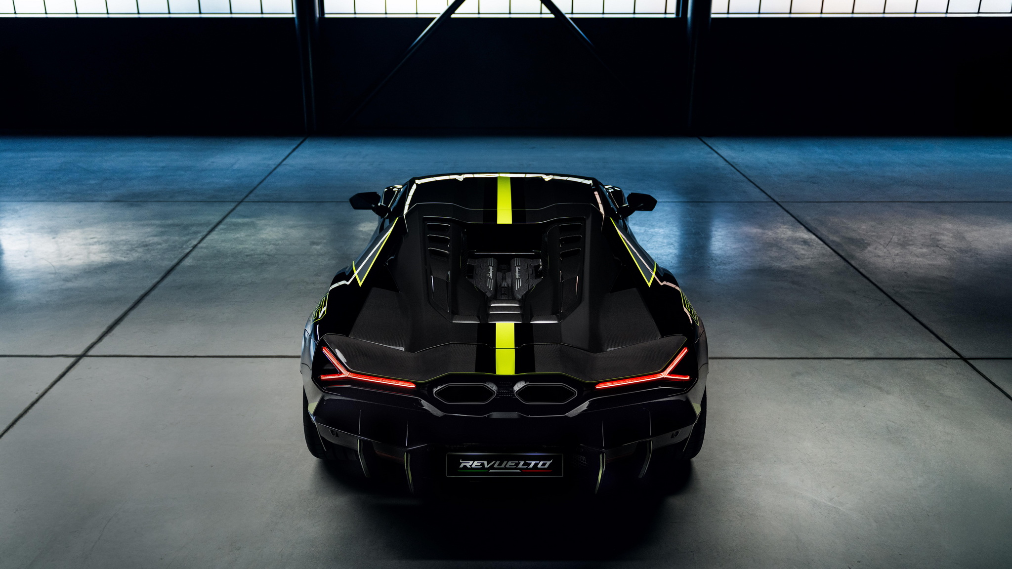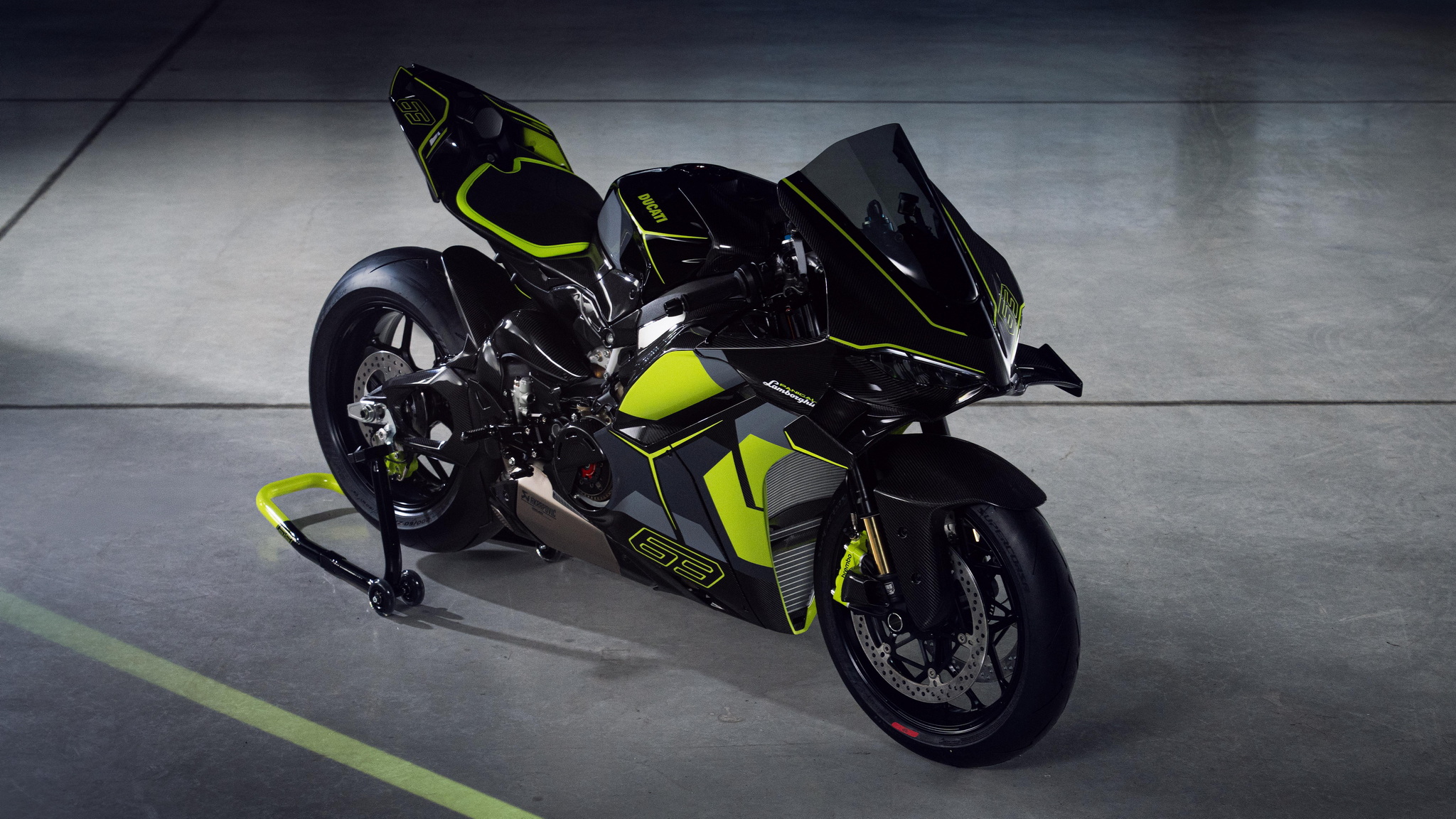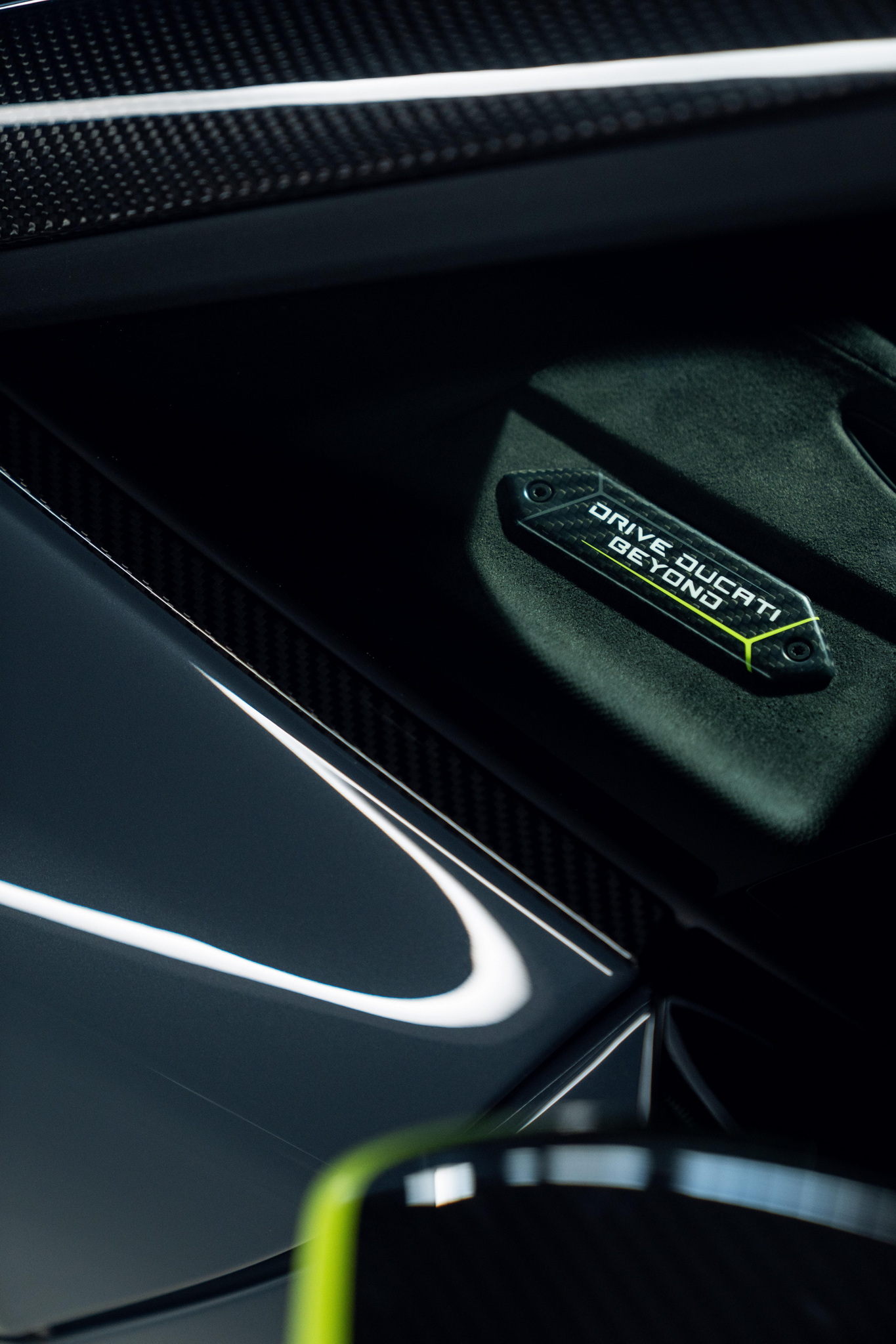 Panigale V4 Lamborghini มากับรูปลักษณ์ดุดันด้วยการใช้คาร์บอนไฟเบอร์เปลือยทั้งหมด ตั้งแต่ เปลือกตัวถัง แผ่นกันความร้อน การ์ดกันส้น และบังโคลนหน้า-หลัง ตัวถังคาร์บอนไฟเบอร์ผสานกับสีเขียว Verde Scandal, เทา Grigio Telesto และเทา Grigio Acheso พร้อมหมายเลข 63 ที่เป็นปีต้นกำเนิดของ Lamborghini ท่อไอเสียไททาเนียมจาก Akrapovič เบาะนั่งก็พิเศษสไตล์เดียวกับห้องโดยสาร Revuelto
