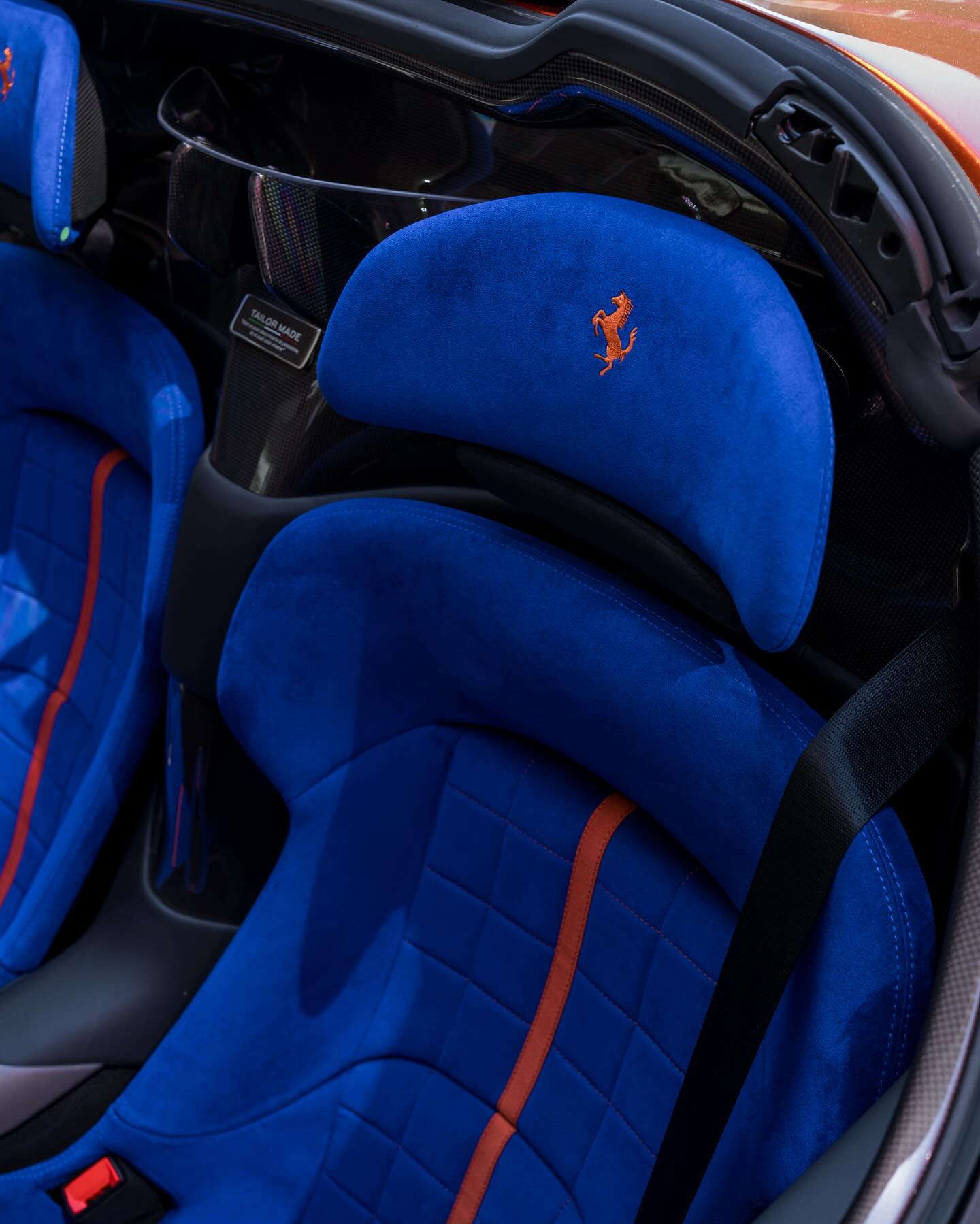 ภายในห้องโดยสารเตะตาด้วยเบาะคาร์บอนไฟเบอร์หุ้ม Alcantara สีน้ำเงินเข้ม มีการเย็บตะเข็บเป็นตารางสี่เหลี่ยมพร้อมโลโก้ม้าลำพองสีส้มบนพนักศรีษะ และที่กึ่งกลางระหว่างคนขับและผู้โดยสารมีการติดแผ่นโลหะสลักพิเศษจาก Tailor Made บ่งบอกถึงความพิเศษไม่เหมือนใคร