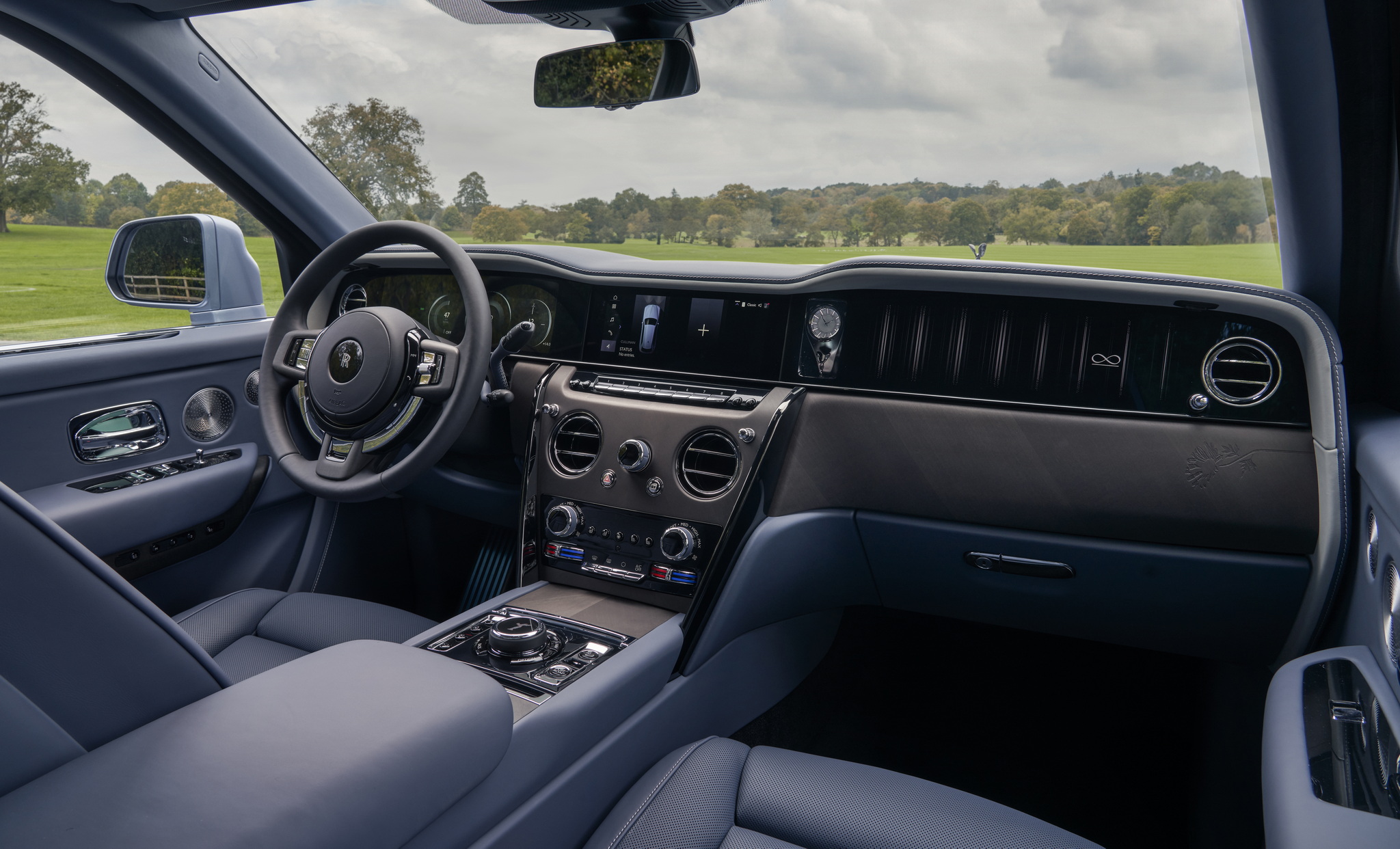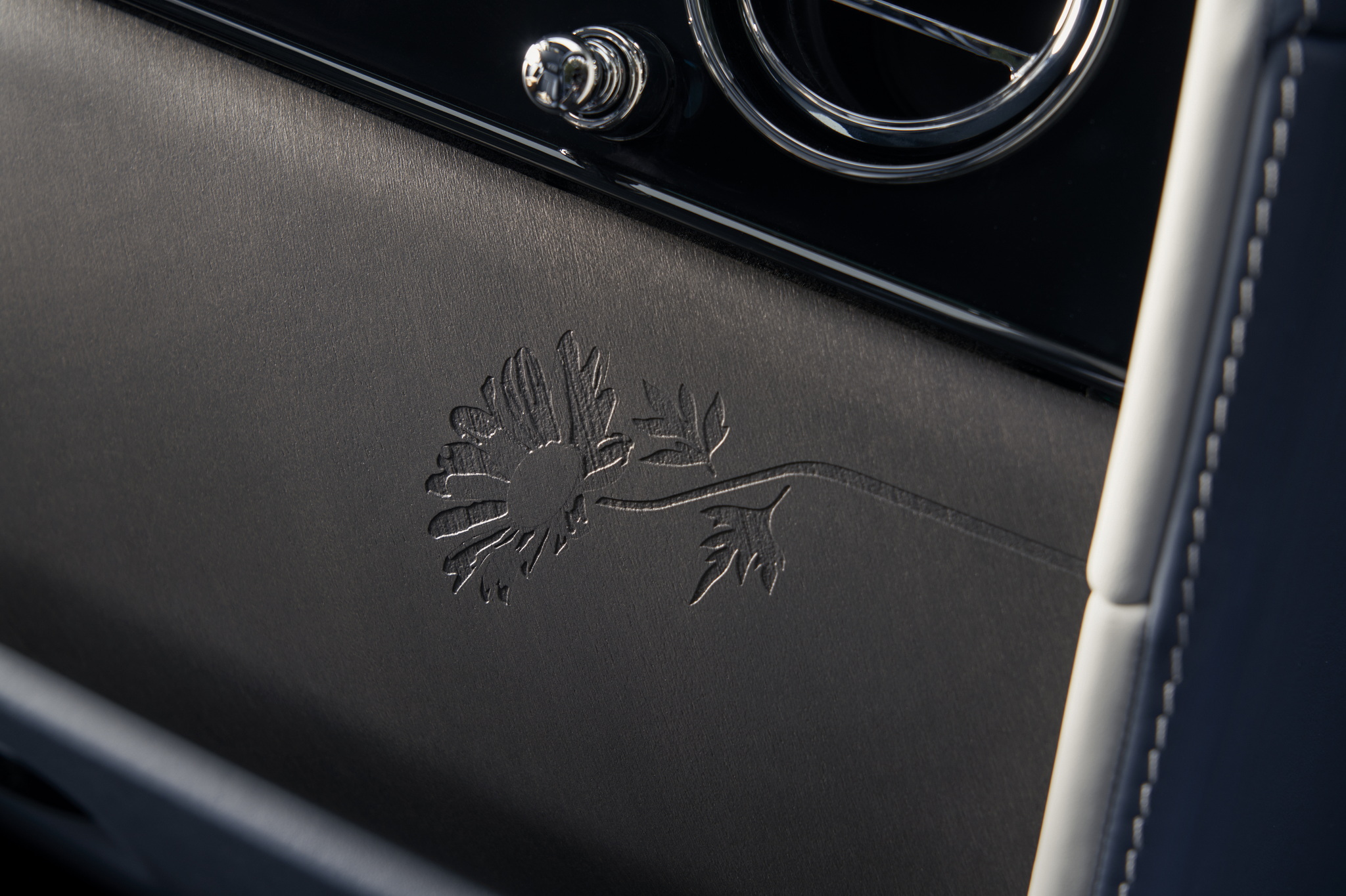 ภายในเน้นด้วยหนังโทนสีน้ำเงินเข้ม Fleet Blue รอบห้องโดยสาร แซมจุดต่างๆ เล็กน้อยด้วยหนังสีเทา Selby Grey และสีดำ ผสานงานตกแต่งไม้วีเนียร์สีดำที่ผ่านเทคนิคการพ่นทรายบนพื้นผิวอย่างละเอียดอ่อน ไม้บริเวณคอนโซลหน้าและกึ่งกลางระหว่างเบาะหลังยังมีการแกะสลักเป็นลายดอกเดซี่อีกด้วย