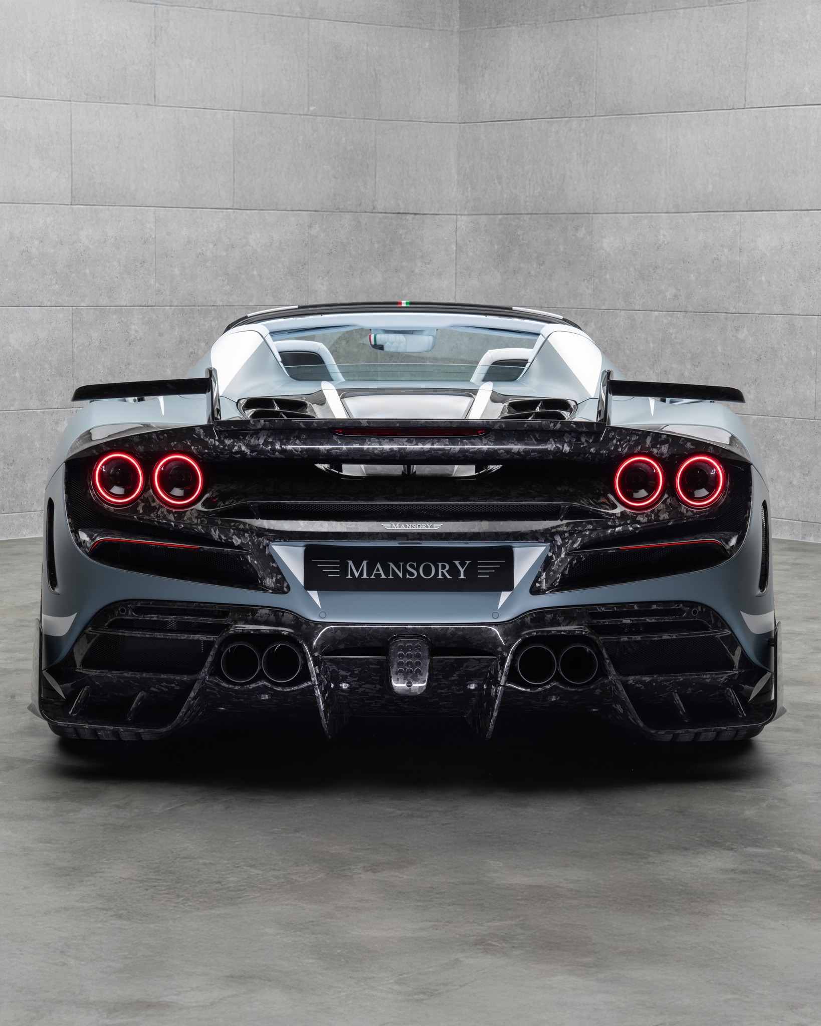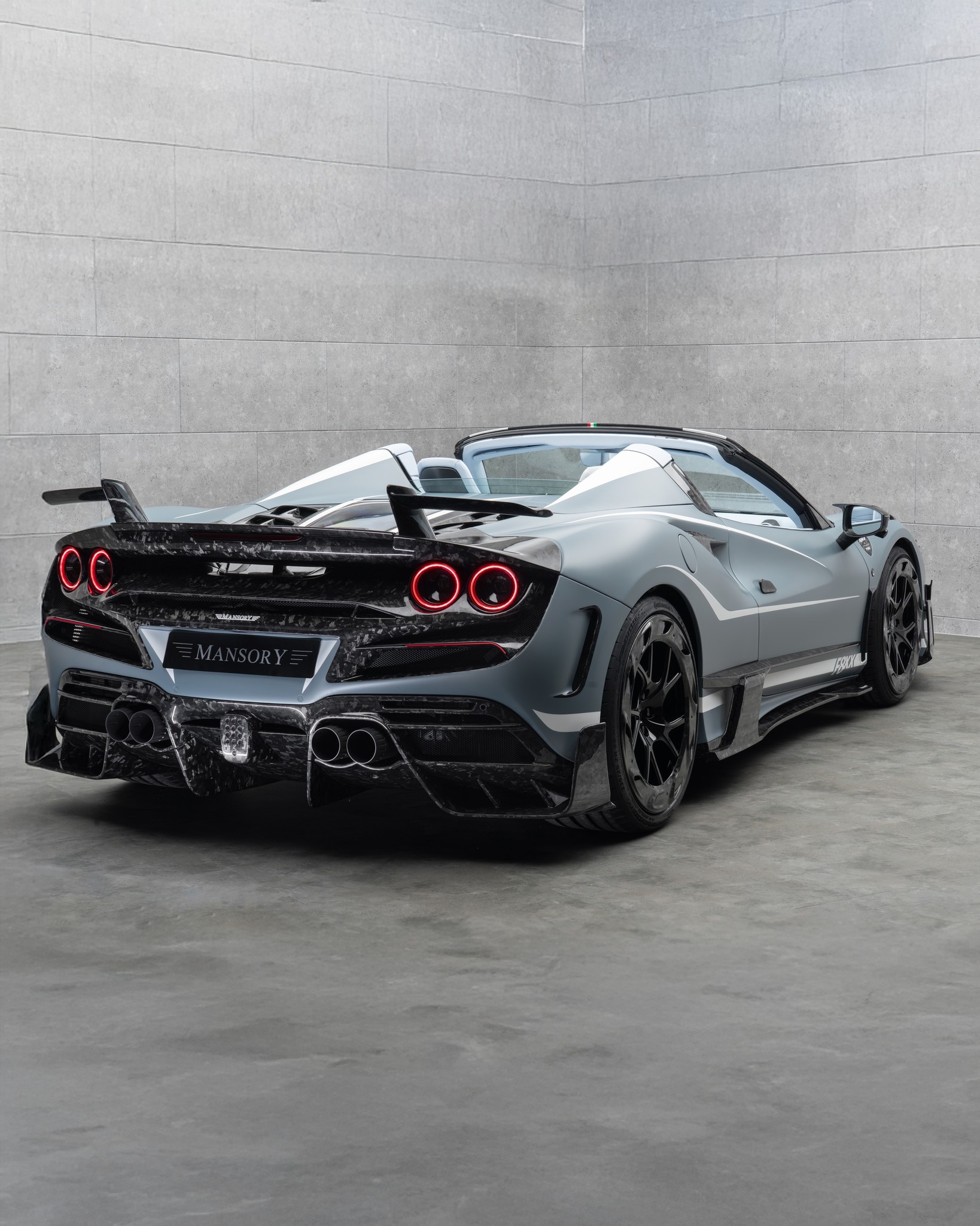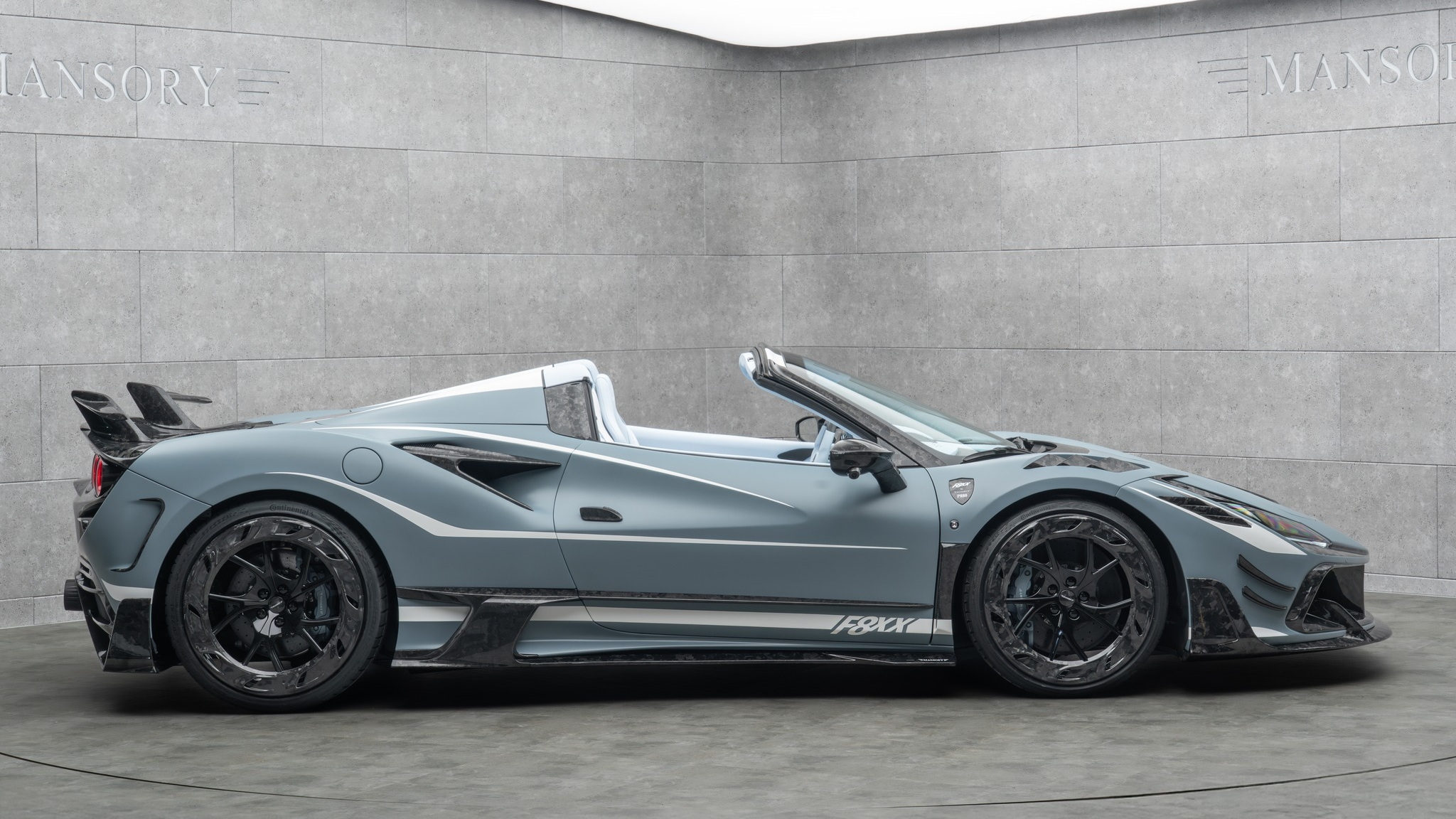 F8XX Spider มากับรูปลักษณ์อลังกาลตามสไตล์ Mansory โดดเด่นด้วยชุดแต่งรอบคันเป็นงานฟอร์จคาร์บอนลายหินอ่อนน้ำหนักเบาพิเศษ ส่งผลต่ออากาศพลศาสตร์ที่ดีขึ้น ชิ้นส่วนที่มีเช่น ชุดกันชนหน้าเสริมลิ้นกับคาร์นาดด้านข้าง, ฝากระโปรงหน้า, กระจกมองข้างเสริมครีบ,สกิร์ตข้าง, ช่องดักอากาศข้างตัวรถเสริมครีบ, ฝาครอบเครื่องยนต์ดีไซน์เฉพาะรุ่น Spider, Diffuser ท้ายขนาดใหญ่พร้อมปลายท่อไอเสียออก 4 ท่อ, ปีกท้ายใหม่เป็นแบบแยกชิ้นซ้าย-ขวา ทรงตัว L ล้อฟอร์จดุดันด้านหน้าขอบ 21 นิ้ว หลัง 22 นิ้ว จับคู่กับยางสมรรถนะสูงไซส์ 255/30 ZR21 และ 335/25 ZR22