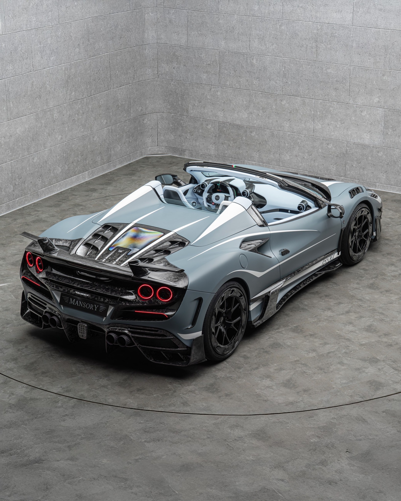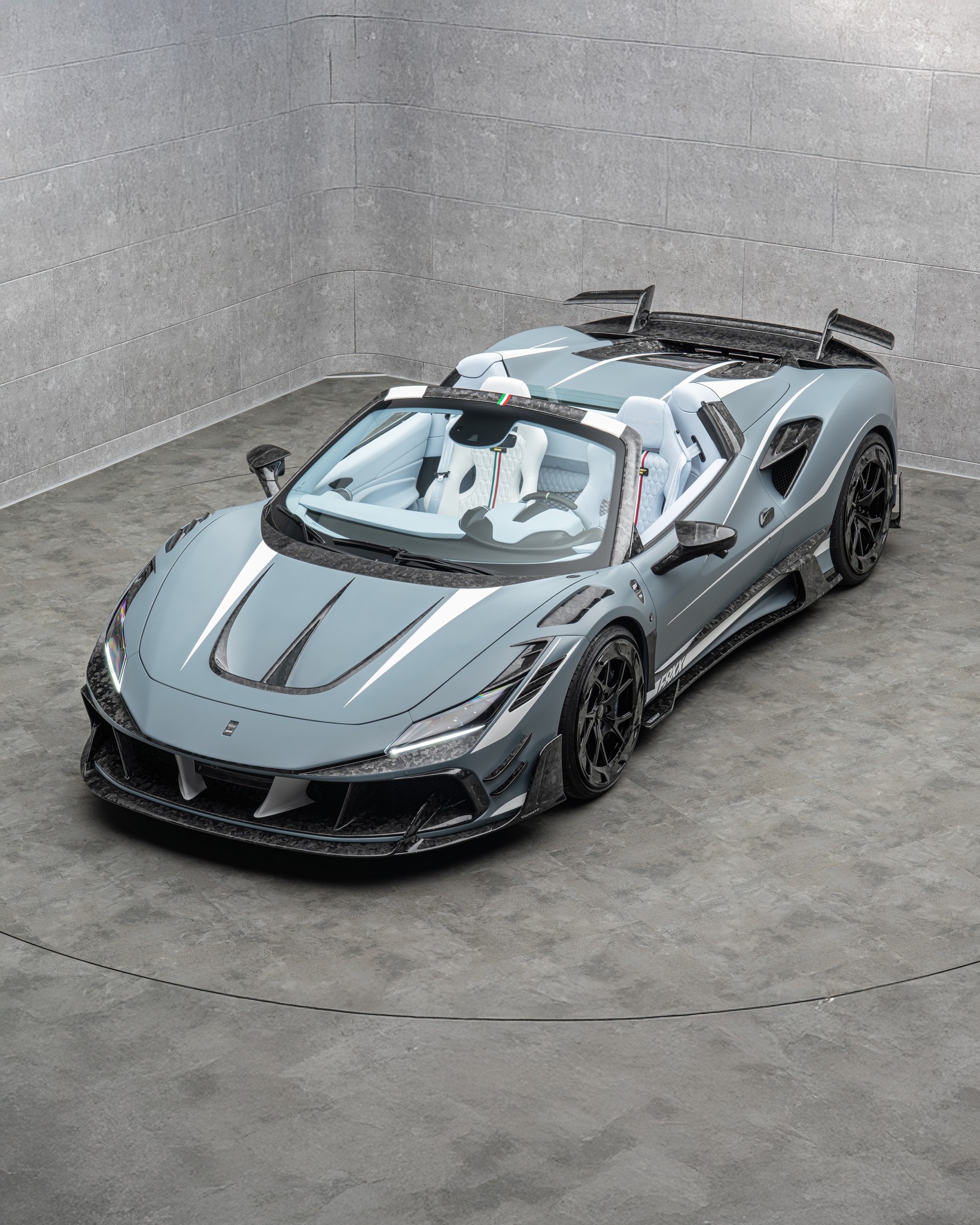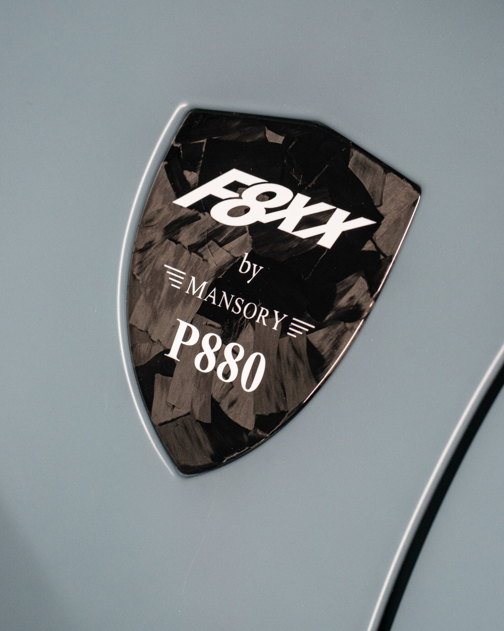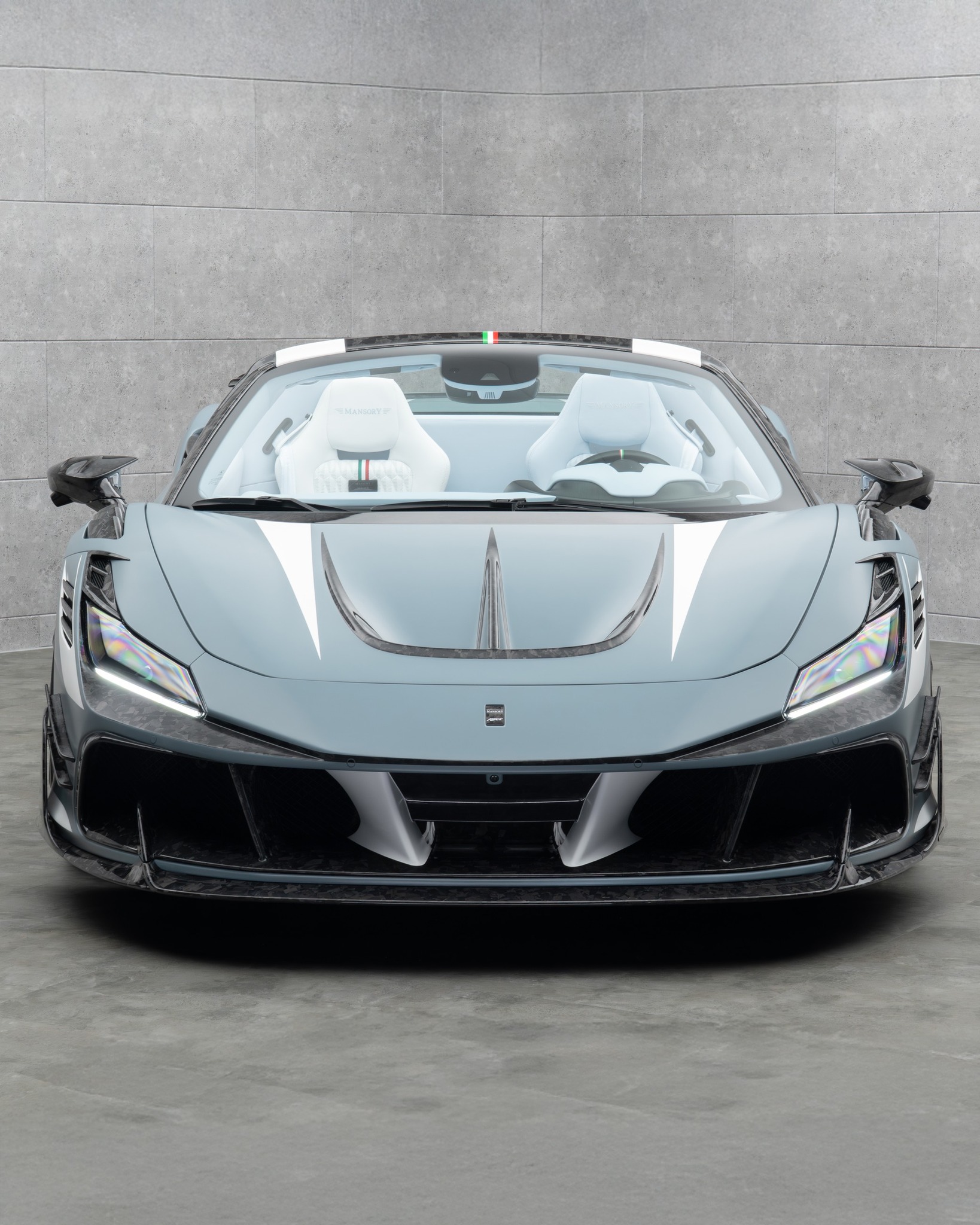 F8XX Spider มากับรูปลักษณ์อลังกาลตามสไตล์ Mansory โดดเด่นด้วยชุดแต่งรอบคันเป็นงานฟอร์จคาร์บอนลายหินอ่อนน้ำหนักเบาพิเศษ ส่งผลต่ออากาศพลศาสตร์ที่ดีขึ้น ชิ้นส่วนที่มีเช่น ชุดกันชนหน้าเสริมลิ้นกับคาร์นาดด้านข้าง, ฝากระโปรงหน้า, กระจกมองข้างเสริมครีบ,สกิร์ตข้าง, ช่องดักอากาศข้างตัวรถเสริมครีบ, ฝาครอบเครื่องยนต์ดีไซน์เฉพาะรุ่น Spider, Diffuser ท้ายขนาดใหญ่พร้อมปลายท่อไอเสียออก 4 ท่อ, ปีกท้ายใหม่เป็นแบบแยกชิ้นซ้าย-ขวา ทรงตัว L ล้อฟอร์จดุดันด้านหน้าขอบ 21 นิ้ว หลัง 22 นิ้ว จับคู่กับยางสมรรถนะสูงไซส์ 255/30 ZR21 และ 335/25 ZR22