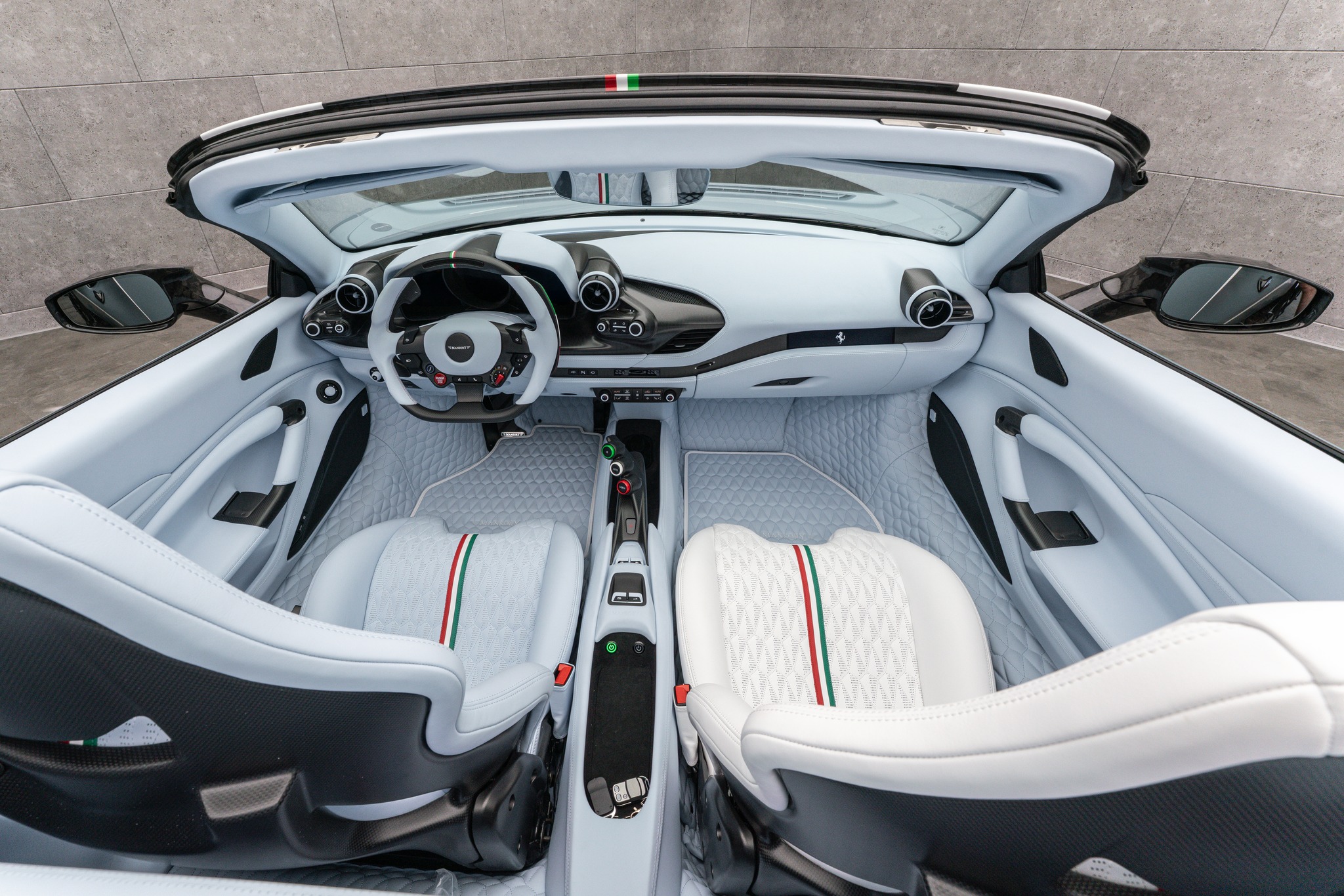 ห้องโดยสารก็ทำใหม่หมดเน้นหุ้มด้วยหนังแท้คุณภาพสูง เสริมคาร์บอนไฟเบอร์ดุดัน มีคาดลายธงชาติอิตาลีตามจุดต่างๆ เช่น ตัวเบาะ พวงมาลัย แพดเดิ้ลชิฟต์ ส่วนพื้นรถกับพรมวางเท้าตัดเย็บเป็นลายสี่เหลี่ยมเพชรดูหรูหรา