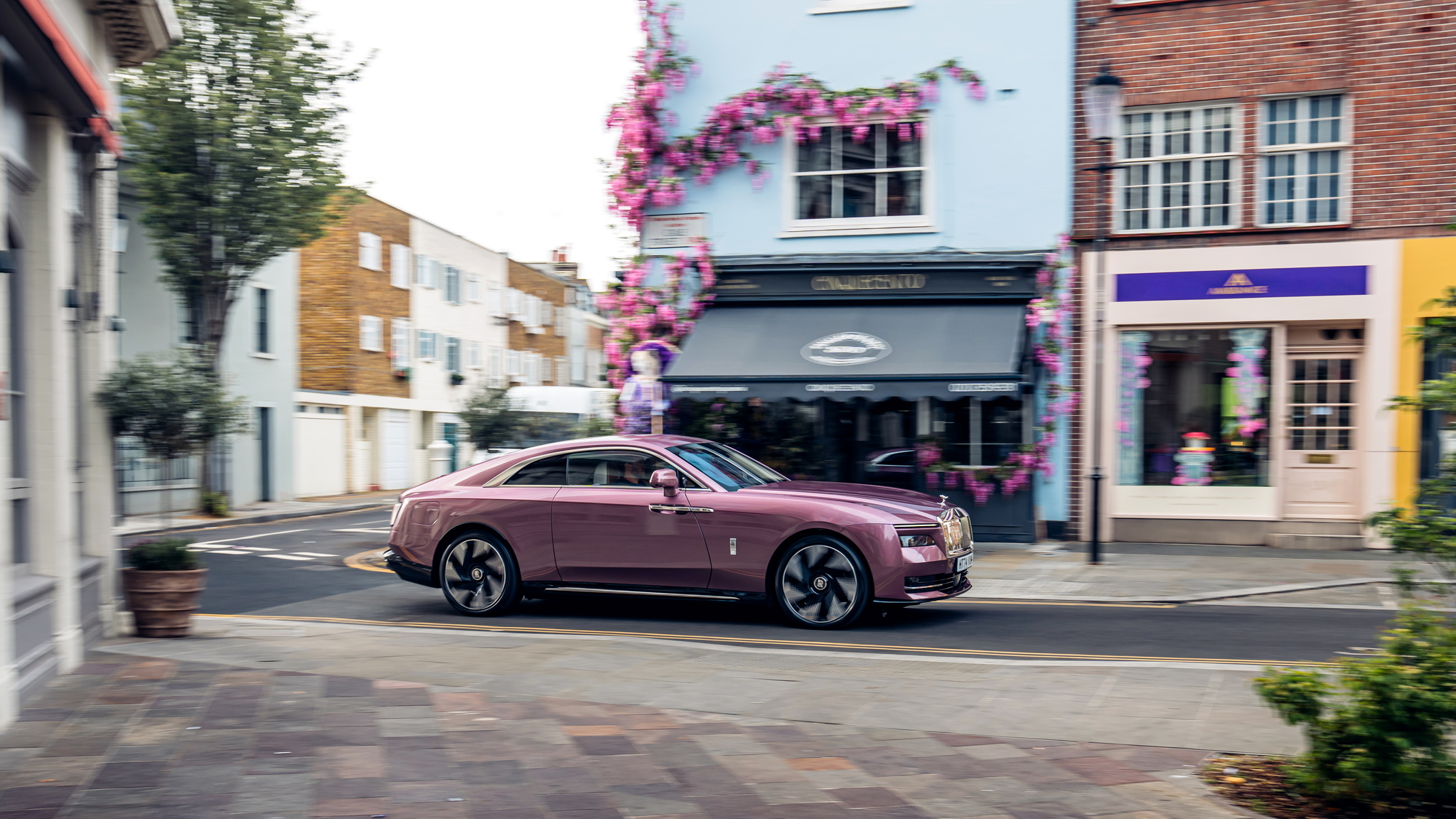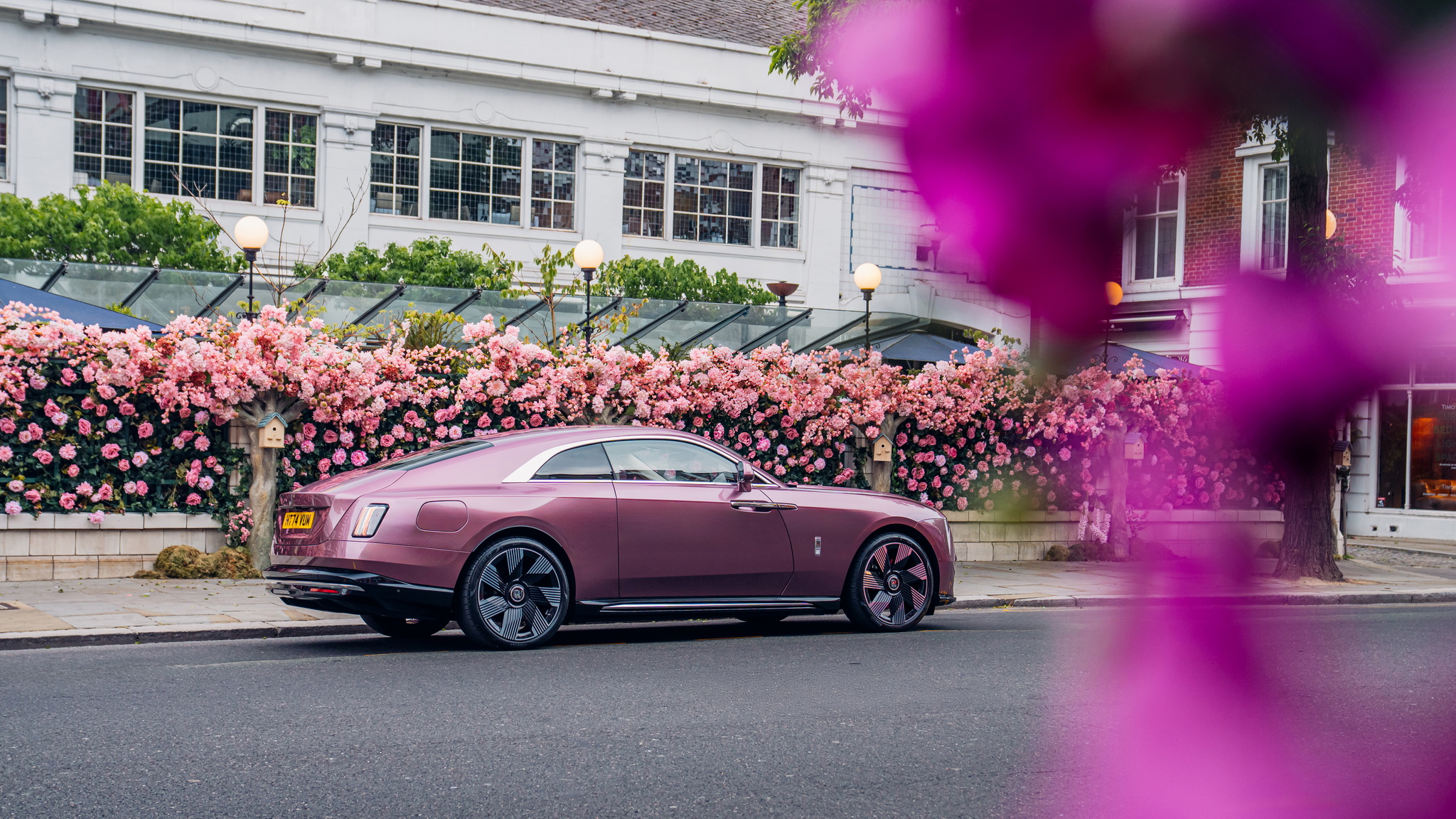 Rolls-Royce Spectre คันนี้สร้างขึ้นตามความต้องการลูกค้าโดยสะท้อนจิตวิญญาณแห่งฤดูใบไม้ผลิอย่างงดงาม ตัวถังภายนอกมากับสี Velvet Orchid สีม่วงอมชมพูที่ลึกล้ำหรูหรา ผสานกับเส้น Coachline ข้างตัวรถสี Peony Pink สร้างด้วยมือ โดยรวมทำให้รถคันนี้เป็นสไตล์ที่สาวๆ น่าจะชอบอย่างมาก