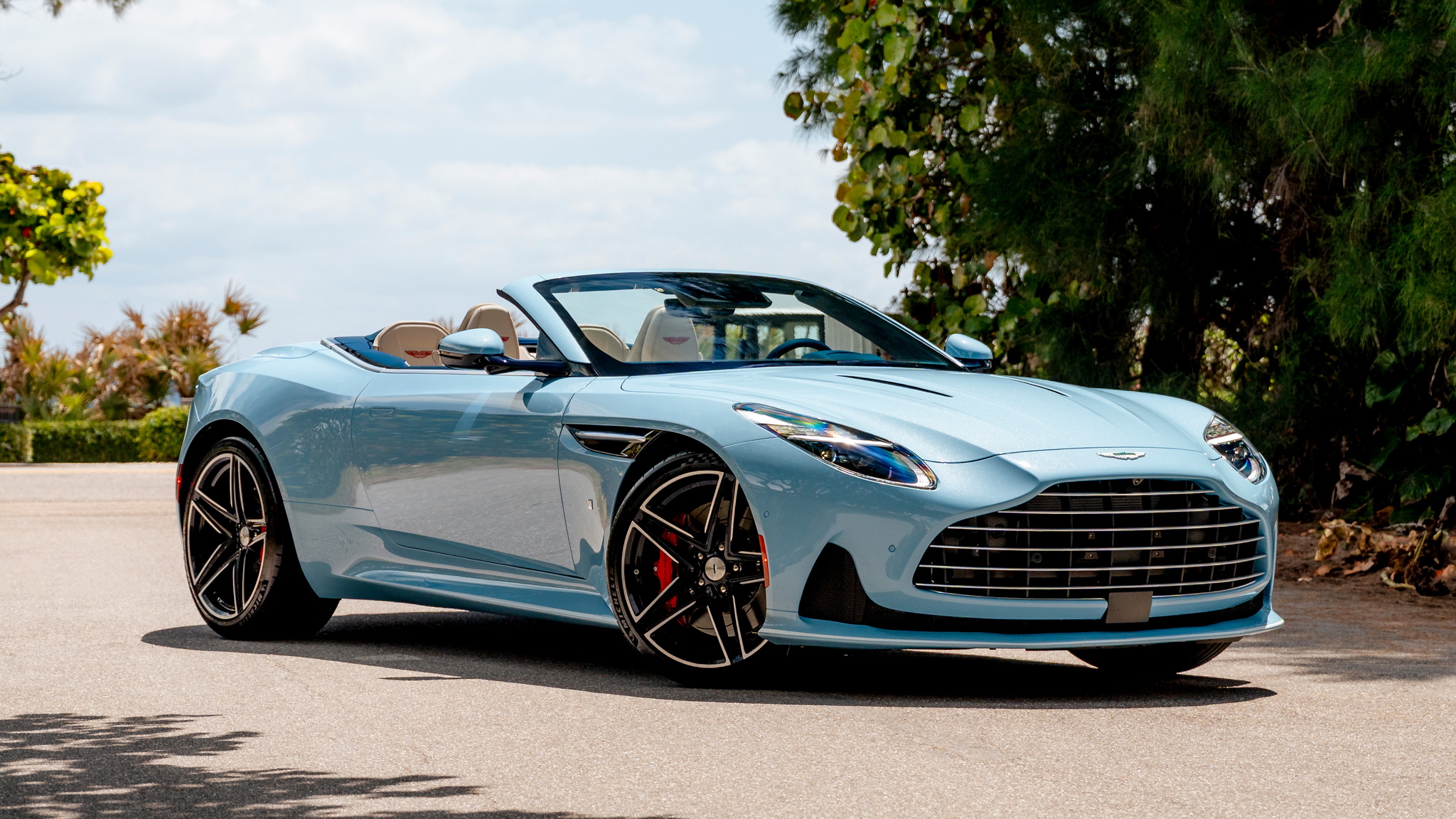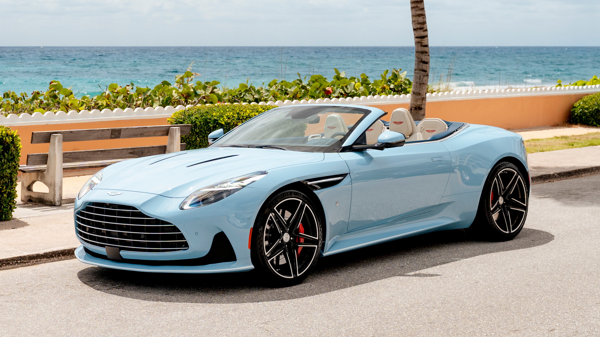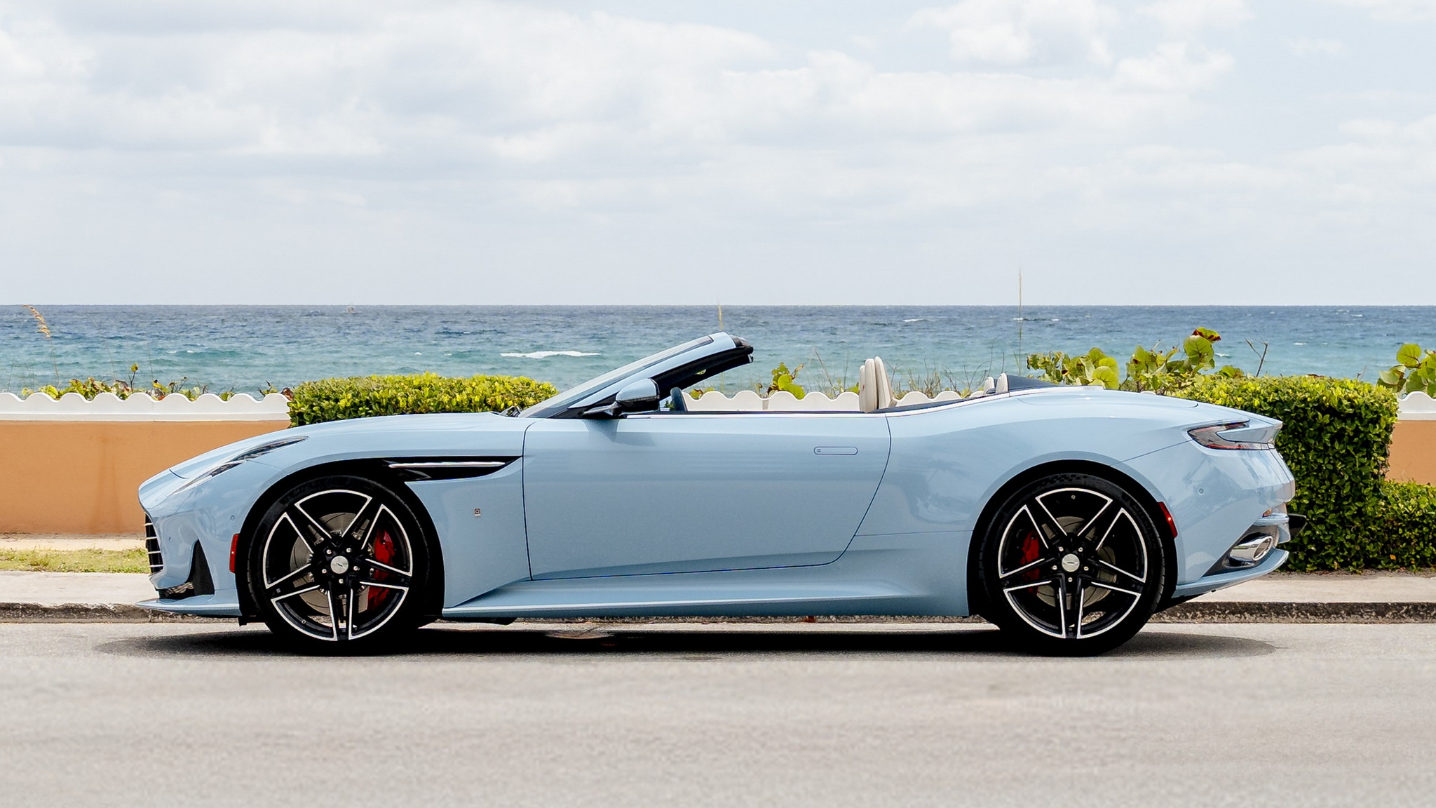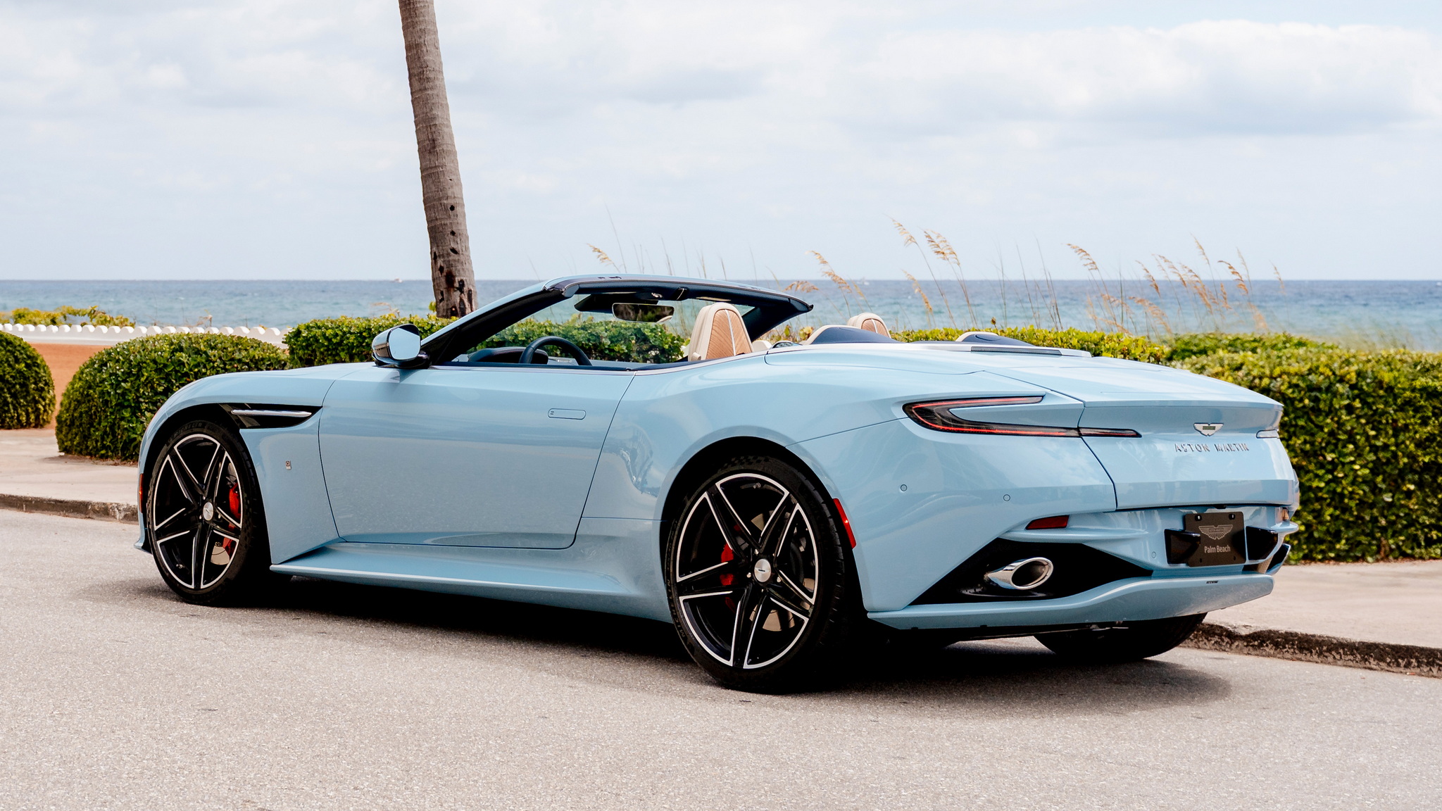 DB12 Volante Palm Beach Edition รุ่นพิเศษคันเดียวในโลก สร้างโดยแผนก Q by Aston Martin สะท้อนความงดงามและมีเอกลักษณ์ของชายฝั่ง Palm Beach รัฐฟลอริดา มาด้วยตัวถังสีฟ้า Frosted Blue Glass สีพิเศษเฉพาะคันนี้เท่านั้น ส่วนล่างตัวถังมีการลากเส้นสีขาว Club Sport White ให้ดูโดดเด่น ล้อขนาด 21 นิ้ว ลายห้าก้านสีดำเงา Jet Black ตัดสีทูโทน