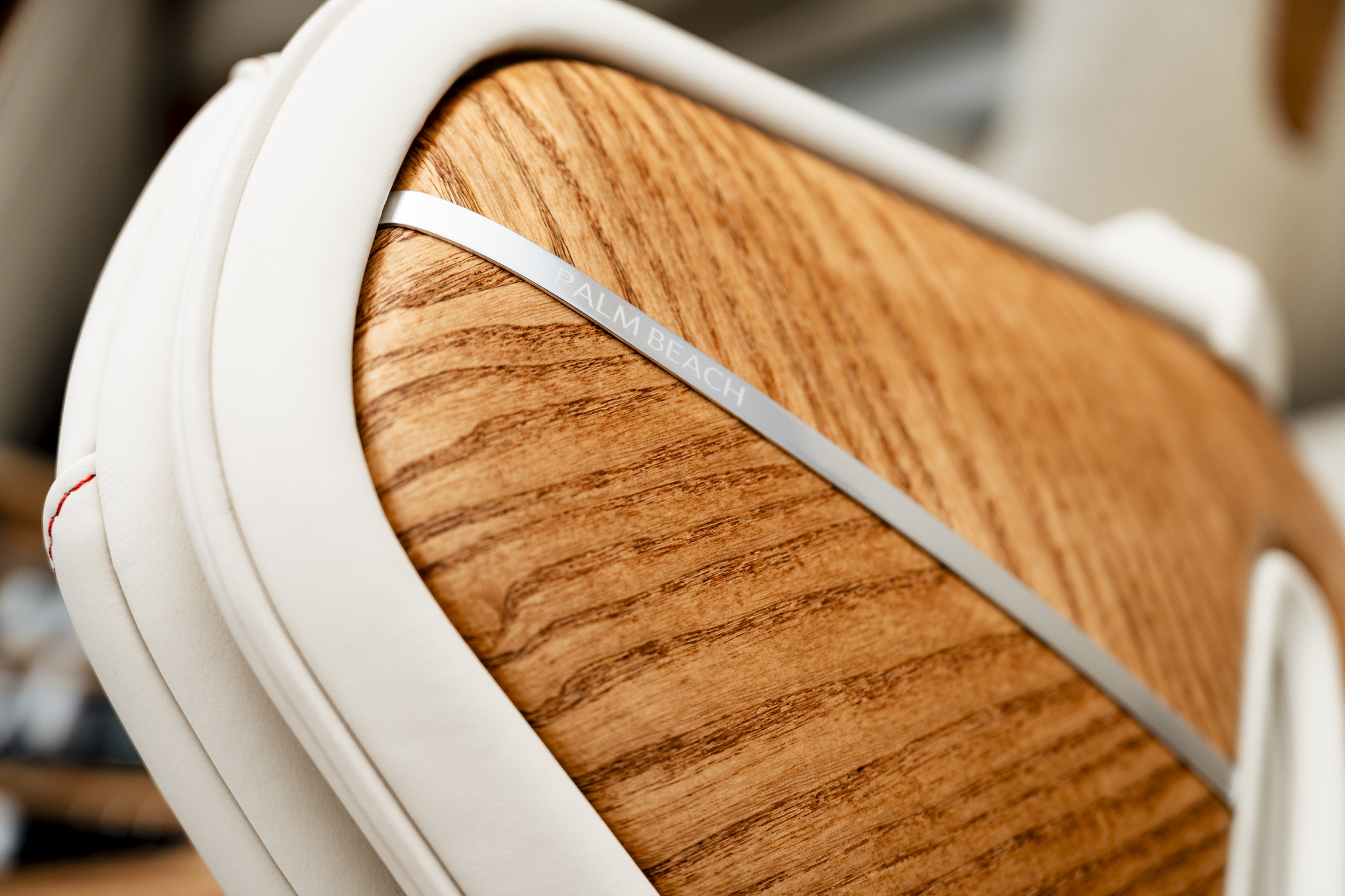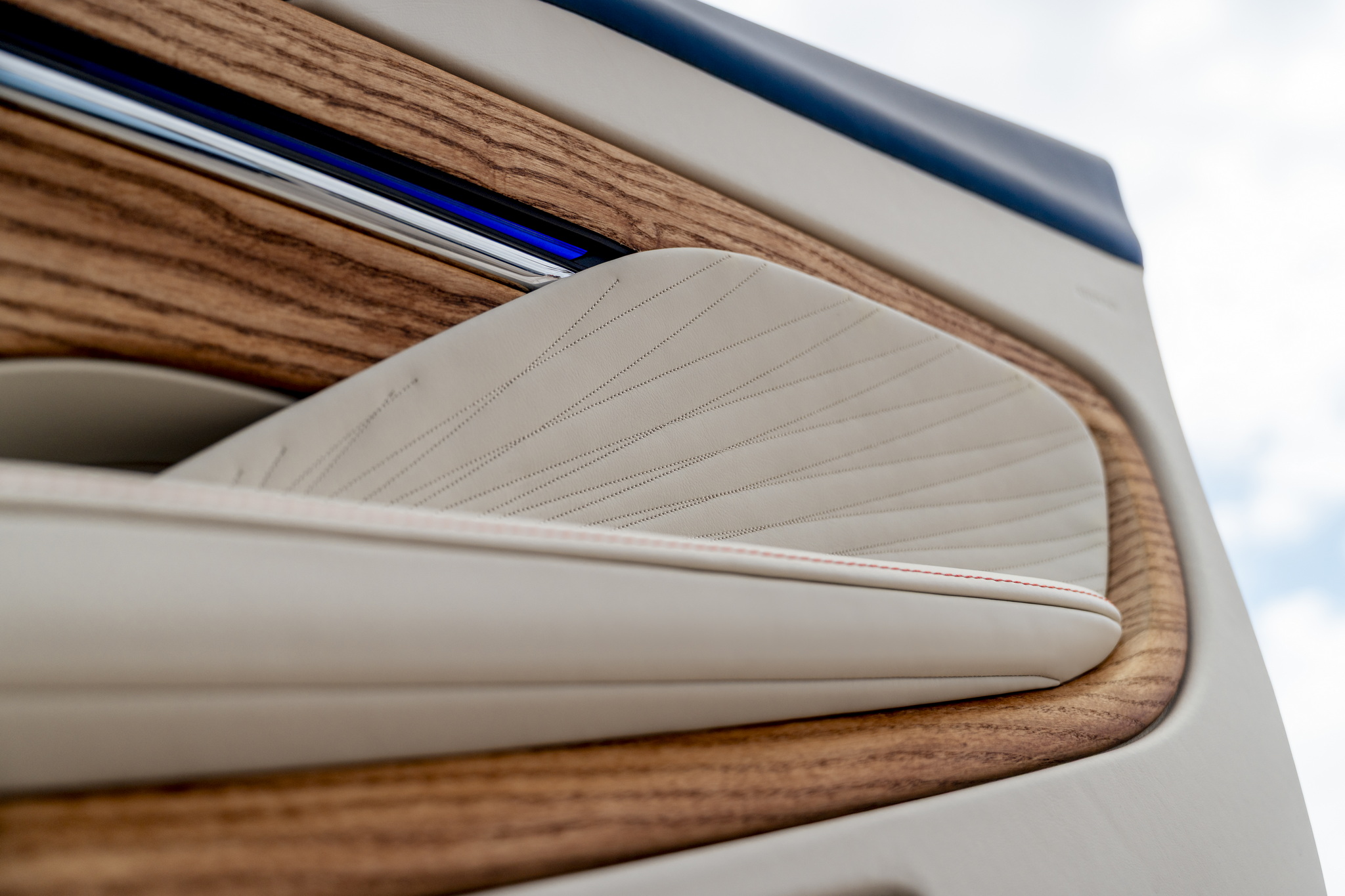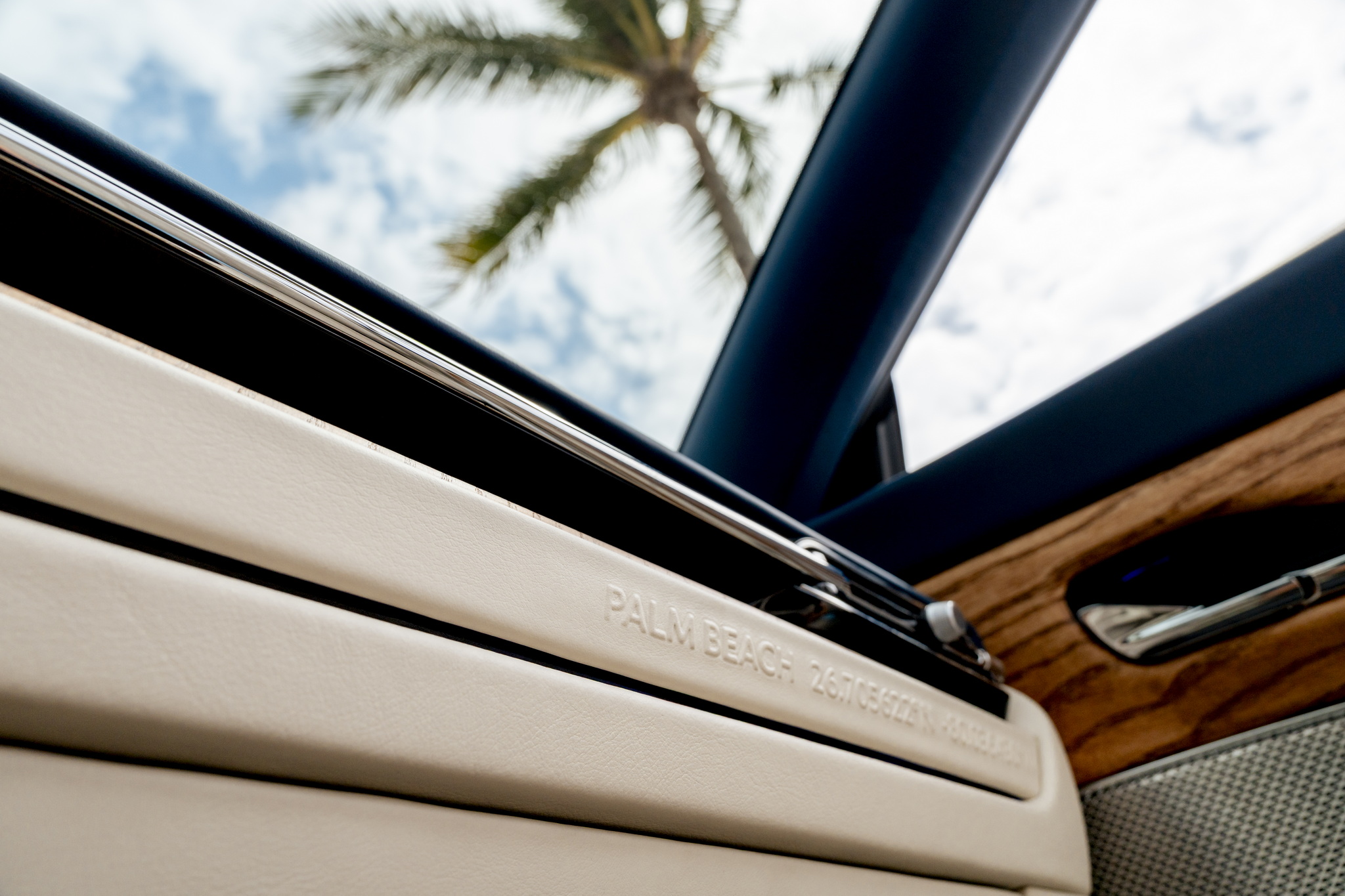 ห้องโดยสารก็ทำพิเศษ มาแบบทูโทนด้วยหนังแท้สีน้ำเงิน Aurora Blue สลับกับสีขาว Ivory และเดินตะเข็บด้ายสีแดง Spicy Red เบาะนั่งและที่แผงประตูมีการเย็บปักลายที่ได้รับแรงบันดาลใจจากใบปาล์ม มีการใช้วัสดุไม้ Linear Light Olive Ash ผิว open-pore ซึ่งมีการต่อลายแบบ Book-matched แผงคอนโซลฝั่งผู้โดยสารตอนหน้าที่หุ้มหนังสีขาวยังมีการประทับพิกัด GPS ละติจูดและลองจิจูดของ Palm Beach ไว้ด้วย