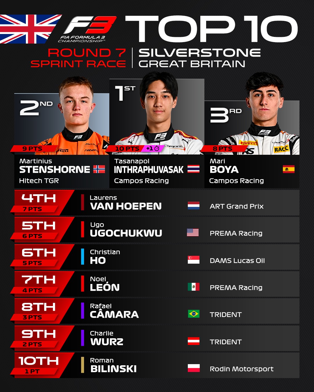 เติ้น ทัศนพล อินทรภูวศักดิ์ นักแข่งดาวรุ่งวัย 19 ปี ทีม Campos Racing กับรถหมายเลข 11 ได้สร้างประวัติศาสตร์เป็นนักแข่งชาวไทยคนแรกคว้าแชมป์ F3 ด้วยเวลา 35:18.467 นาที ขึ้นโพเดี้ยมพร้อมเสียงเพลงชาติไทยดังกึกก้องทั่วสนาม Silverstone เป็นความภาคภูมิใจของชาวไทยทุกคน ชัยชนะครั้งนี้เกิดขึ้นในเรซที่ เติ้น ออกสตาร์ตจากตำแหน่งโพลของกริดกลับด้าน (reverse grid pole) โดยเขาแสดงให้เห็นถึงความนิ่งและความกล้า ควบคุมรถผ่านช่วงโค้งเปิดสนามได้อย่างมั่นใจ แม้จะมีแรงกดดันจากคู่แข่งในช่วงต้นก็ตาม