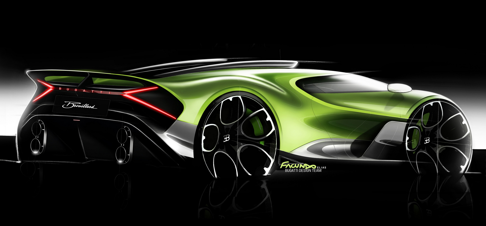 หน้าตาของ Bugatti Brouillard ดูเผินๆ จะคล้ายกับ W16 Mistral แต่ถ้าดูอย่างละเอียดส่วนของตัวถังนั้นถูกสร้างขึ้นใหม่หมด เป็นการหลอมรวมดีไซน์องค์ประกอบของหลากรุ่นมารวมกัน ไม่ว่าจะเป็น ช่องดักอากาศคู่บนหลังคาจาก Veyron, ด้านข้างรถส่วนล่างจาก Divo, ท่อไอเสียแนวตั้ง Chiron Super Sport และไฟหน้าไฟท้ายของ W16 Mistral บั้นท้ายสง่างามด้วยสปอยเลอร์ท้ายแบบ ducktail โค้งกลมกลืนกับดีไซน์ตัวถัง
