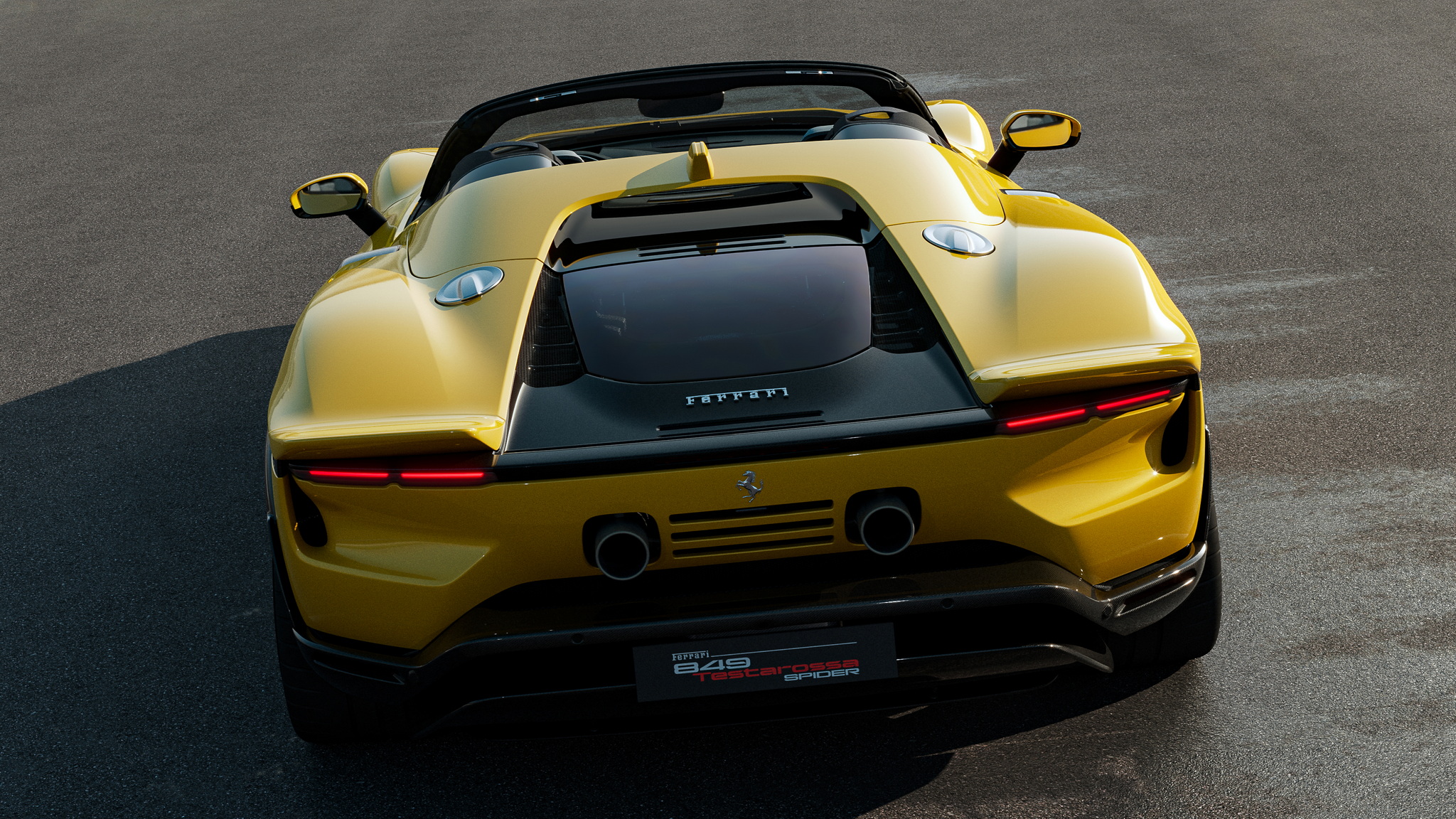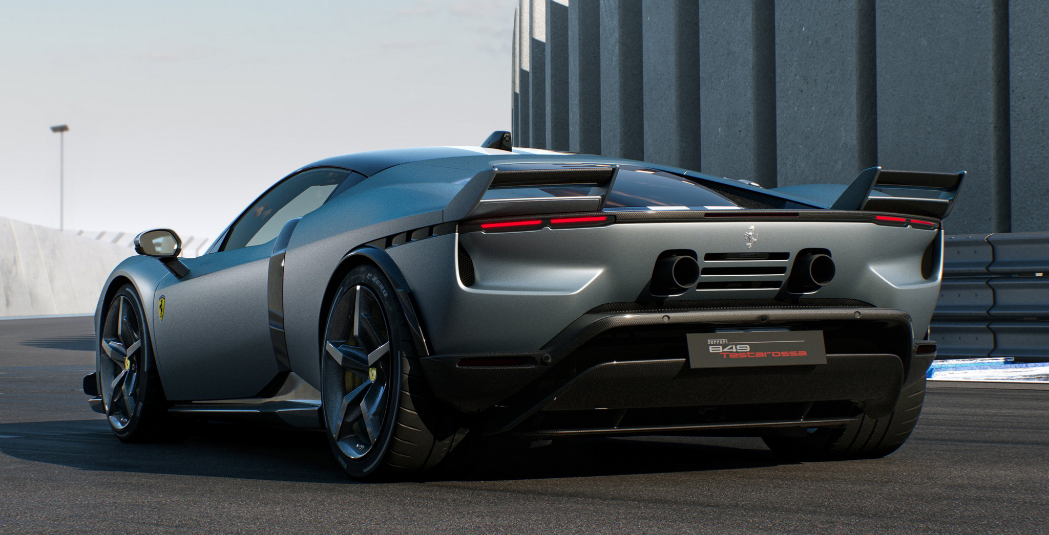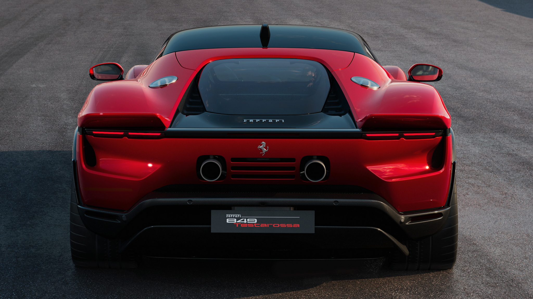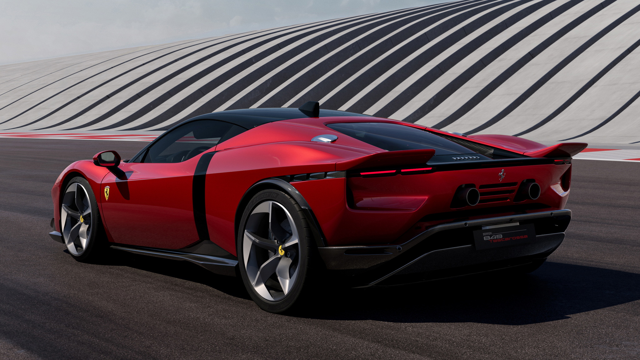 Ferrari เปิดตัวทีเดียว 2 รุ่นรวด 849 Testarossa (คูเป้) และ 849 Testarossa Spider (เปิดประทุน) รุ่น Spider มากับหลังคาแข็งแบบพับเก็บได้ (RHT) เปิดปิดหลังคาได้ภายในเวลา 14 วินาที ใช้งานได้ขณะขับขี่ที่ความเร็วสูงสุด 45 กม./ชม. งานดีไซน์ภายนอกมาเป็นทรงเหลี่ยมแบบรถแข่ง 512 S ยุค 70 ด้านอากาศพลศาสตร์เน้นไปที่แรงกดและการระบายความร้อนที่ยอดเยี่ยม แรงกดรวมสูงสุดที่ทำได้คือ 415 กิโลกรัม ที่ความเร็ว 250 กม./ชม. เพิ่มขึ้นจาก SF90 ถึง 25 กิโลกรัม ประสิทธิภาพในการระบายความร้อนก็เพิ่มขึ้น 15% ด้านหน้ารถมีกันชนหน้าและใต้ท้องรถที่ออกแบบใหม่หมด ใต้ท้องมีครีบช่วยสร้างกระแสลม Vortex Generators ข้างตัวรถดีไซน์ตัวถังให้รับปริมาณอากาศไปยังอินเตอร์คูลเลอร์ได้มากขึ้นถึง 30% บั้นท้ายโดดเด่นด้วยดีไซน์หางคู่ Twin tail แรงบันดาลใจจาก 512 S ซึ่งจะทำงานร่วมกับสปอยเลอร์หลังแบบแอคทีฟที่ซ่อนอยู่ตรงกลาง และดิฟฟิวเซอร์แบบหลายระดับช่วยลดแรงต้านอากาศได้อย่างดีเยี่ยม