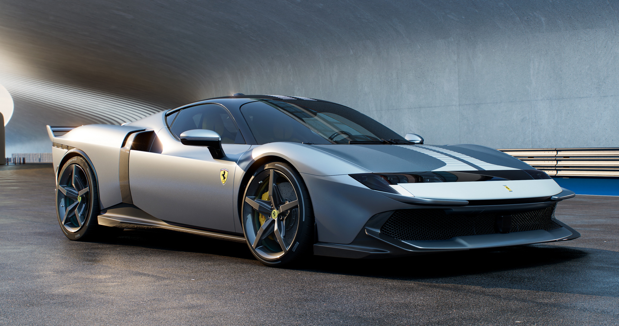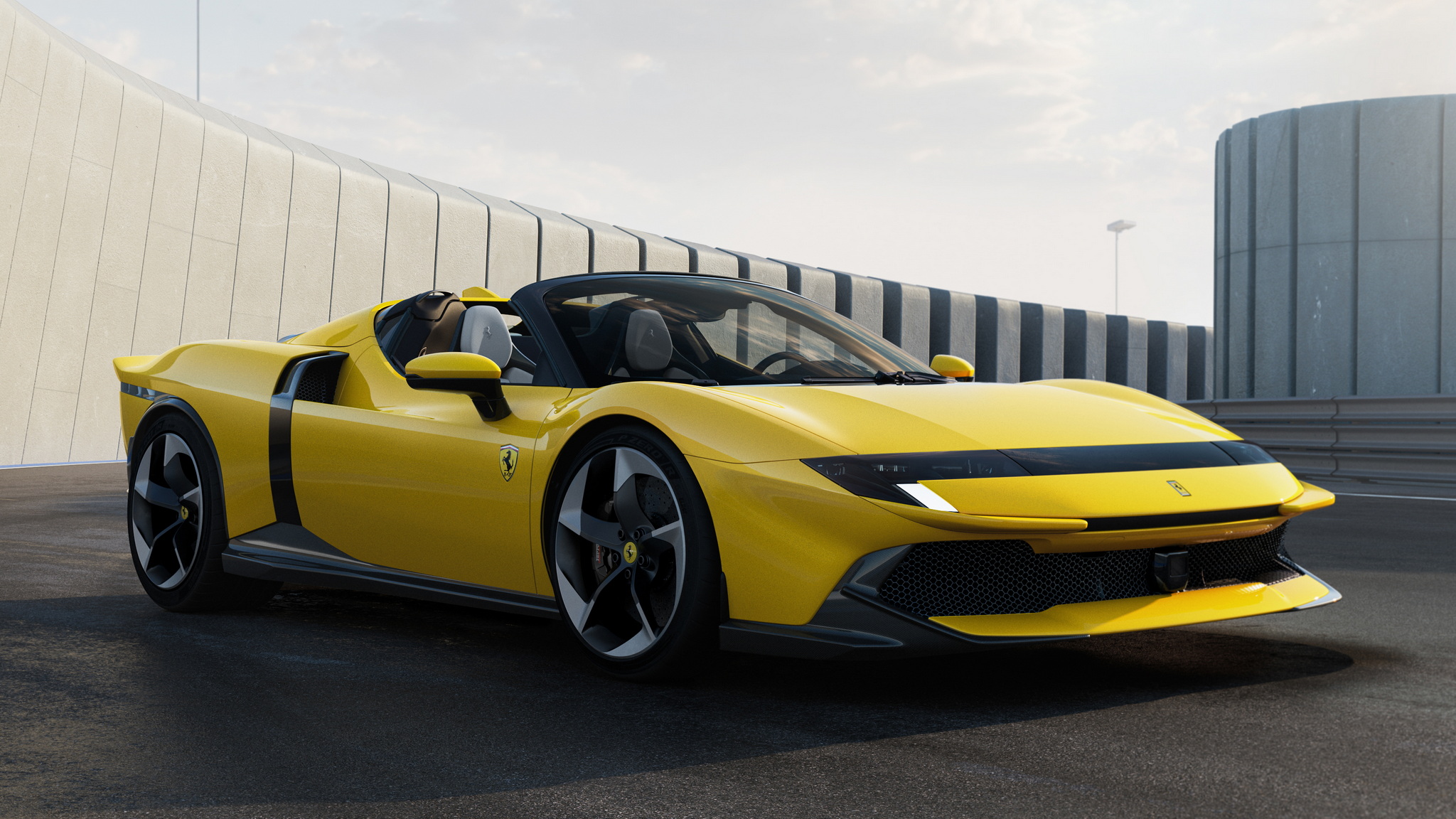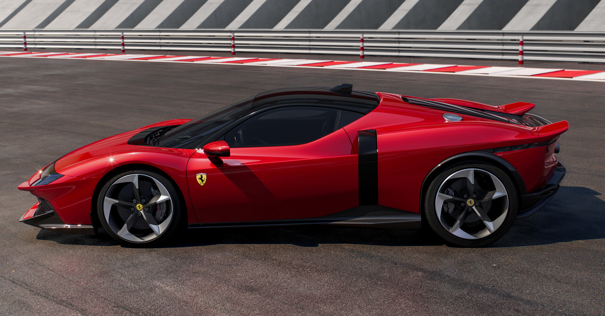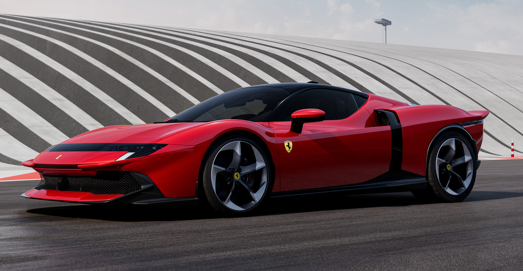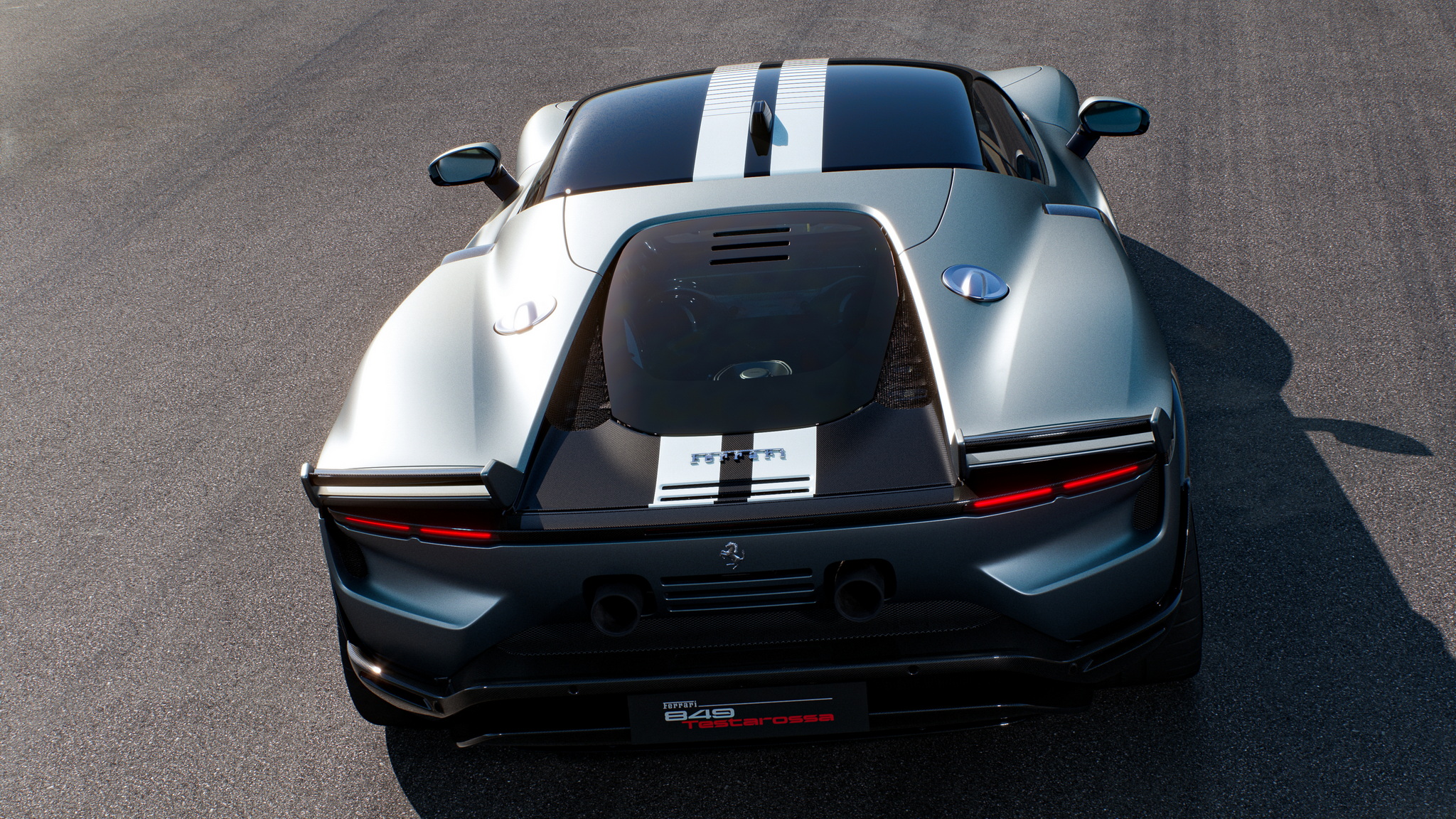 Ferrari เปิดตัวทีเดียว 2 รุ่นรวด 849 Testarossa (คูเป้) และ 849 Testarossa Spider (เปิดประทุน) รุ่น Spider มากับหลังคาแข็งแบบพับเก็บได้ (RHT) เปิดปิดหลังคาได้ภายในเวลา 14 วินาที ใช้งานได้ขณะขับขี่ที่ความเร็วสูงสุด 45 กม./ชม. งานดีไซน์ภายนอกมาเป็นทรงเหลี่ยมแบบรถแข่ง 512 S ยุค 70 ด้านอากาศพลศาสตร์เน้นไปที่แรงกดและการระบายความร้อนที่ยอดเยี่ยม แรงกดรวมสูงสุดที่ทำได้คือ 415 กิโลกรัม ที่ความเร็ว 250 กม./ชม. เพิ่มขึ้นจาก SF90 ถึง 25 กิโลกรัม ประสิทธิภาพในการระบายความร้อนก็เพิ่มขึ้น 15% ด้านหน้ารถมีกันชนหน้าและใต้ท้องรถที่ออกแบบใหม่หมด ใต้ท้องมีครีบช่วยสร้างกระแสลม Vortex Generators ข้างตัวรถดีไซน์ตัวถังให้รับปริมาณอากาศไปยังอินเตอร์คูลเลอร์ได้มากขึ้นถึง 30% บั้นท้ายโดดเด่นด้วยดีไซน์หางคู่ Twin tail แรงบันดาลใจจาก 512 S ซึ่งจะทำงานร่วมกับสปอยเลอร์หลังแบบแอคทีฟที่ซ่อนอยู่ตรงกลาง และดิฟฟิวเซอร์แบบหลายระดับช่วยลดแรงต้านอากาศได้อย่างดีเยี่ยม