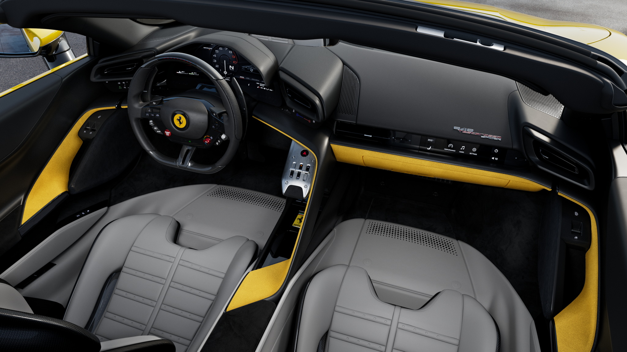 ห้องโดยสารมาในสไตล์รถแข่งแต่ก็ยังคำนึงถึงความสะดวกสบายในการนั่ง พวงมาลัยได้ปุ่ม Engine Start แบบดั้งเดิม และลูกบิด eManettino สำหรับระบบไฮบริด ร่องเกียร์ H-gate ดีไซน์แบบลอยตัว เบาะนั่งมีให้เลือกทั้งแบบมาตรฐานเน้นสบาย และแบบ Racing คาร์บอนไฟเบอร์ รองรับ Apple CarPlay และ Android Auto มีแท่นชาร์จไร้สายบนคอนโซลกลาง และระบบ MyFerrari Connect ให้เจ้าของรถตรวจสอบสถานะรถได้ทุกที่ผ่านแอปพลิเคชัน