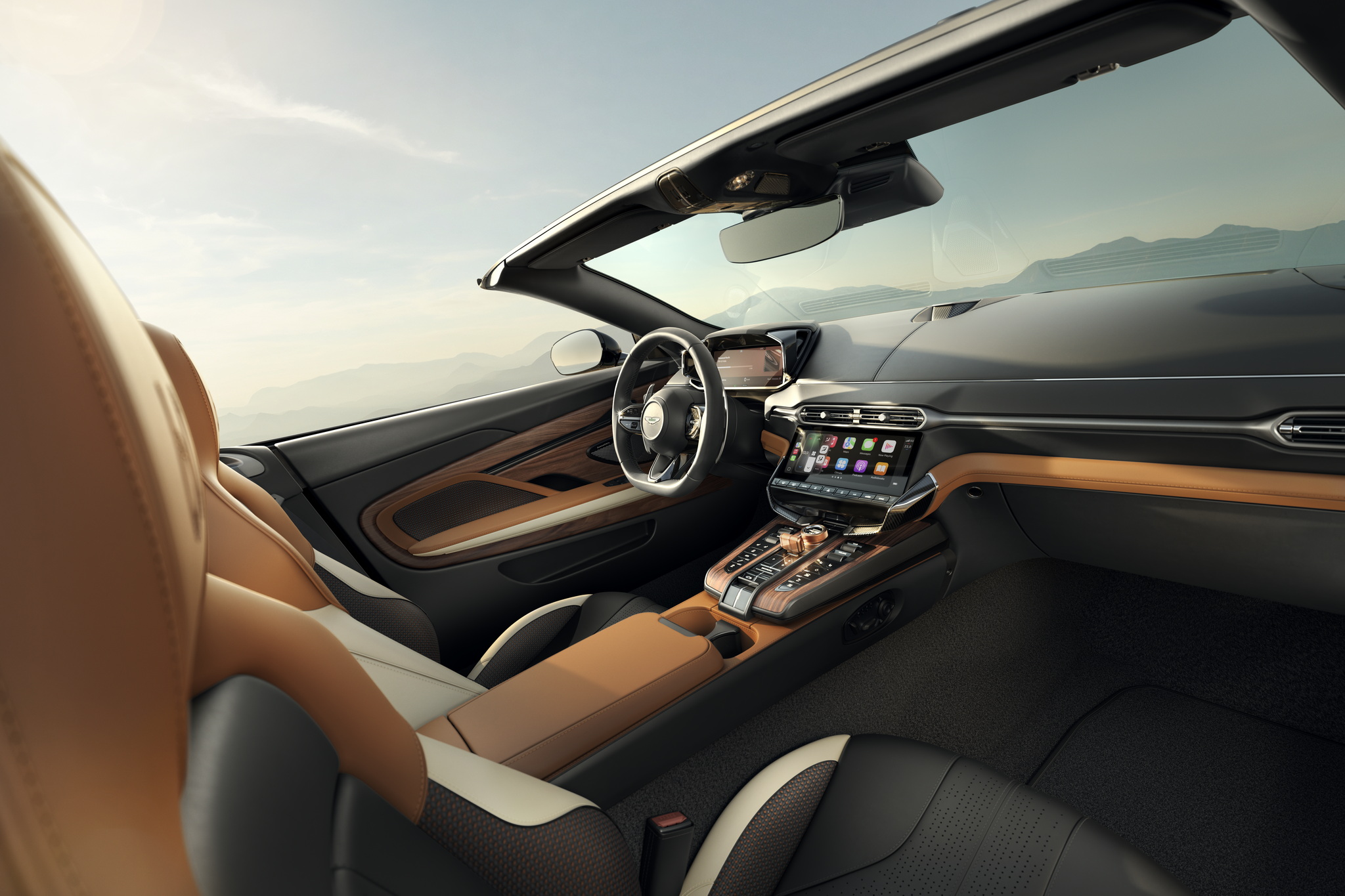 ภายในห้องโดยสารมาพร้อมหนังสามโทนสีพิเศษ Centenary Saddle Tan, Ivory และ Woven ผสานงานตกแต่งด้วยไม้ Dark Walnut Open Pore คอลโซลกลางมีการใช้สีบรอนซ์สุดหรูบนปุ่ม Engine Start ที่เป็นลูกบิดปรับโหมดการขับขี่ในตัว และที่ก้านเปลี่ยนเกียร์ขนาดเล็ก เลขฉลอง 60 ปี ยังปรากฏอยู่บนพนักศรีษะเบาะนั่งเป็นงานปัก