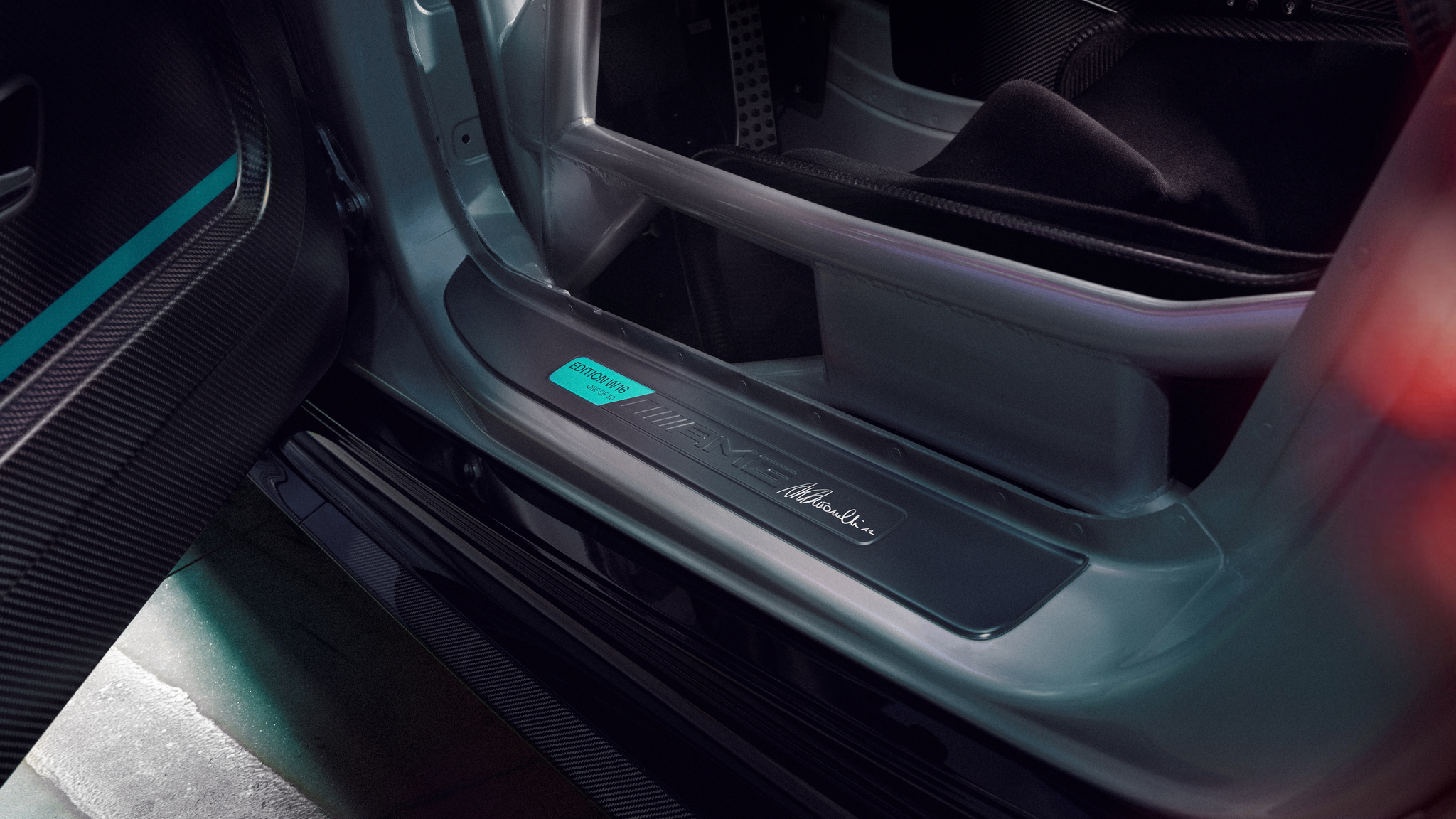 ห้องโดยสารจัดเต็มแบบรถแข่ง ด้วยวัสดุคาร์บอนไฟเบอร์ผิวด้านเป็นหลัก พร้อมด้วยสีเขียว PETRONAS บนเบาะ ประตู และคอนโซลกลาง ที่กาบบันไดข้างยังมาพร้อมลายเซ็นของ Kimi Antonelli นักขับ F1 รุ่นใหม่จากทีม Mercedes-AMG ซึ่งเป็นพรีเซนเตอร์อย่างเป็นทางการของรุ่นนี้ พร้อมป้าย “One of 30” ย้ำถึงความหายากของรถคันนี้ ระบบความปลอดภัยก็ครบครัน เช่น โครงนิรภัยคาร์บอนไฟเบอร์, เข็มขัดนิรภัย 5 จุด, ตาข่ายนิรภัย, ระบบดับเพลิง, ถังน้ำมันนิรภัย, ช่องฉุกเฉินบนหลังคา, ระบบ ABS สำหรับสนามแข่ง และระบบ traction control แบบปรับได้หลายระดับ