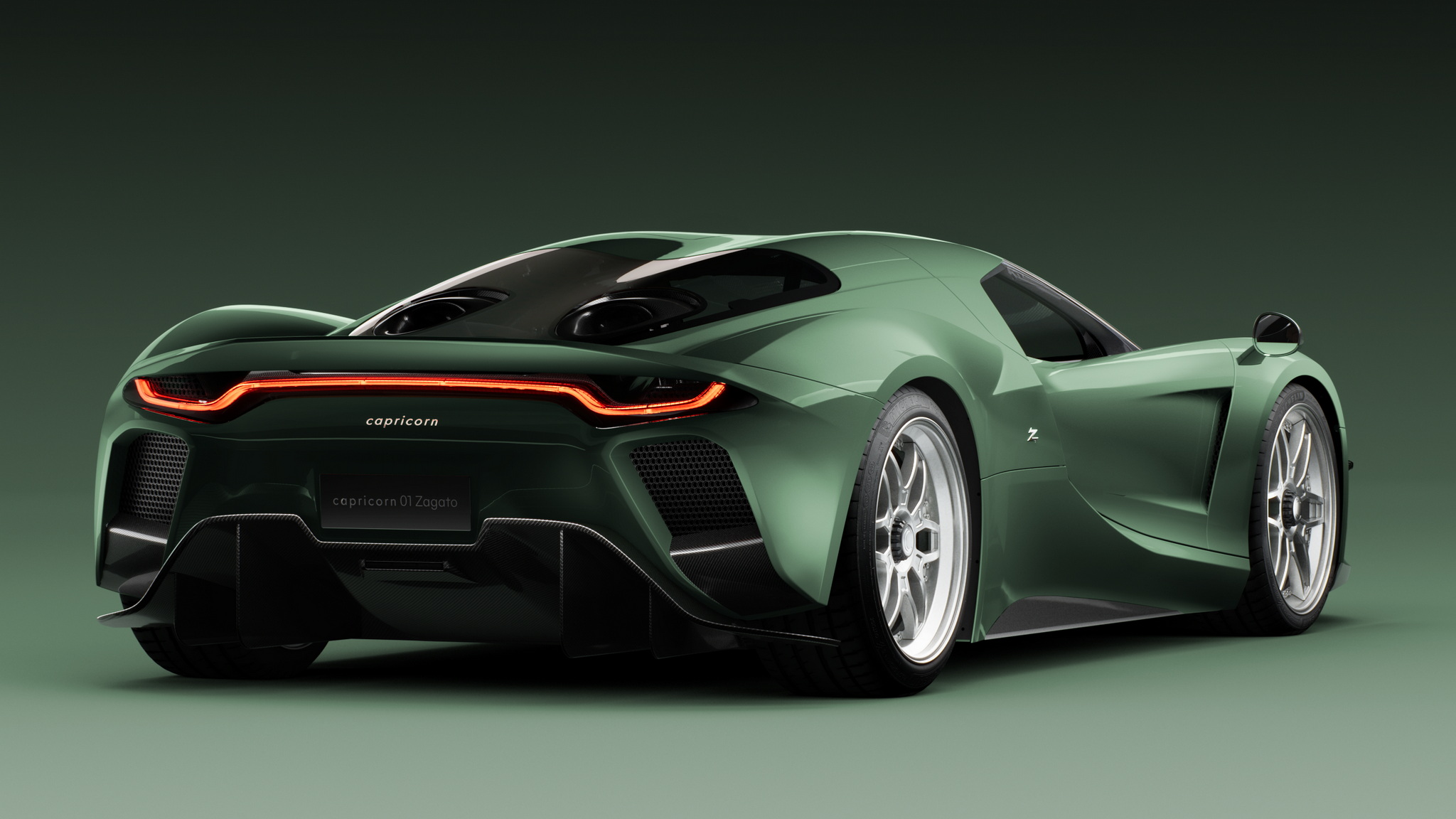 Capricorn 01 Zagato มากับโครงสร้างคาร์บอนไฟเบอร์เต็มรูปแบบ ตั้งแต่โมโนค็อกยันแผงตัวถัง น้ำหนักเปล่าไม่ถึง 1,200 กก. ทำให้มีอัตราส่วนแรงม้าต่อน้ำหนักเทียบเท่าพวก Gordon Murray T.50 และ Pagani Huayra R ตัวถังภายนอกออกแบบโดย Zagato โค้ชบิลเดอร์ระดับตำนานจากอิตาลี ก่อตั้งในปี 1919 ตัวรถจะเน้นดีไซน์ที่เรียบหรู อากาศพลศาสตร์ที่ยอดเยี่ยมโดยไม่พึ่งสปอยเลอร์ขนาดใหญ่ ประตูเปิดแบบปีกนก Gullwing พร้อมช่องนำอากาศเข้าสู่เครื่องยนต์โดยตรง และหลังคาทรง Double Bubble อันเป็นเอกลักษณ์ของ Zagato