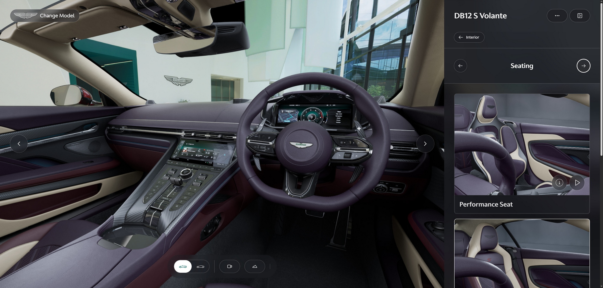 ไลน์อัปรุ่นรถที่มีให้ปรับแต่งก็มาครบตั้งแต่ Vantage, DB12, DBX, Vanquish จนไปถึง Valhalla อีกหนึ่งฟีเจอร์ที่ช่วยยกระดับประสบการณ์การกำหนดสเปกรถ คือการเพิ่มสภาพแวดล้อมเสมือนจริง (Virtual Environments) ซึ่งผู้ใช้งานสามารถเลือกได้ว่าจะเห็นรถของตนในสภาพแสงแบบไหน แสงธรรมชาติ แสงไฟโชว์รูม หรือแม้แต่ฉากสถานที่ต่าง ๆ ที่จำลองขึ้นมา ซึ่งช่วยให้เห็นรายละเอียดของรถ เช่น สี หรือวัสดุภายใน ได้อย่างแม่นยำมากยิ่งขึ้น