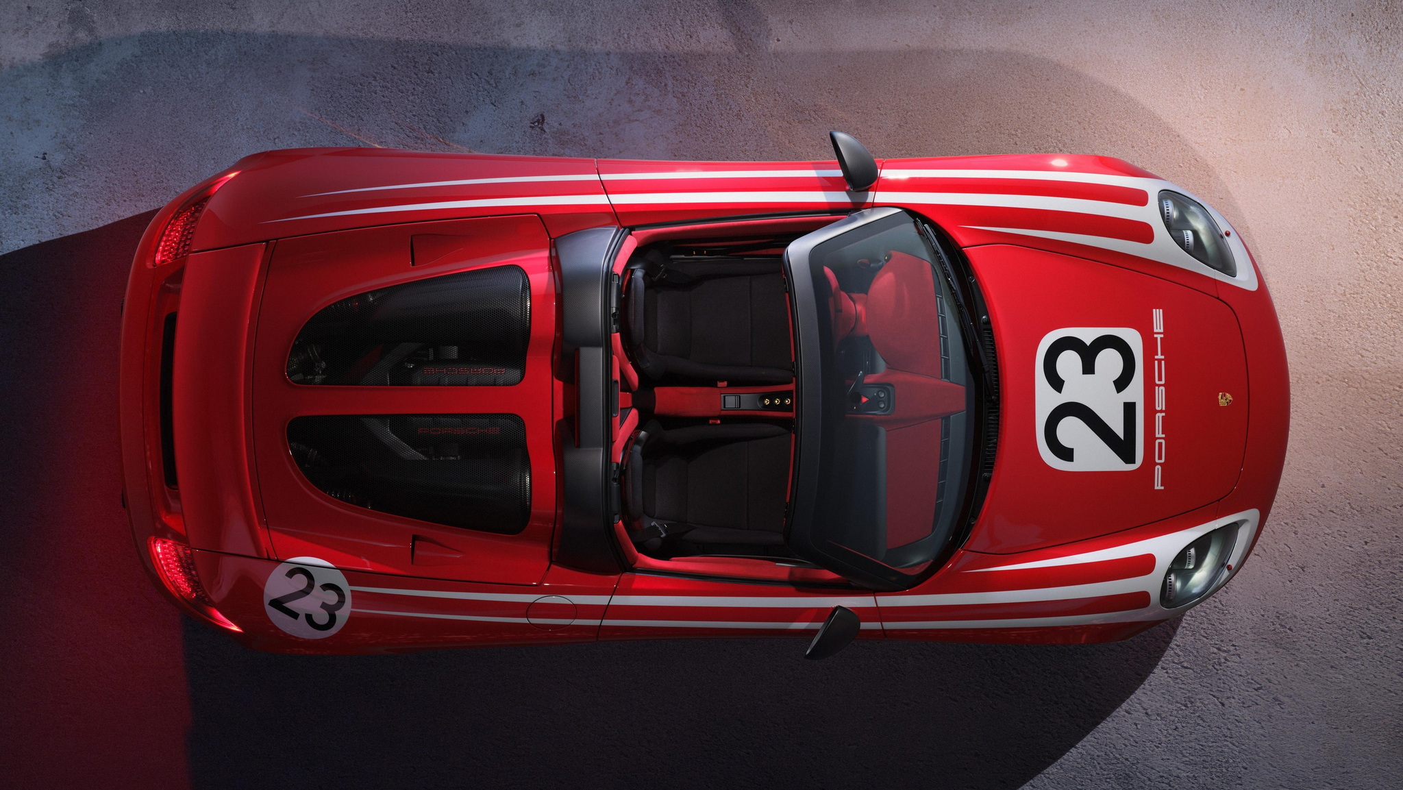 ภายนอกตัวรถถูกพ่นสีใหม่ด้วยสีแดง Guards red และสีขาวพร้อมหมายเลข 23 เป็นลวดลายพิเศษ “Salzburg” รำลึกถึง Porsche 917 ที่คว้าชัยในการแข่งขัน Le Mans ปี 1970 พร้อมเคลือบฟิล์มใสปกป้องสีรถไว้รอบคัน และโดดเด่นขึ้นด้วยงานคาร์บอนไฟเบอร์ผิวด้านที่หลังคาเสา A และ B ฝาครอบกระจกมองข้าง ช่องดักอากาศด้านหน้า และดิฟฟิวเซอร์ท้าย ตะแกรงฝาครอบเครื่องยนต์ก็เป็นสีดำด้านแบบอะโนไดซ์ ล้อลายดั้งเดิมถูกพ่นเป็นสีดำดูดุดัน