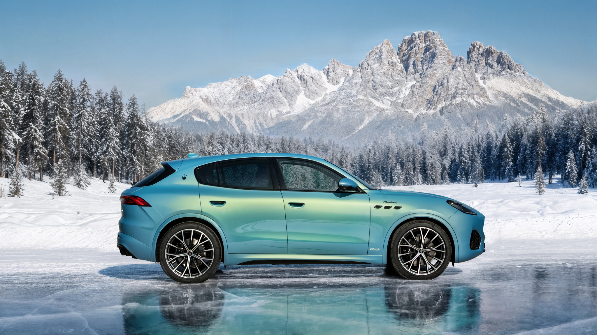 Maserati Grecale Cristallo สง่างามด้วยตัวถังสีฟ้า Azzurro Aureo สีพิเศษเฉพาะจากแผนก Fuoriserie เป็นโทนสีฟ้าที่รู้สึกเยือกเยือนพร้อมประกายระยิบระยับราวหิมะ และยังมีเกล็ดประกายสีทองช่วยเพิ่มมิติตามสภาพแสงที่เปลี่ยนไป แผงกระจังหน้ารถแนวตั้งสอดแทรกด้วยสีฟ้าเหมือนกับตัวรถ ล้ออลูมิเนียมลาย CRIO ขนาด 21 นิ้ว ตัดเป็นสีทูโทน Diamond-cut ดูหรูหรา