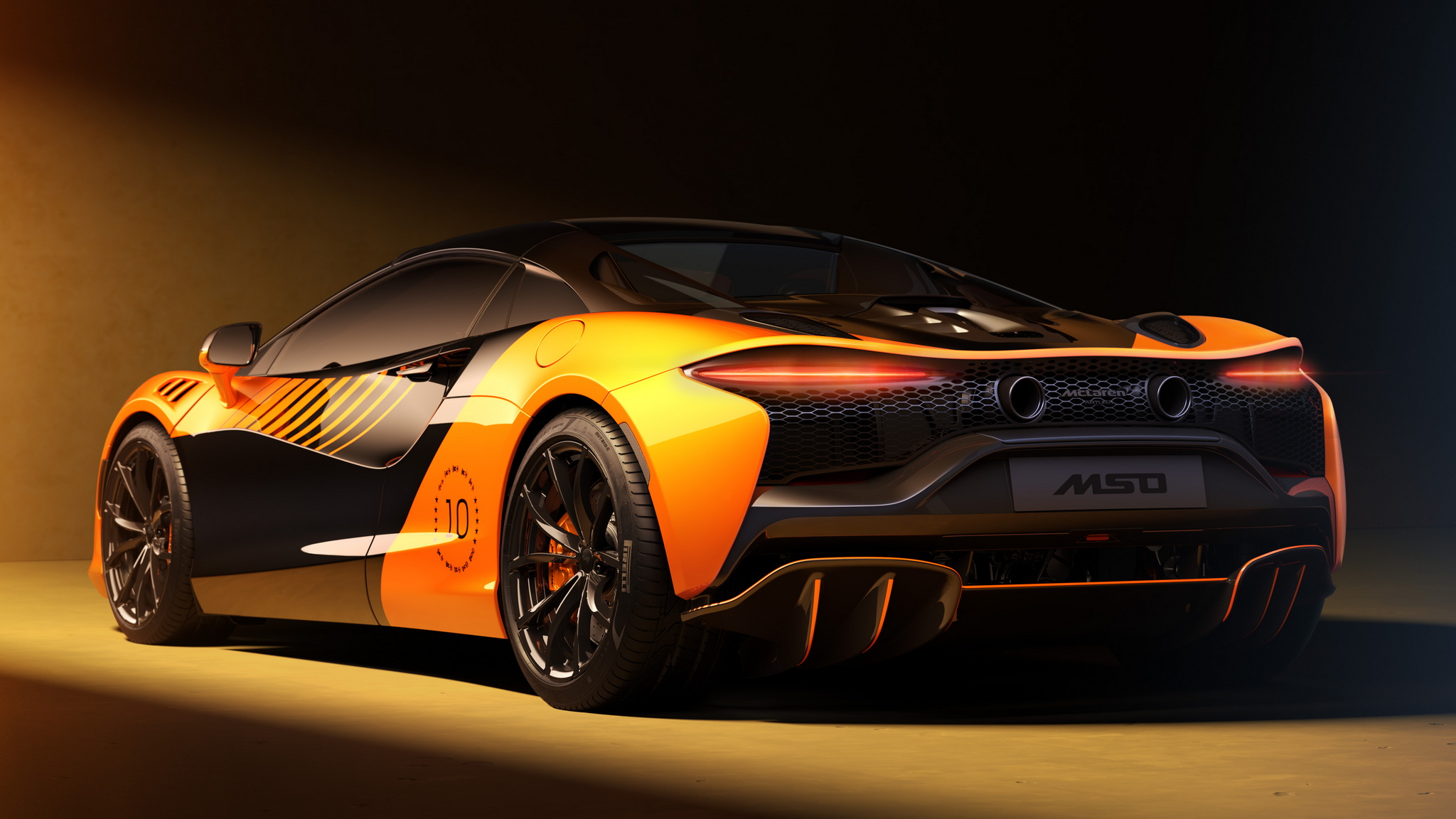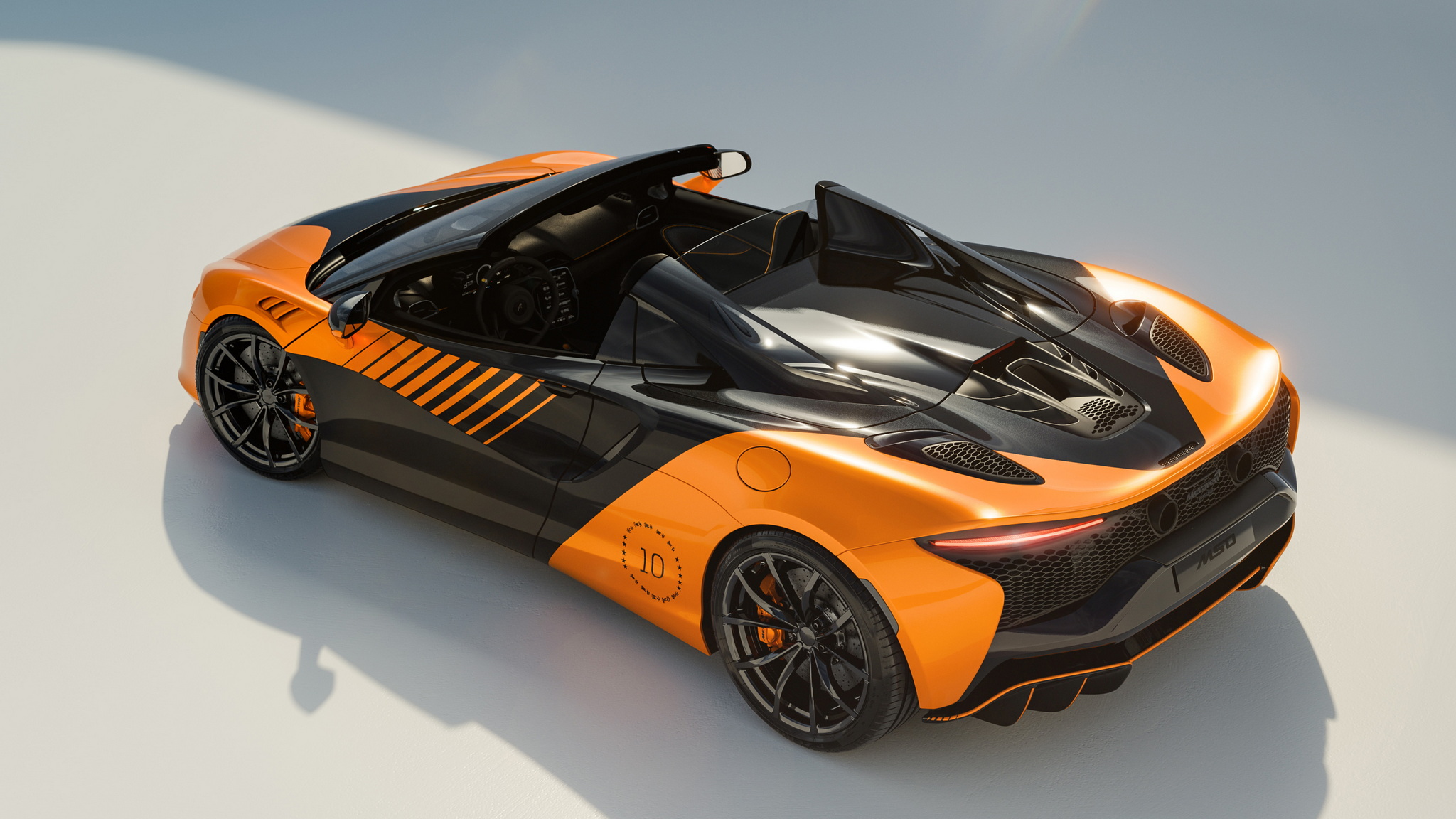 ห้องโดยสารเลือกใช้หนัง Nappa สีดำ Jet Black สลับกับ Alcantara สีดำ Carbon Black ตัดด้วยเดินด้ายสีส้ม McLaren Vision Orange มีการปักเลข “10” บนพนักศีรษะ พวงมาลัยมีสัญลักษณ์พิเศษ พร้อมแผ่นป้ายที่ระลึก และลายเซ็นของนักขับ F1 อย่าง Lando Norris และ Oscar Piastri บนธรณีประตูรถ รวมถึงลูกค้าแต่ละรายจะได้ของที่ระลึกสุดพิเศษที่ควรค่าแก่การสะสม