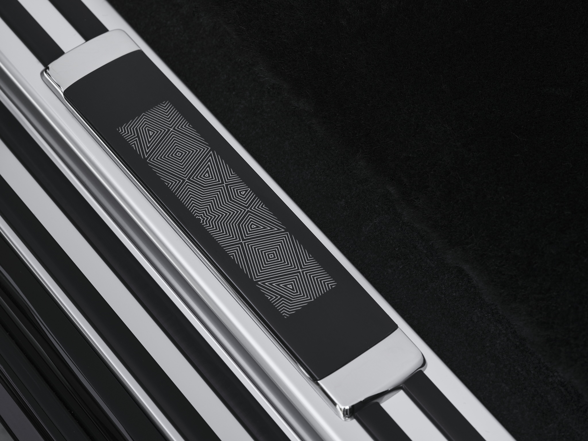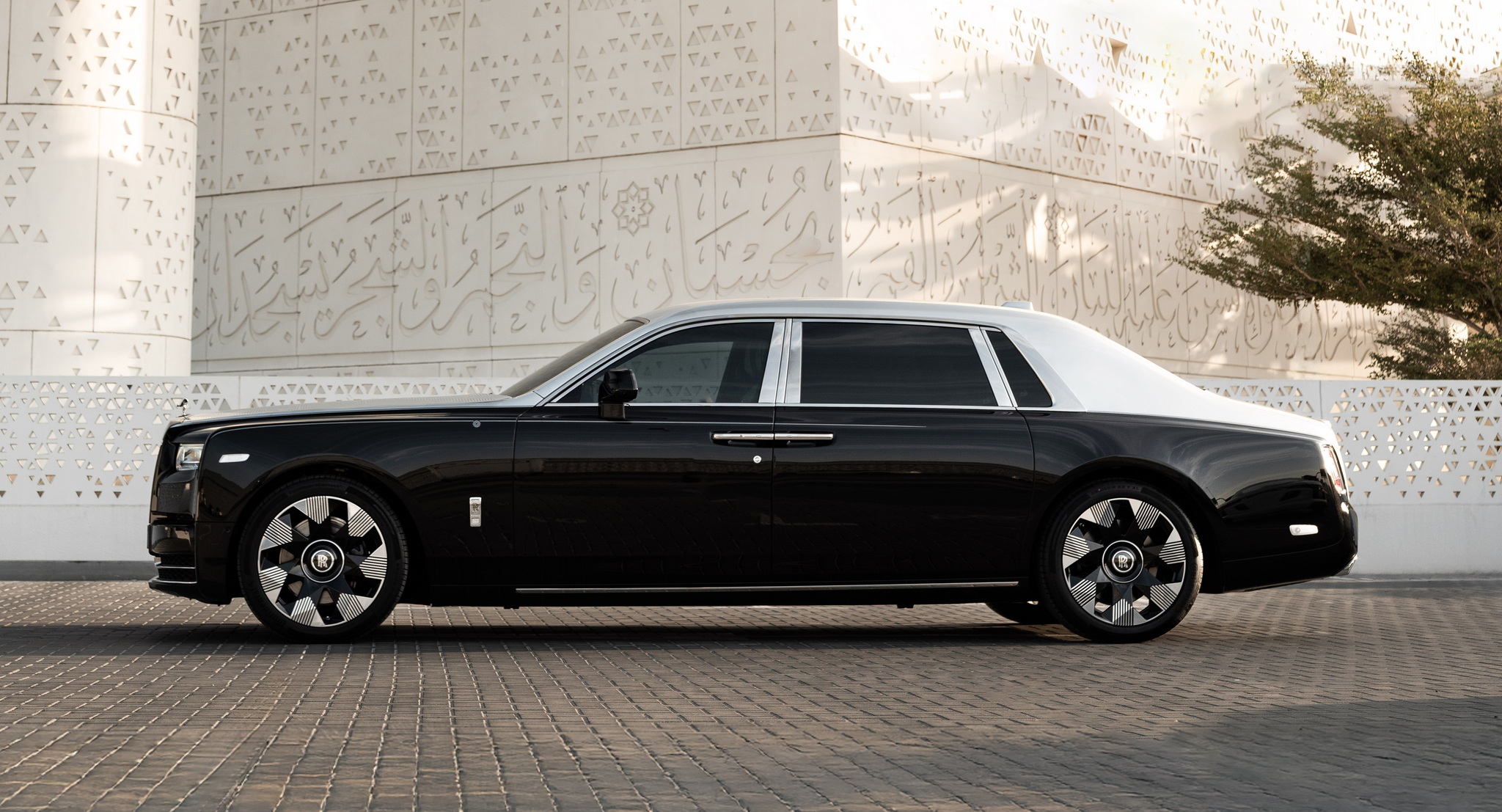 ตัวถังรถมาแบบทูโทนด้วยตัวถังสีดำ Diamond Black ตัดกับส่วนบนสีเงิน Silver เส้นโค้ชไลน์สีเงินพาดยาวอย่างสง่างาม ภายในห้องโดยสารยังแสดงความหรูหราผ่าน “Phantom Gallery” บนคอนโซลหน้าที่ตกแต่งด้วยงานมาร์เกตรีจากไม้ Blackwood และ Black Bolivar สะท้อนลวดลาย mashrabiya อันประณีต เบาะหุ้มหนังแท้โทน Selby Grey และ Black พร้อมลายปักที่พนักศีรษะในธีมเดียวกัน เสริมด้วย Starlight Doors แผงข้างประตูประดับไฟเสมือนหมู่ดาวบนท้องฟ้ายามค่ำคืน และเพลทเรืองแสงบริเวณธรณีประตูที่สลักลวดลายแบบเดียวกับฝากระโปรงหน้า