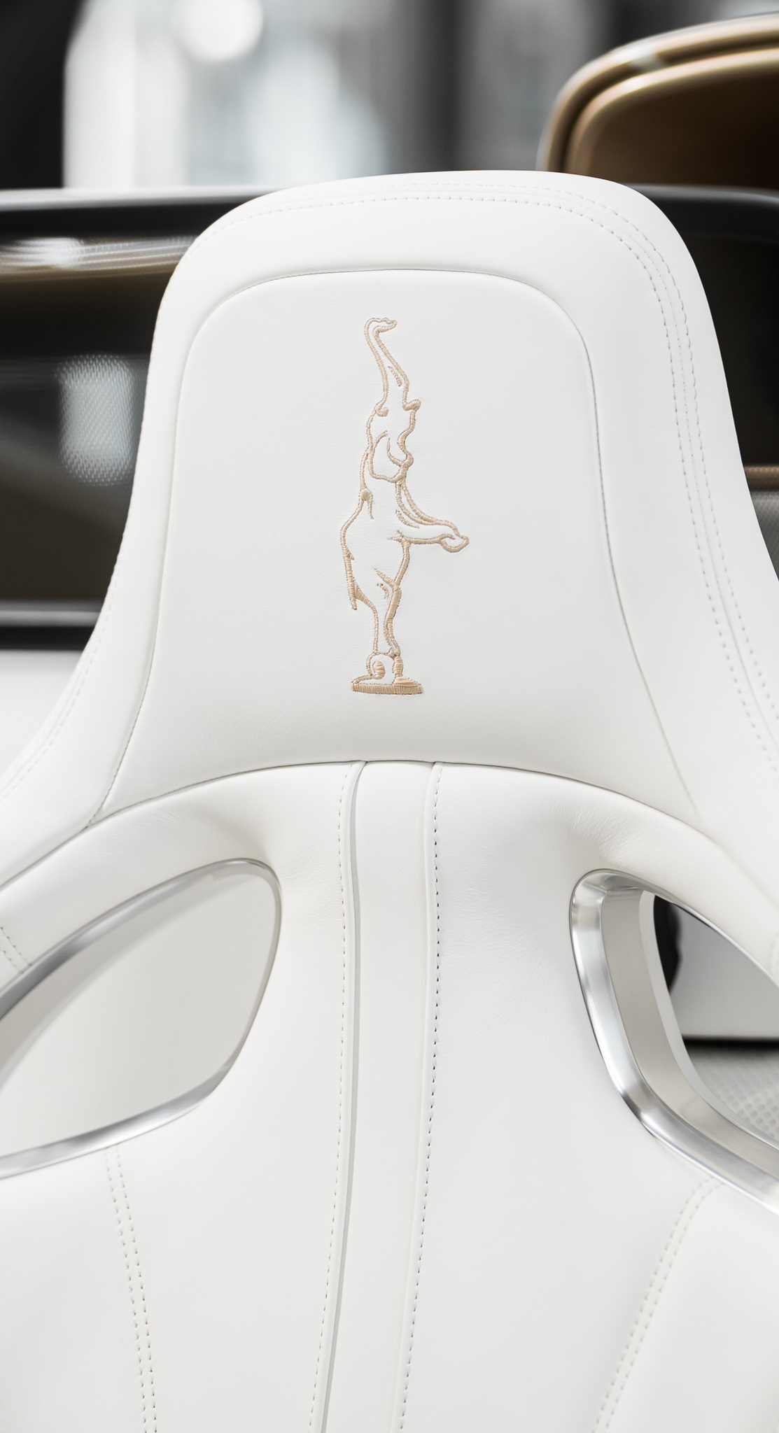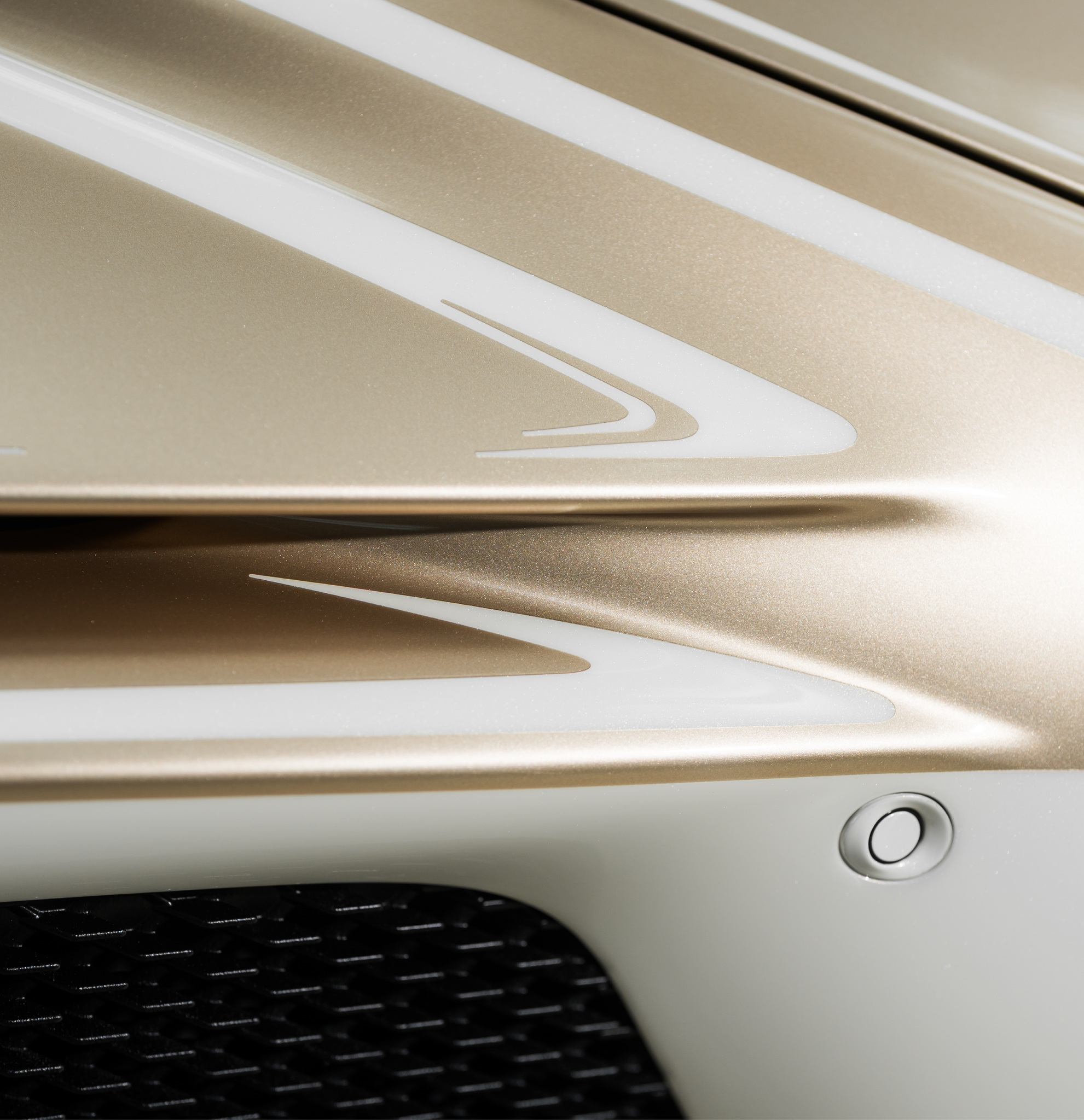 ตัวถังภายนอกมาในแบบทูโทนด้วยสีขาวอบอุ่นตัดกับสีทองนุ่มนวลหรูหรา พร้อมงานลวดลายเพนต์มือ ‘Vagues de Lumière’ อันโด่งดังของแบรนด์ เสมือนคลื่นแสงผาดผ่านตัวรถอย่างรวดเร็ว ล้อก็ทูโทนสีขาวตัดทองกลมกลืนไปกับตัวถัง