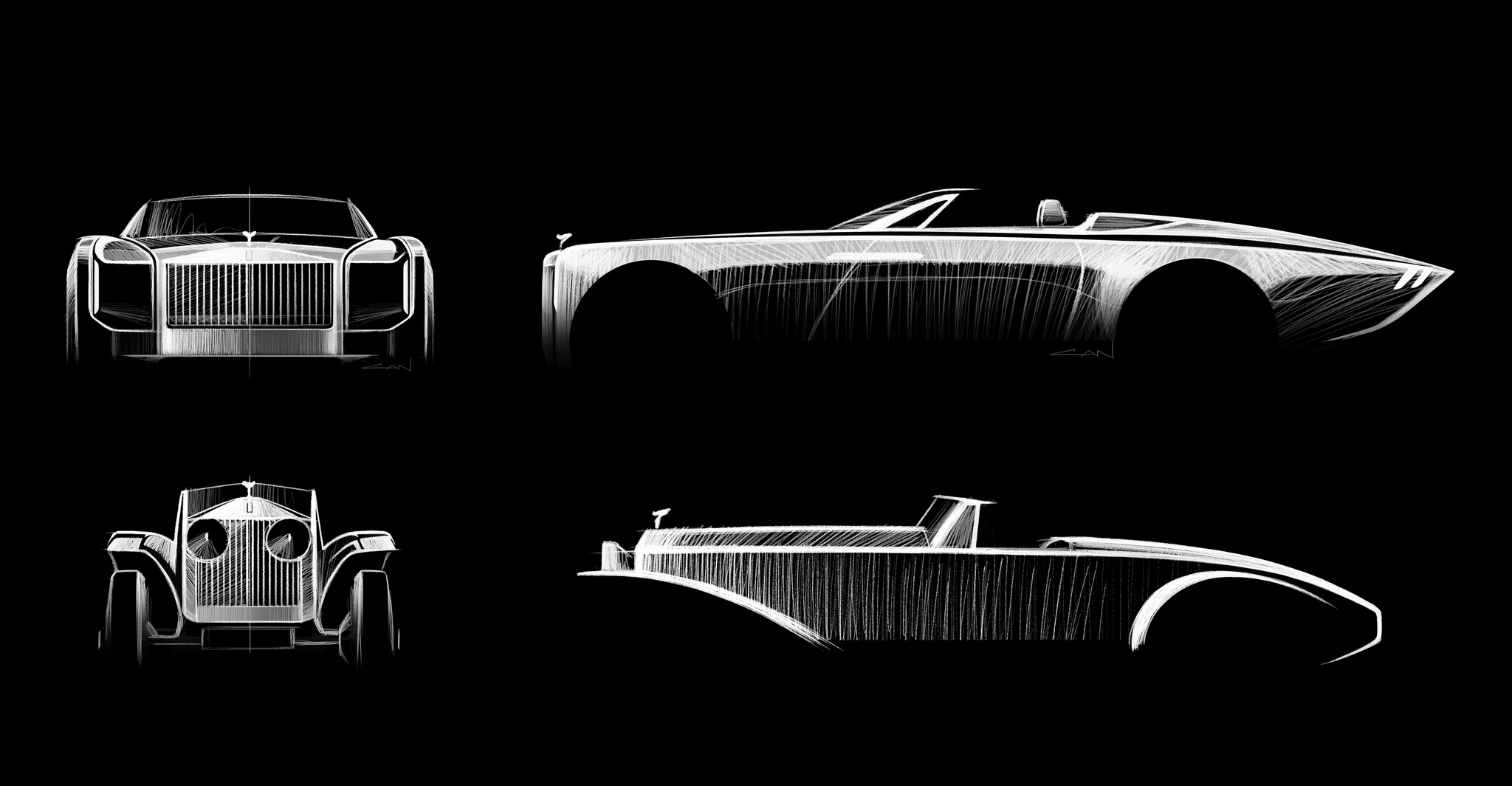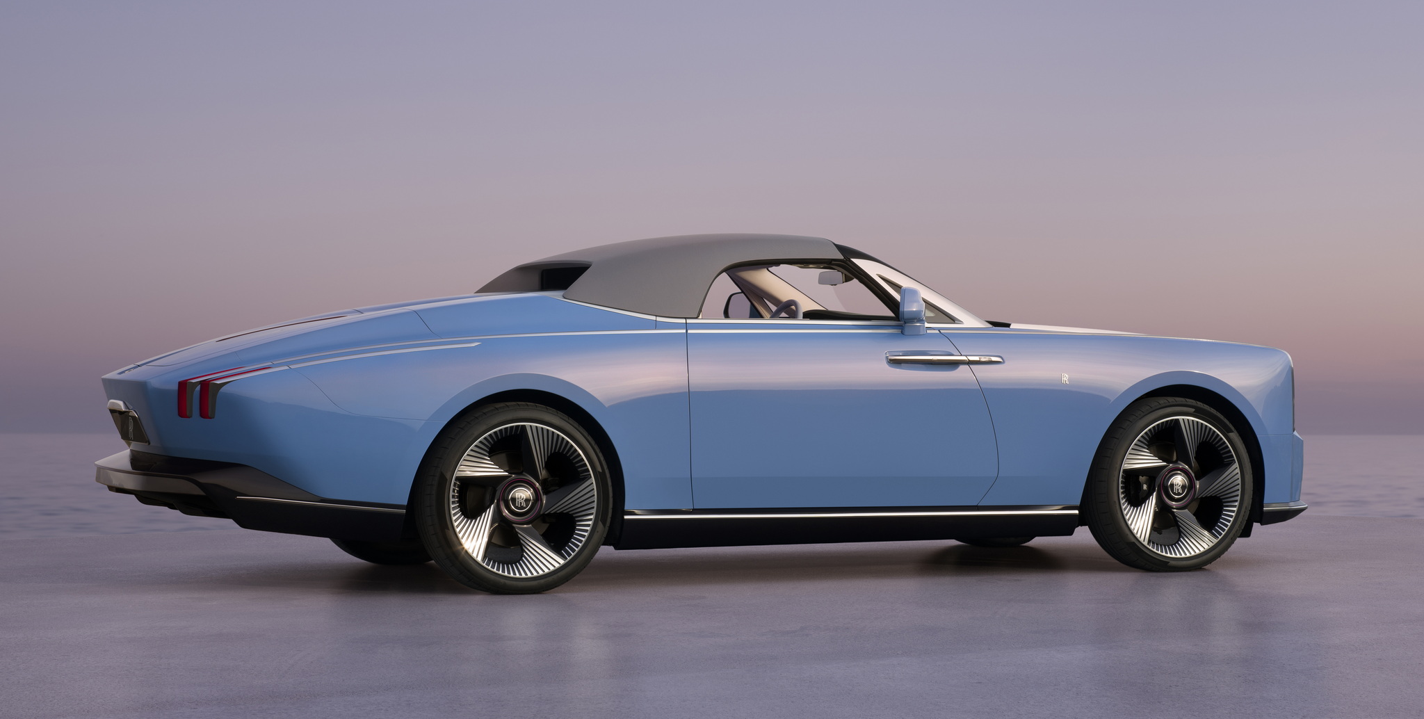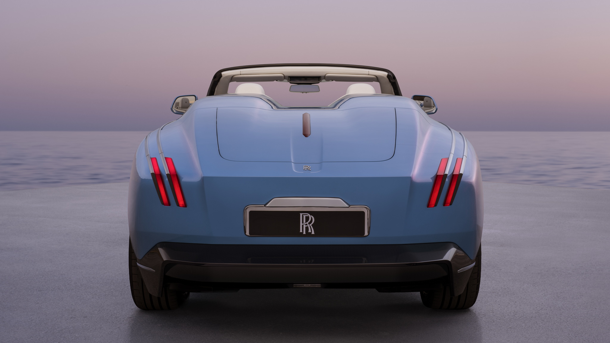 มันคือรถเปิดประทุน 2 ที่นั่งขนาดมหึมาด้วยความยาว 5.76 เมตร พอๆ กับ Phantom ขับเคลื่อนแบบไฟฟ้า 100% โครงสร้างรถแบบอลูมิเนียมสเปซเฟรม ตัวถังภายนอกมาในสีฟ้าอ่อน Côte d’Azur Blue ที่ผสมเกล็ดสีแดงขนาดละเอียด เมื่อกระทบแสงจะเห็นประกายหรูหรานุ่มนวล กระจังหน้า Pantheon ใหญ่โตกว้างเกือบ 1 เมตร รวมเป็นชุดเดียวกับนางฟ้า Spirit of Ecstasy ไม่มีไฟเรืองแสงในแผงกระจังหน้าเพื่อคงความคลาสสิค ตั้งแต่บริเวณชุดไฟหน้าทรงเรียวเล็กยังมีการคาดเส้นสเตนเลสขัดเงาลากยาวต่อเนื่องตามเส้นสายรถไปจนถึงชุดไฟท้ายดูสง่างาม ล้อใหญ่ถึง 24 นิ้ว ใหญ่ที่สุดเท่าที่ Rolls-Royce เคยติดตั้ง ลายล้อได้แรงบันดาลใจจากใบพัดของเรือยอชต์เมื่อมองจากใต้น้ำ พื้นผิวล้อยังตกแต่งด้วยลายเส้นที่กลึงอย่างละเอียด สร้างภาพลวงตาคล้ายล้อที่กำลังหมุนด้วยความเร็วสูง