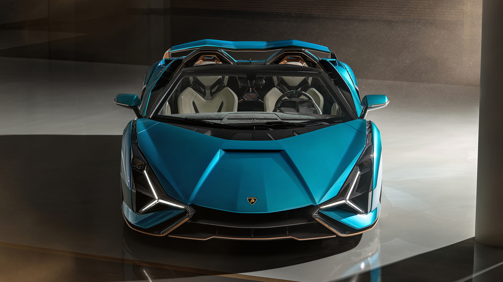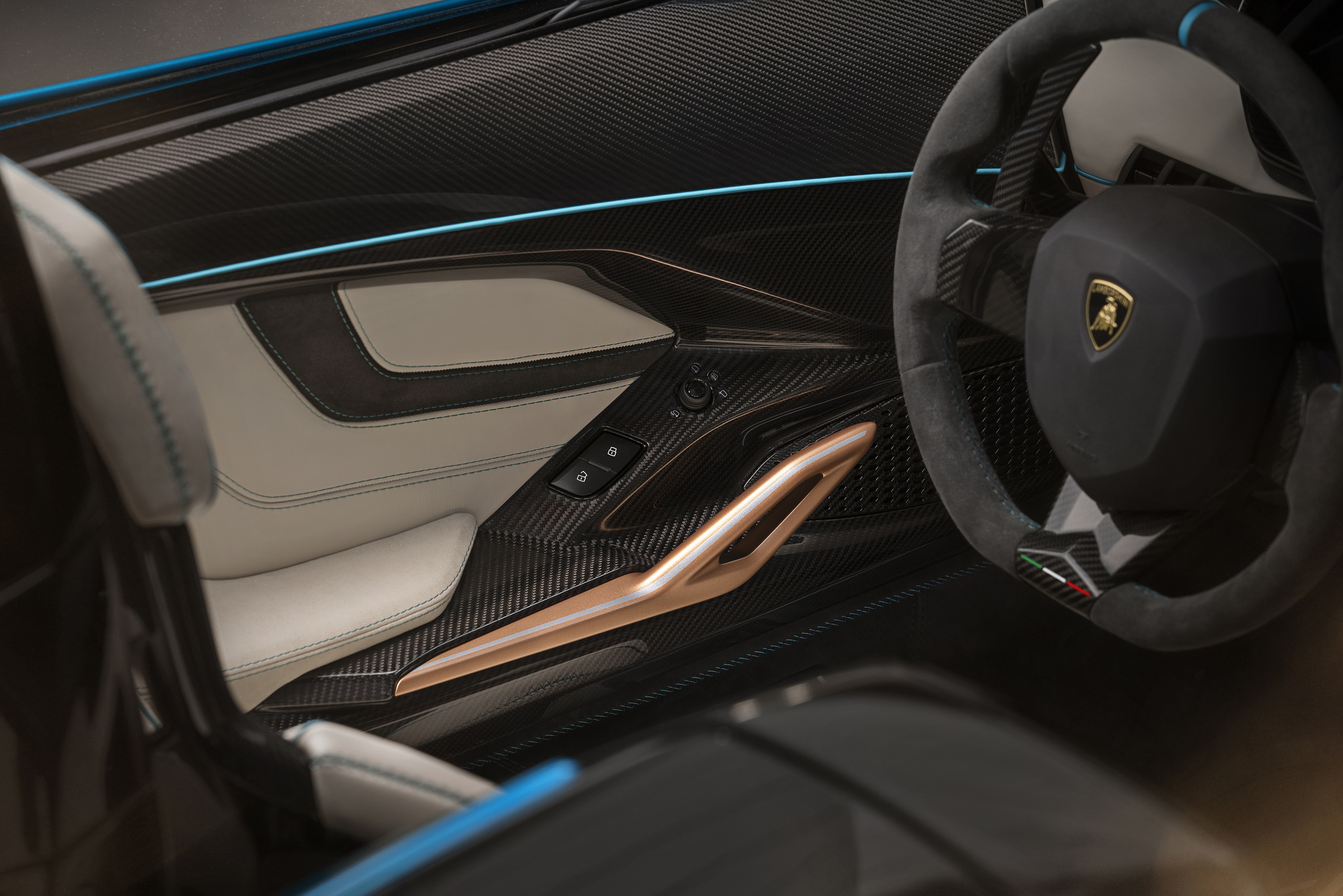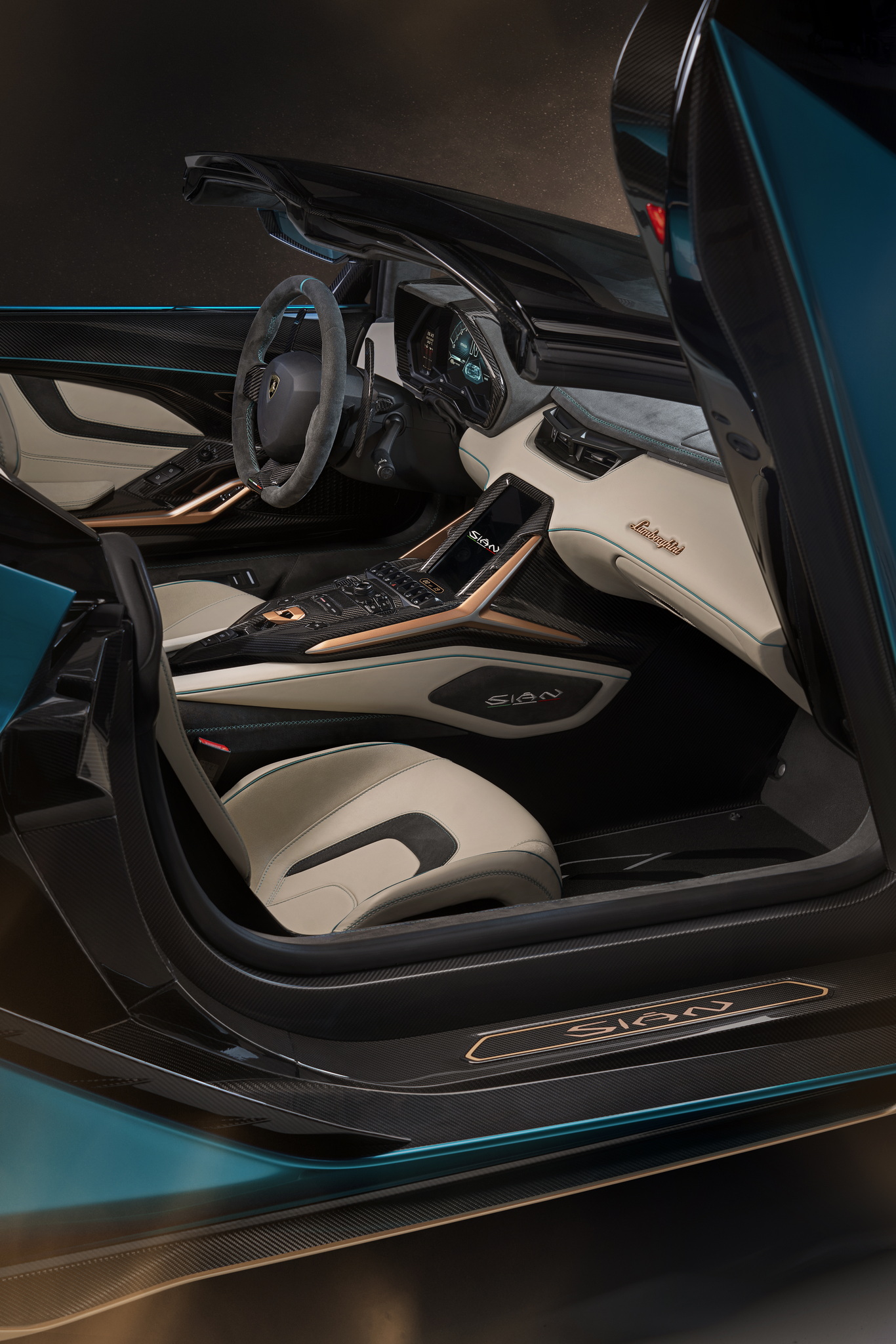 ภายในห้องโดยสารหรูล้ำเช่นเคย การตกแต่งมีการใช้อลูมิเนียมสีทอง Oro Erectrum ซึ่งจะเป็นตัวบ่งบอกเลยว่านี่แหละ คือรถไฮบริดจาก Lamborghini โทนสีเบาะแผงประตู คอนโซล สามารถเลือกสีวัสดุตามใจชอบ ช่องแอร์ตรงกลางมีการปรับดีไซน์ใหม่ผ่าน 3D Printing จอทัชสกรีนส่วนกลาง HMI ให้มาเช่นเคย สำหรับควบคุมความบันเทิงเชื่อมต่อสมาร์ทโฟน ดูการตั้งค่าต่างๆ ของรถ ข้อมูลการจราจร Real-time รวมไปถึงระบบ Telemetry เอาไว้ใช้ในสนามแข่ง