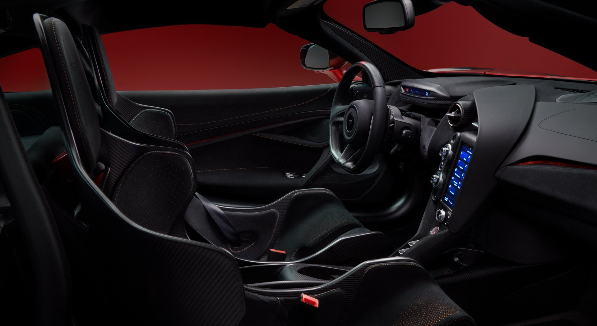 765LT STRATA ผลงานชิ้นใหม่จากแผนก MSO ตัวถังถูกผสาน 3 เฉดสีเข้าไว้ด้วยกัน ใช้เวลาในการทำกว่า 450 ชั่วโมง เริ่มจากการลงสีส้ม MSO Heritage Azores แบบทั่วทั้งคัน จากนั้นจะทำการผสมสีแดง MSO Heritage Memphis Red ไล่จากฝากระโปรงหน้าขึ้นไปเรื่อยๆ เผยให้เห็นการไล่ระดับสี ส่วนจุดที่เป็นที่ดำจะใช้สี MSO Bespoke Cherry Black ถ้ามองใกล้ๆ จะเห็นเป็นเม็ดประกายสีแดง และลายเส้นที่อยู่ข้างบานประตูได้แรงบันดาลใจจากรถ McLaren F1 ถูกทำขึ้นด้วยมืออย่างละเอียด ชิ้นส่วนต่างๆ ด้านแอร์โร ยังคงในแบบ 765LT ดั้งเดิม แต่มีจุดนึงที่เพิ่มเข้าคือ Scoop ดักลมที่ถูกหลอมรวมอยู่กับบานกระจกหลัง ทำหน้าที่ส่งลมเข้าไประบายความร้อนเครื่อง V8 โดยตรง คุณสามารถมองเห็นท่อที่เป็นวัสดุคาร์บอนไฟเบอร์ได้จากภายในรถอีกด้วย เกือบลืมในส่วนคาลิปเปอร์เบรกก็ถูกไล่เฉดสีจากหน้าไปหลังด้วยนะ