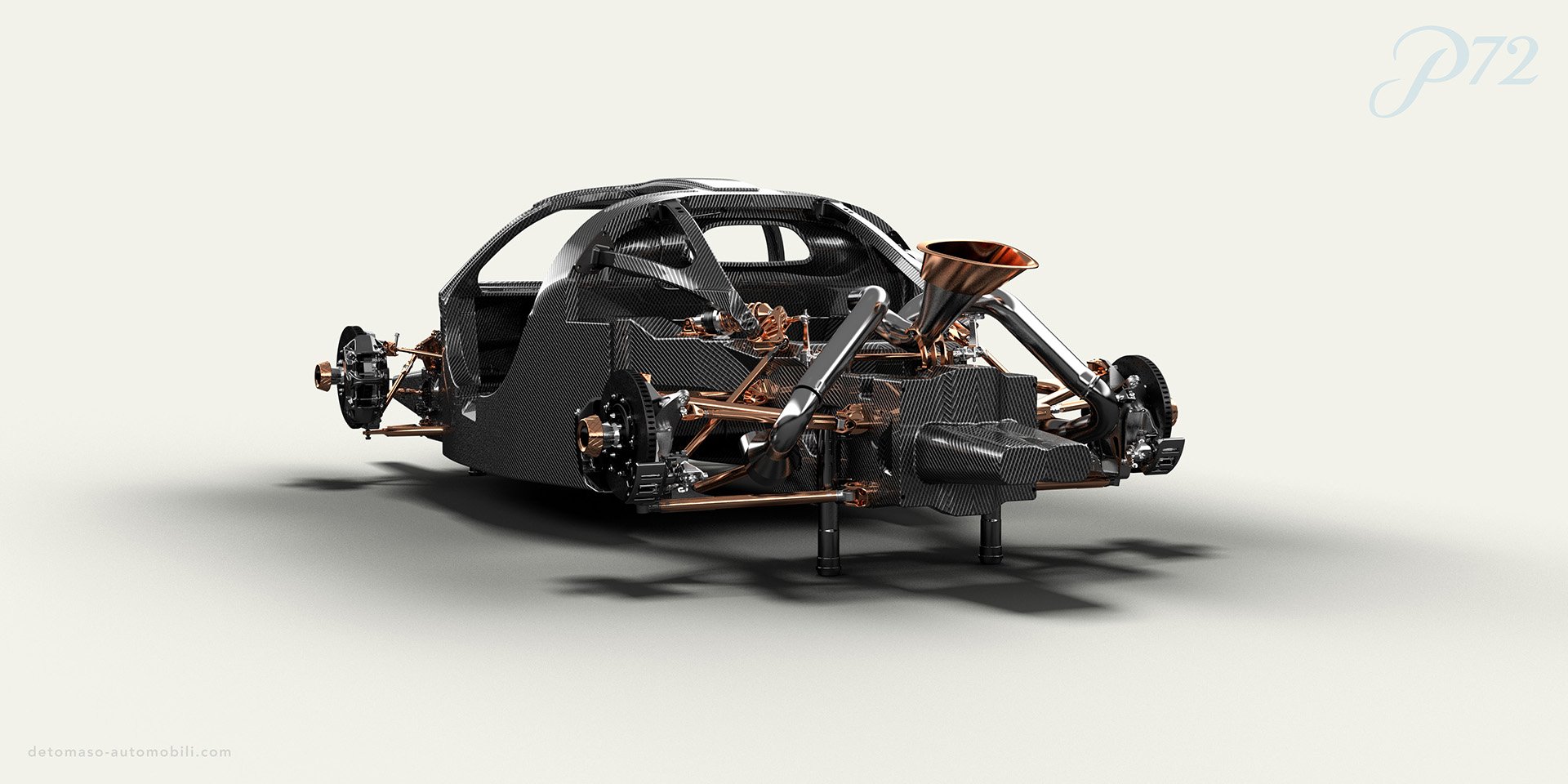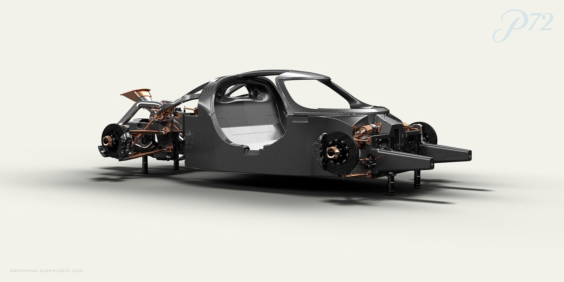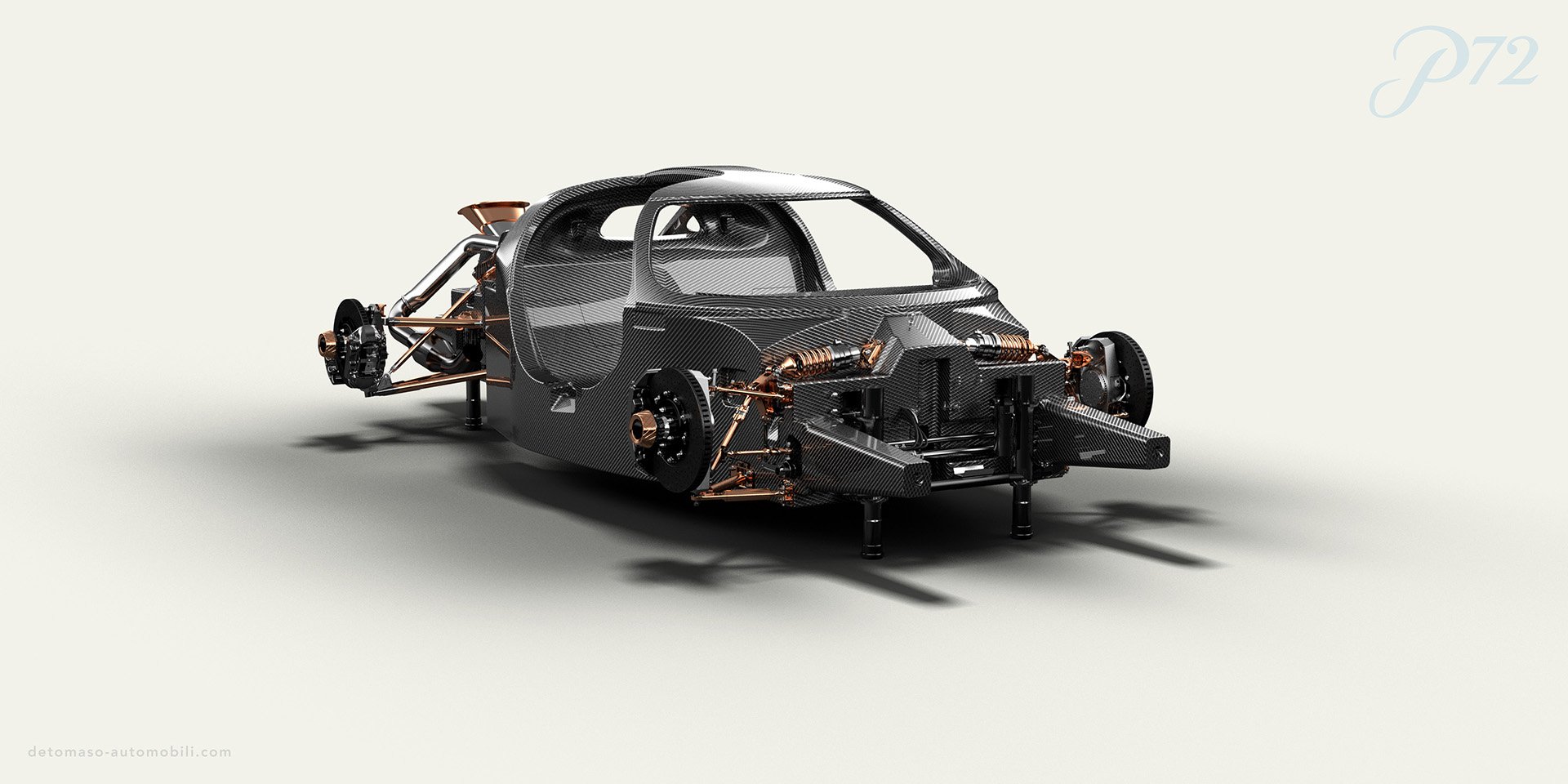 De Tomaso P72 ตัวแซสซีส์ผลิตจากคาร์บอนไฟเบอร์ทั้งหมด ดึงมาจากไฮเปอร์คาร์ทรงล้ำ Apollo IE ซึ่งความแข็งแกร่งโครงสร้างเป็นไปตามข้อกำหนดของ FIA มั่นใจหายห่วง รูปลักษณ์ของ P72 ได้แรงบันดาลใจมาจากยุค 60 อย่างรถแข่งรุ่น sport 1000, sport 2000 และ P70 มาขัดเกลาจนเป็น P72 ที่ดูมีความ Timeless เหนือกาลเวลา เส้นสายตัวรถที่ดูพลิ้วไหว กระจกมองข้างทรงกลมสุดคลาสิค บวกซุ้มล้อขนาดใหญ่ช่วยเพิ่มความน่าเกรงขามให้ตัวรถได้อย่างดี ความสวยงามนี้ ยังมาพร้อมอากาศพลศาสตร์ที่ดีเยี่ยม