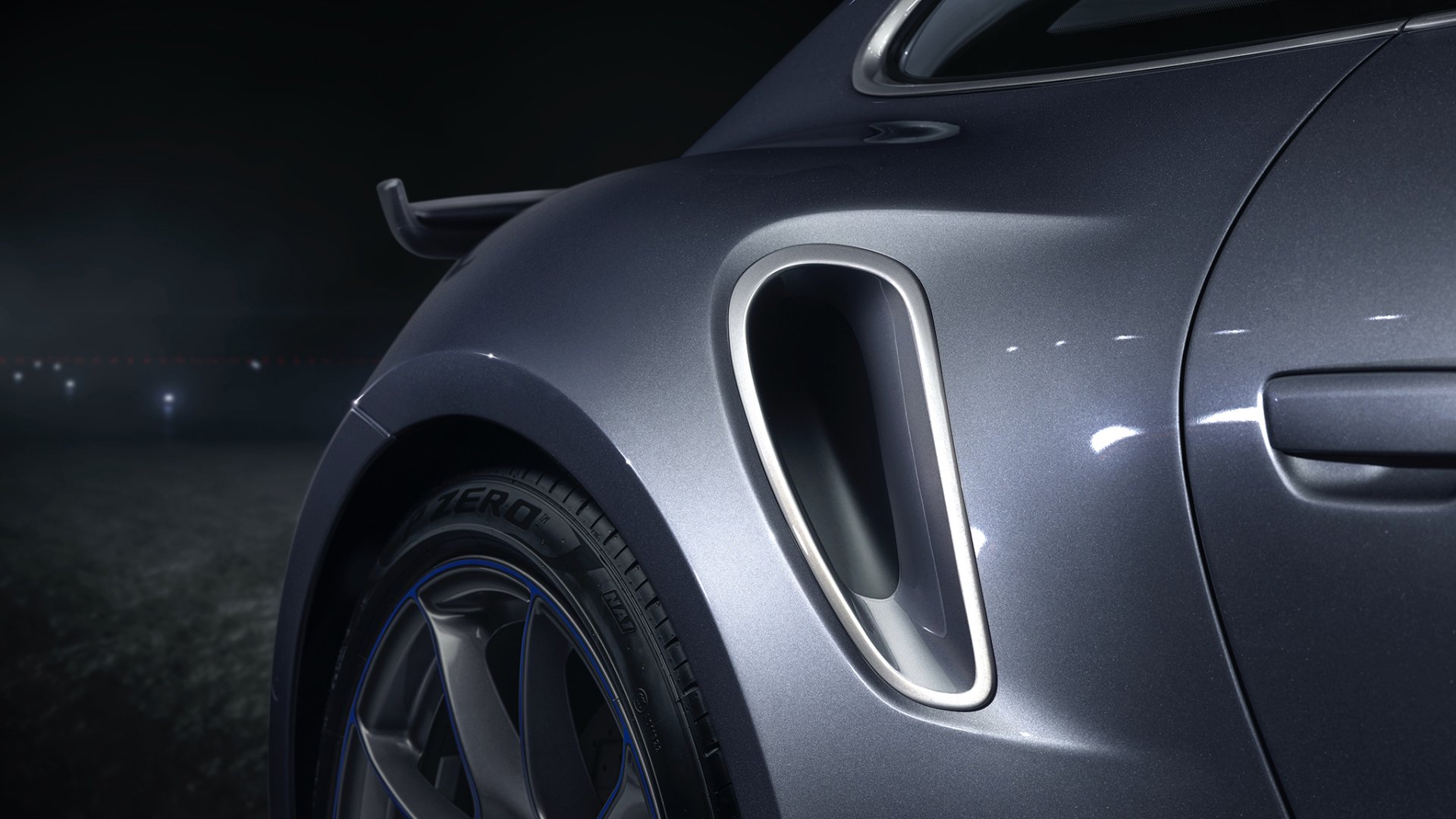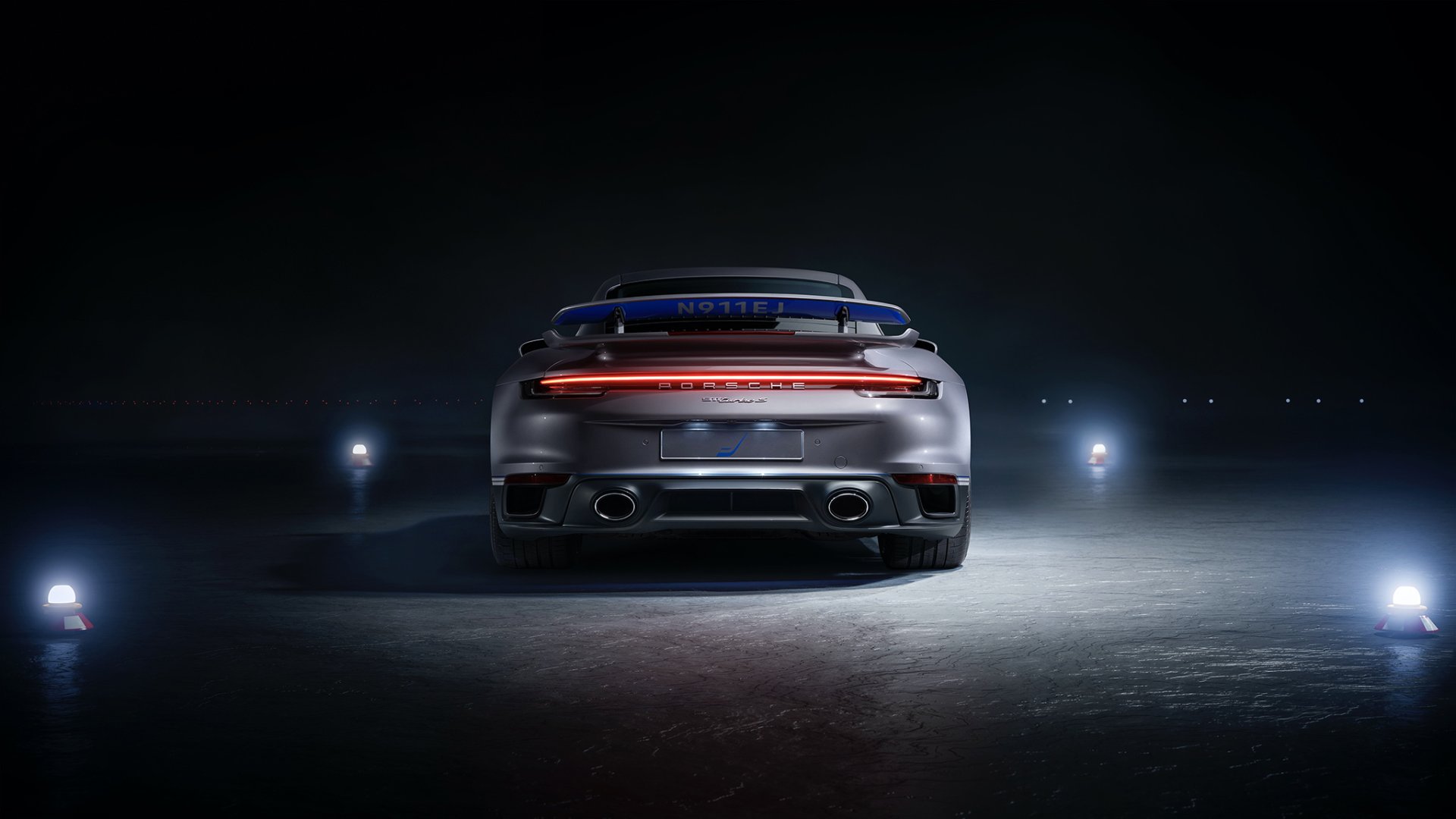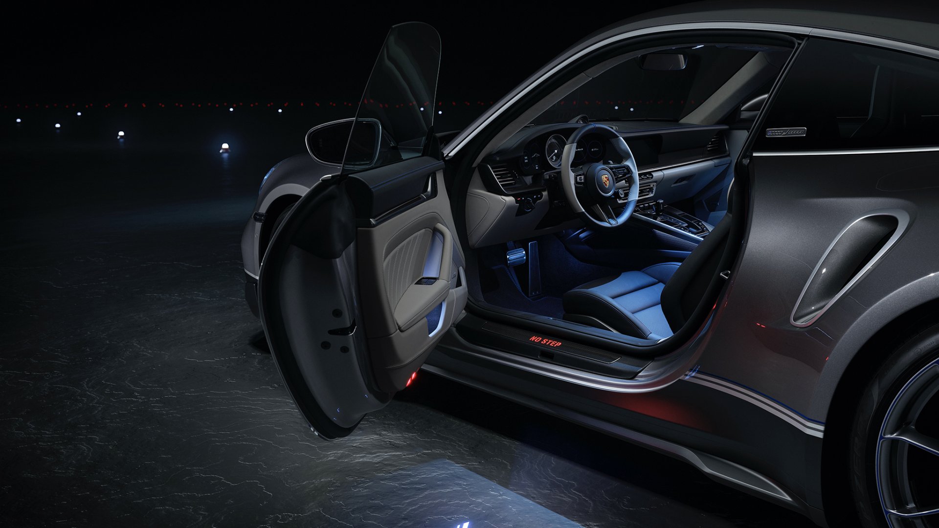 แน่นอนมันมาแบบแพ๊คคู่ นั่นหมายถึงคุณจะต้องซื้อเครื่องบินเจ๊ทส่วนตัว Phenom 300E ซะก่อนถึงจะครอบครอง 911 Turbo S คันนี้ได้ (สเปคเครื่องบินเจ๊ท อ่านด้านล่างสุด) ก่อนอื่นเราจะได้รับกุญแจรถสี Speed Blue พร้อมหมายเลข N911EJ ที่ประทับอยู่บนเครื่องเจ๊ท ตัวรถกับเครื่องบินเจ๊ท จะใช้สีทูโทนแบบเดียวกัน คือ สีเงินเมทัลลิก Platinum Silver ตัดส่วนล่างด้วยสีเทาด้าน Matt Jet Grey คาดเส้นแถบสี Brilliant Chrome และ Speed Blue ที่ผ่านการเคลือบแบบพิเศษ ด้านแอร์โรไดนามิกมีการใส่ออฟชั่น SportDesign Package ที่ทำให้ตัวรถหล่อขึ้น ด้วยกันชนหน้าที่เสริมครีบด้านข้างเหมือนปีกเครื่องบิน, สเกิร์ตข้าง และสปอยเลอร์ท้ายแบบยึดตายตัวที่มีปีกแบบ Active ซ้อนอยู่ ใช้สี Speed Blue พร้อมหมายเลข N911EJ ซ่อนเอาไว้ด้วย ส่วนล้ออัลลอยให้ลาย Exclusive สีเมทัลลิก Platinum Silver เสริมเด่นที่ขอบและก้านด้วยสีน้ำเงิน Speed Blue