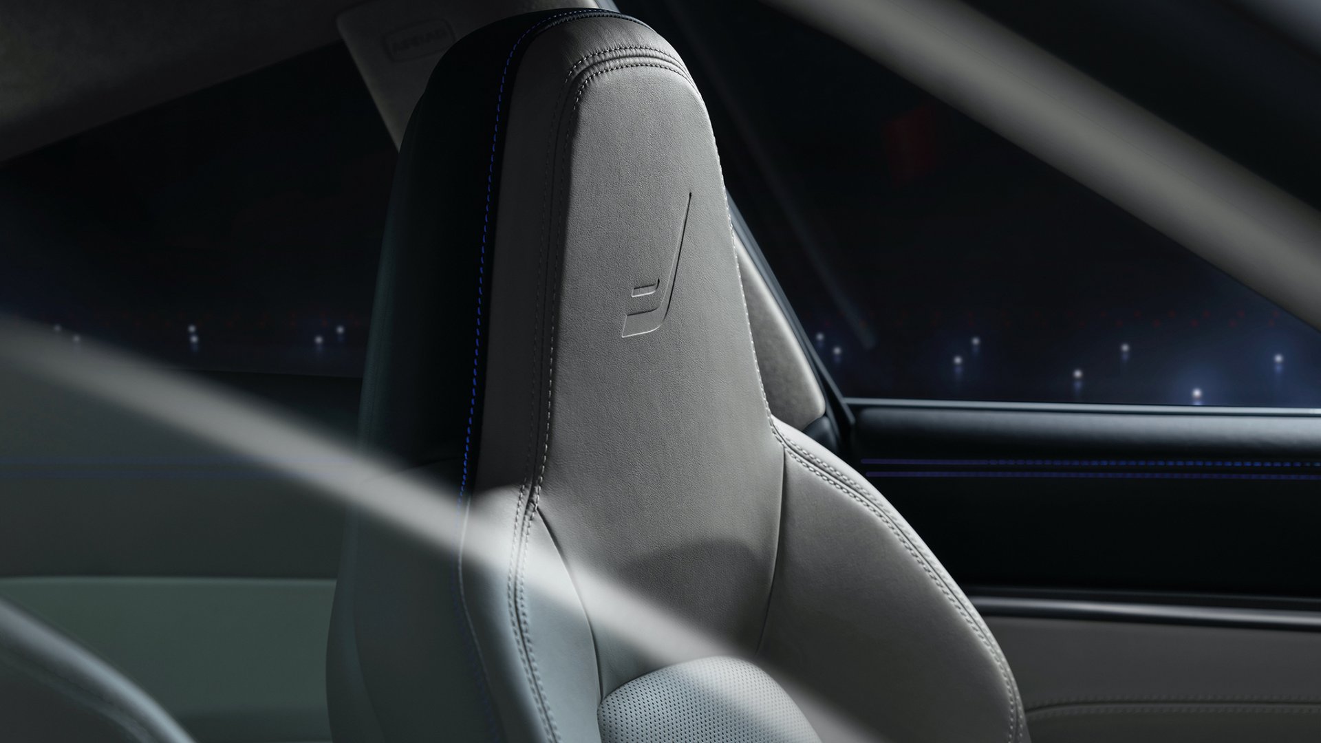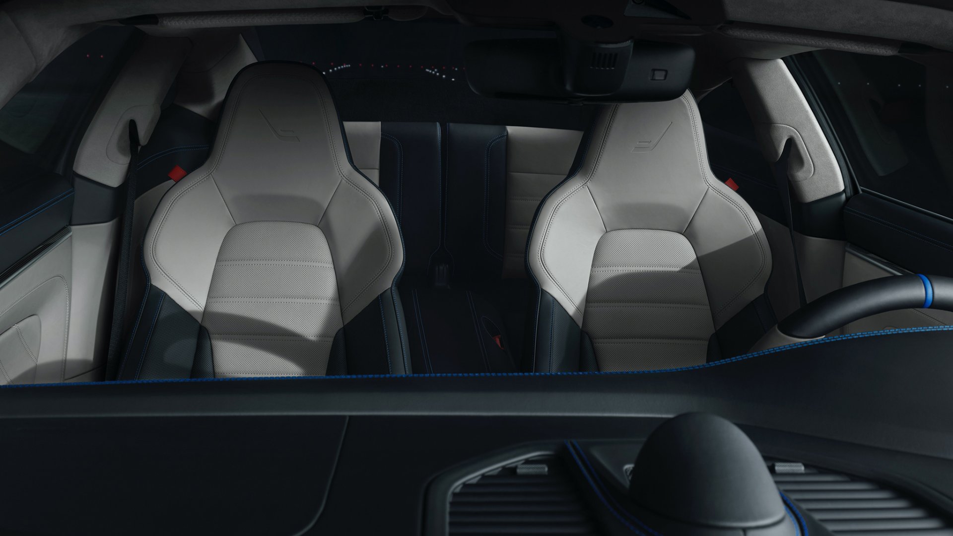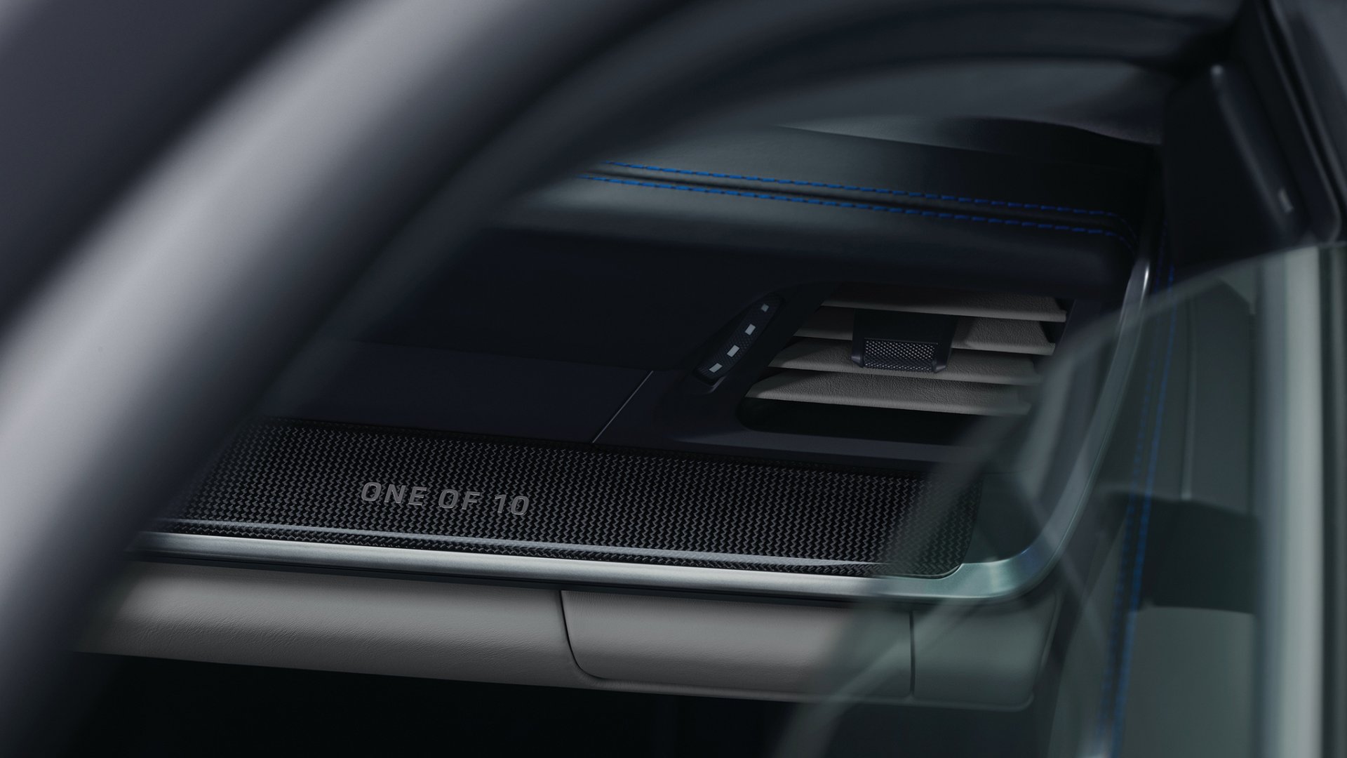 มาที่ภายในยังคงสไตล์ในแบบเครื่องบินเช่นกัน โดดเด่นตั้งแต่ก้าวเข้ามา ด้วยคิ้วบันไดคาร์บอนฯ เรืองแสงสีแดงคำว่า “No step” นาฬิกาจับเวลา Sport Chrono ดีไซน์พิเศษ โดยรอบห้องโดยสารเน้นไปที่หนังแท้ ใช้สีทูโทนเฉดพิเศษ คือสีดำ กับสีขาวชอล์ค ส่วนที่เป็นสีดำจะเพิ่มความเด่นด้วยด้ายสีน้ำเงิน Speed Blue แผงคอนโซลแบบคาร์บอนไฟเบอร์มันเงา ฝั่งผู้โดยสารมีระบุเลข 1 OF 10 ไว้ และเบาะนั่งมีโลโก้พิเศษที่ออกแบบร่วมกันของทั้ง 2 ค่าย