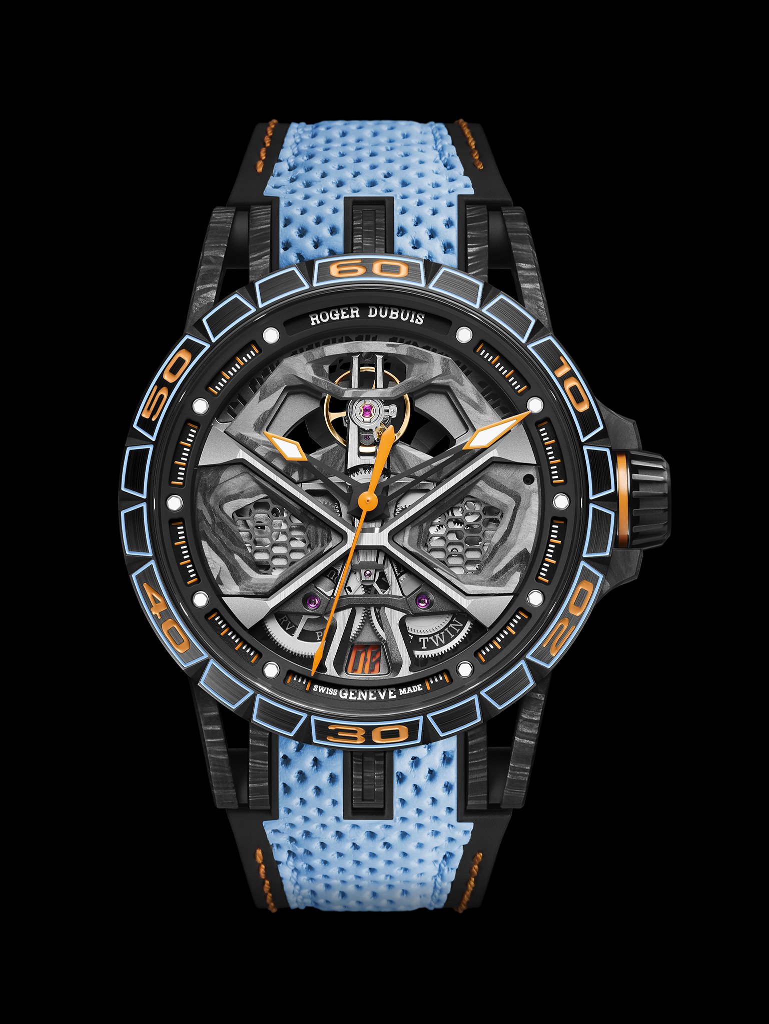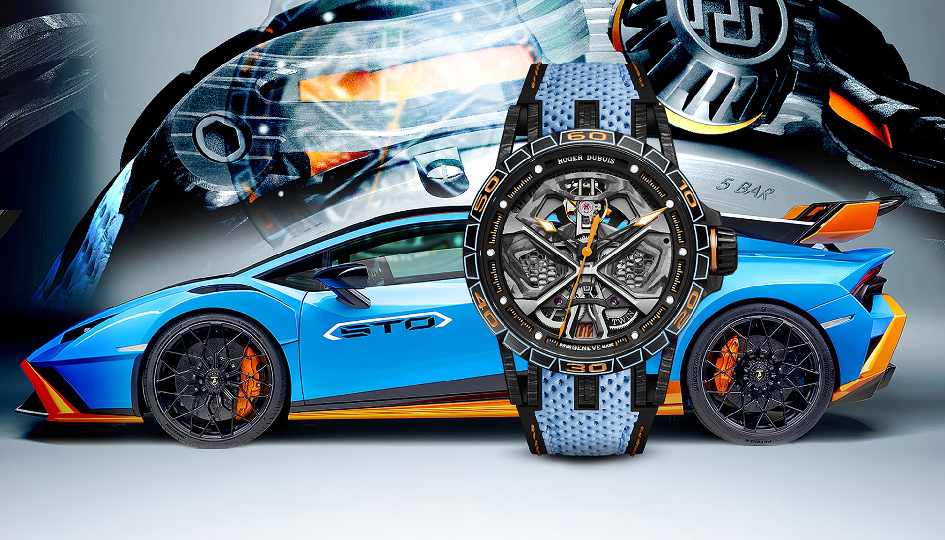 Roger Dubuis (โรเช่ย์ ดูบุยส์) นั้นเป็นพาร์ทเนอร์กับทาง Lamborghini จึงไม่แปลกที่เราจะเห็นนาฬิการุ่นพิเศษออกมาอย่างหลากหลายรุ่น โดยรุ่นใหม่ล่าสุดที่เราจะพูดถึงคือรุ่น Excaliber Spider Huracán STO ที่ตัวเรือน ลามไปถึงชิ้นส่วนภายใน ไม่ว่าจะเป็นแท่นเครื่อง, กลไก Tourbillon (ตูบิยอง) ล้วนเป็นวัสดุคาร์บอนไฟเบอร์ ซึ่งถือผลิตได้ยากมาก Excaliber Spider Huracán STO ขับเคลื่อนด้วยกลไกออโตเมติก รุ่น RD630 ร่วมมือออกแบบกับทาง Lamborghini Squadra Corse ถูกวางทำมุมเอียง 12 องศา มีชิ้นส่วนกว่า 233 ชิ้น รวมถึงอัญมณีอีก 29 ชิ้น เมื่อมองจากใต้เครื่องจะเห็นงานดีไซน์เหมือนล้อแม๊ก กลไกมีความถี่ 28,800 vph หรือ 4 Hz และสามารถสำรองพลังงานลานได้ 60 ชั่วโมง