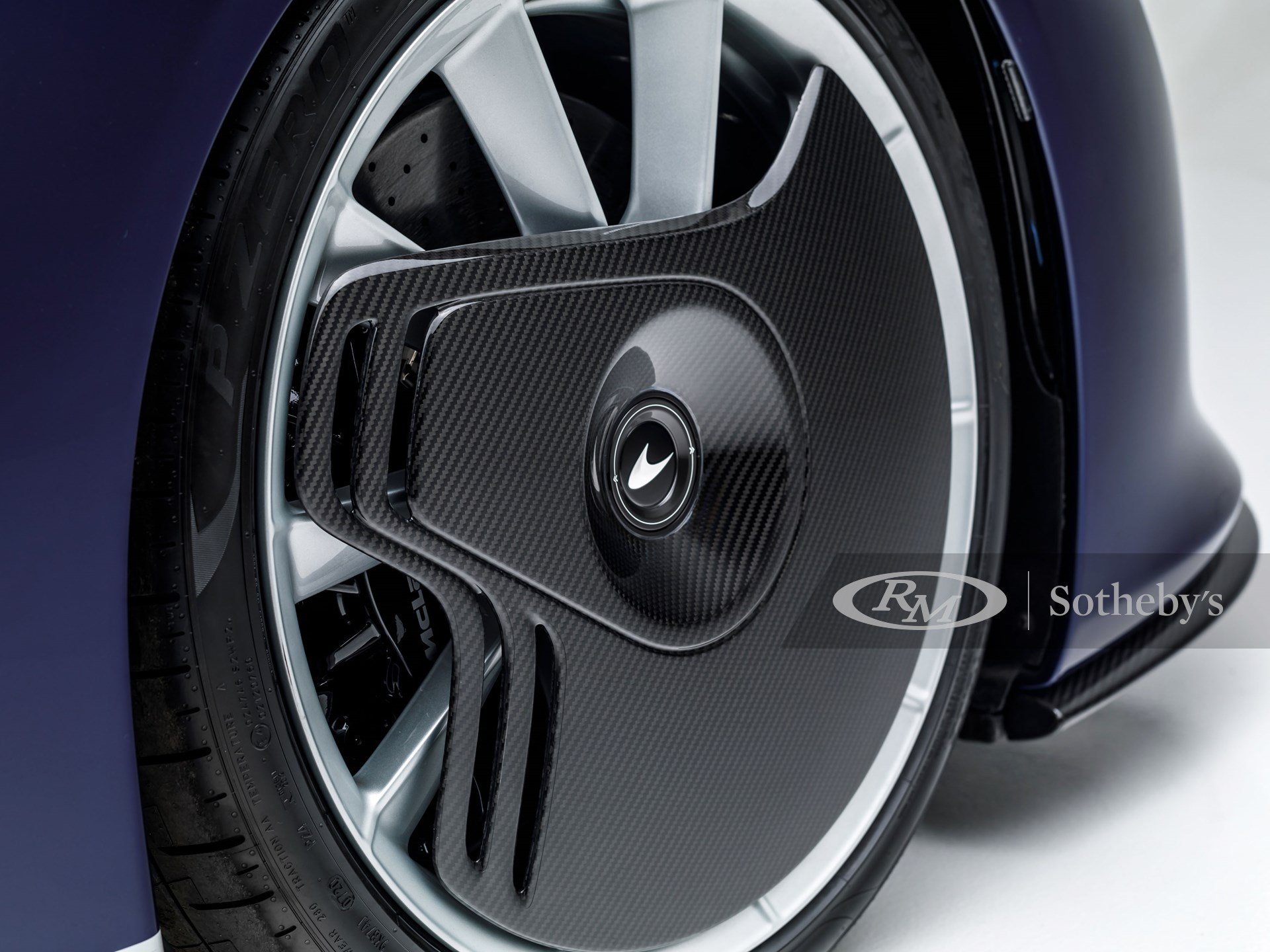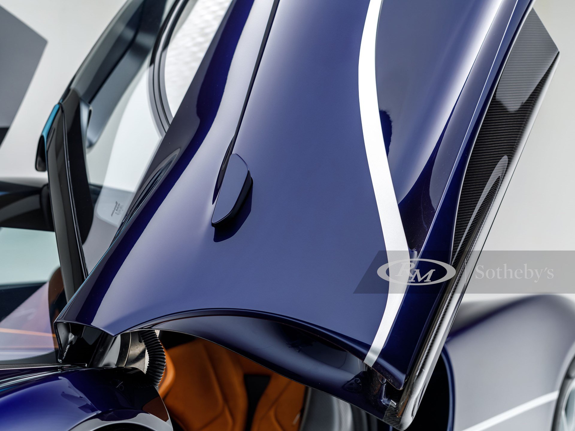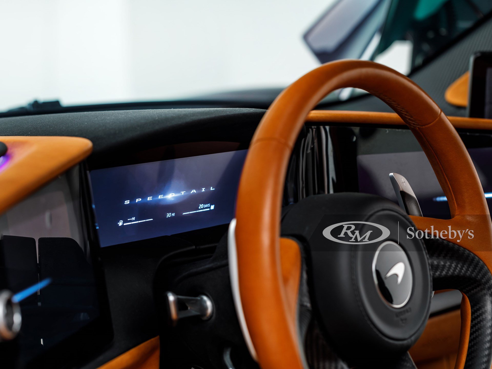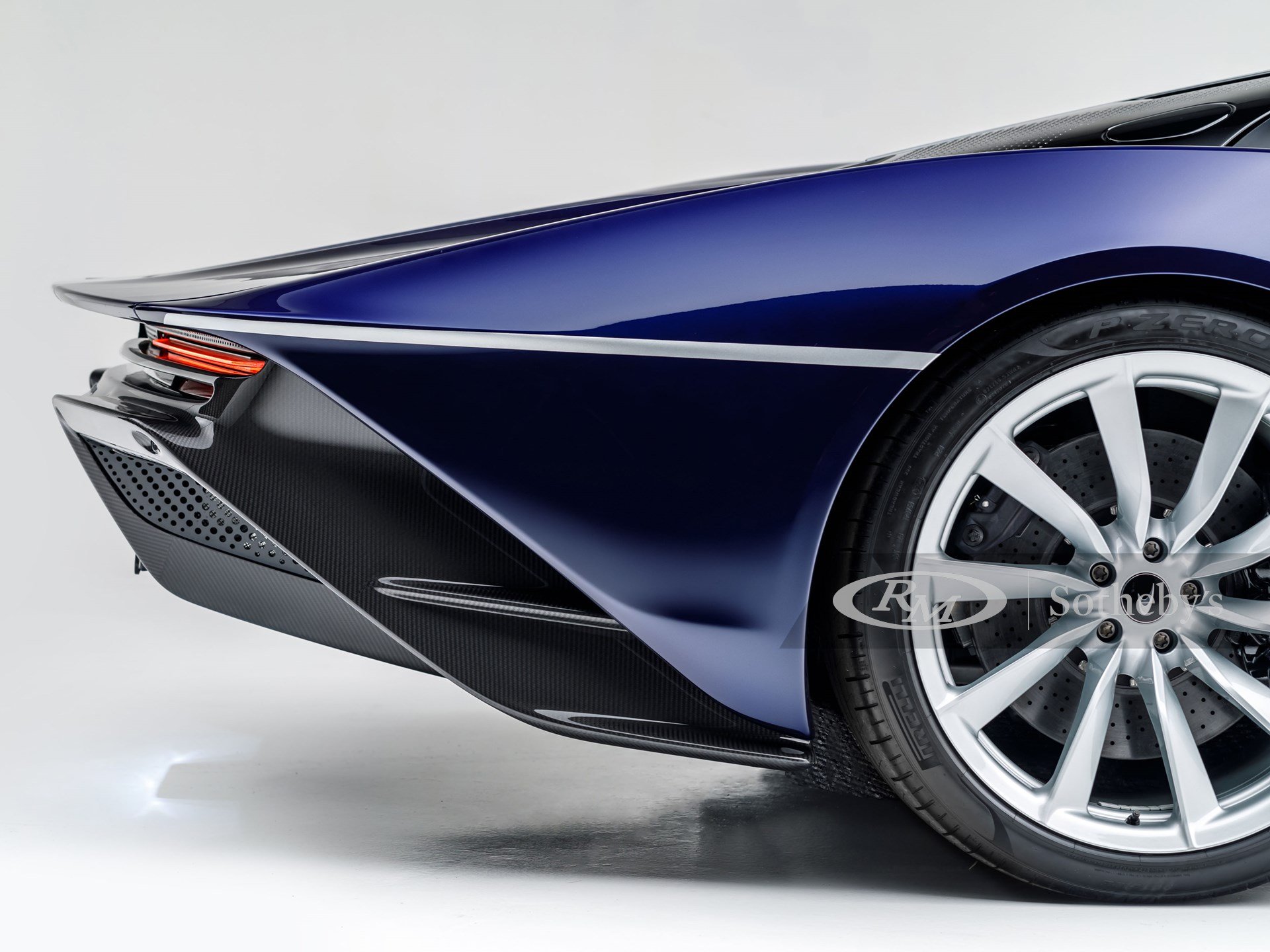 เรามาดูรายละเอียดของเจ้า McLaren Speedtail คันนี้กัน รถคันนี้คือคันที่ 36 จาก 106 คัน แซสซีส์หมายเลข SBM23GDG6LW403036 ตัวรถใหม่เอี่ยมผ่านการวิ่งมาเล็กน้อย 30 ไมล์ หรือ 48 กิโลเมตร สีตัวถังมาโทนน้ำเงินเข้ม MSO Heritage Atlantic Blue เพิ่มลายเส้นคาดข้างตัวรถสีเงิน เฉดเดียวกับล้ออัลลอย ล้อหน้าติดตั้งแผ่นคาร์บอนไฟเบอร์แบบมันเงา ช่วยลดความปั่นป่วนกระแสลมบริเวณล้อ คาลิปเปอร์เบรกเป็นสีดำ ส่วนปลายท่อไอเสียซ่อนรวมอยู่ใน Diffuser ล่าง มาในสีดำ Stealth Titanium ดูดุดัน ด้านในฝากระโปรงหน้าคุณยังจะได้กระเป๋าเดินทางคาร์บอนไฟเบอร์ 1 ใบ พร้อมด้วยชุดเครื่องมือไทเทเนียมสีทอง จัดมาให้เรียบร้อย