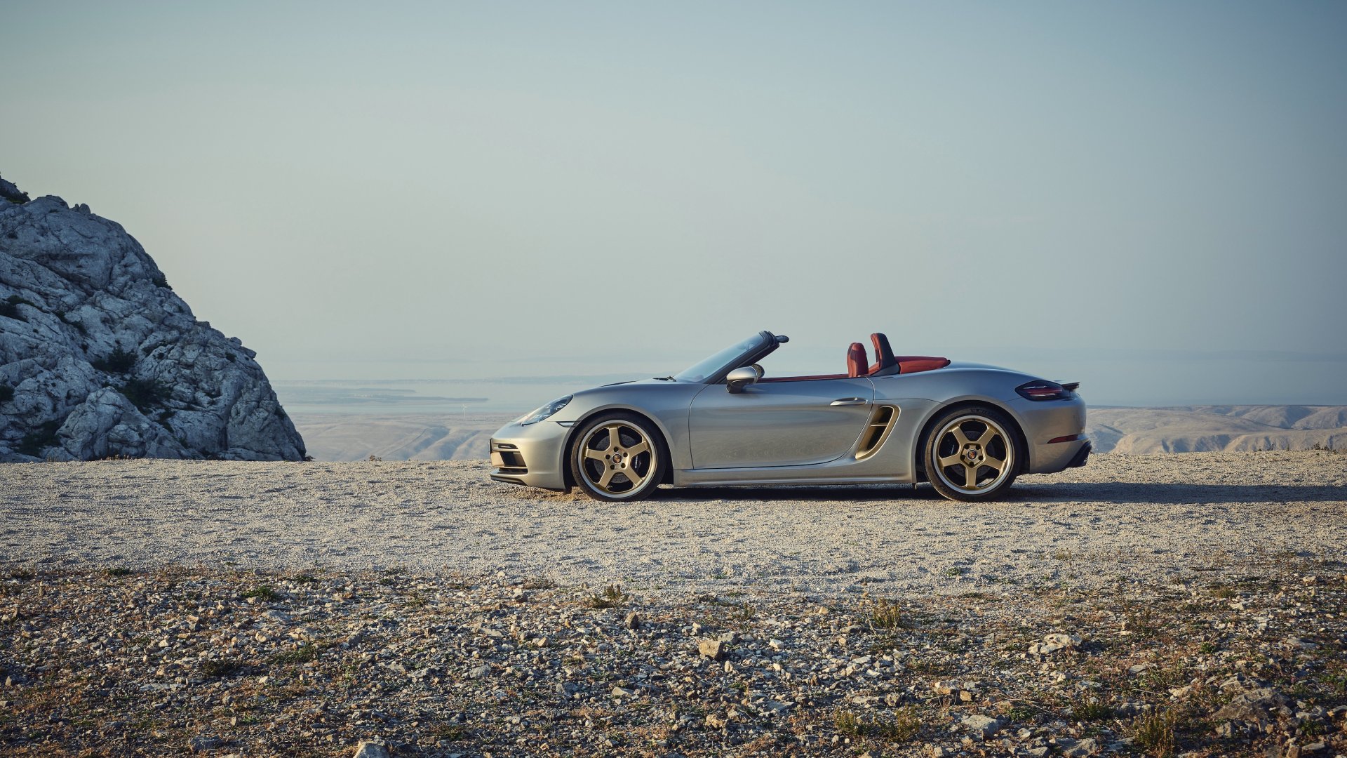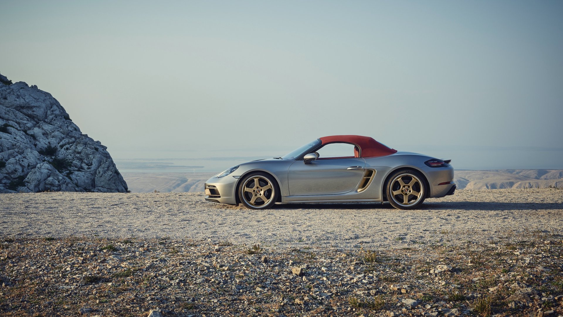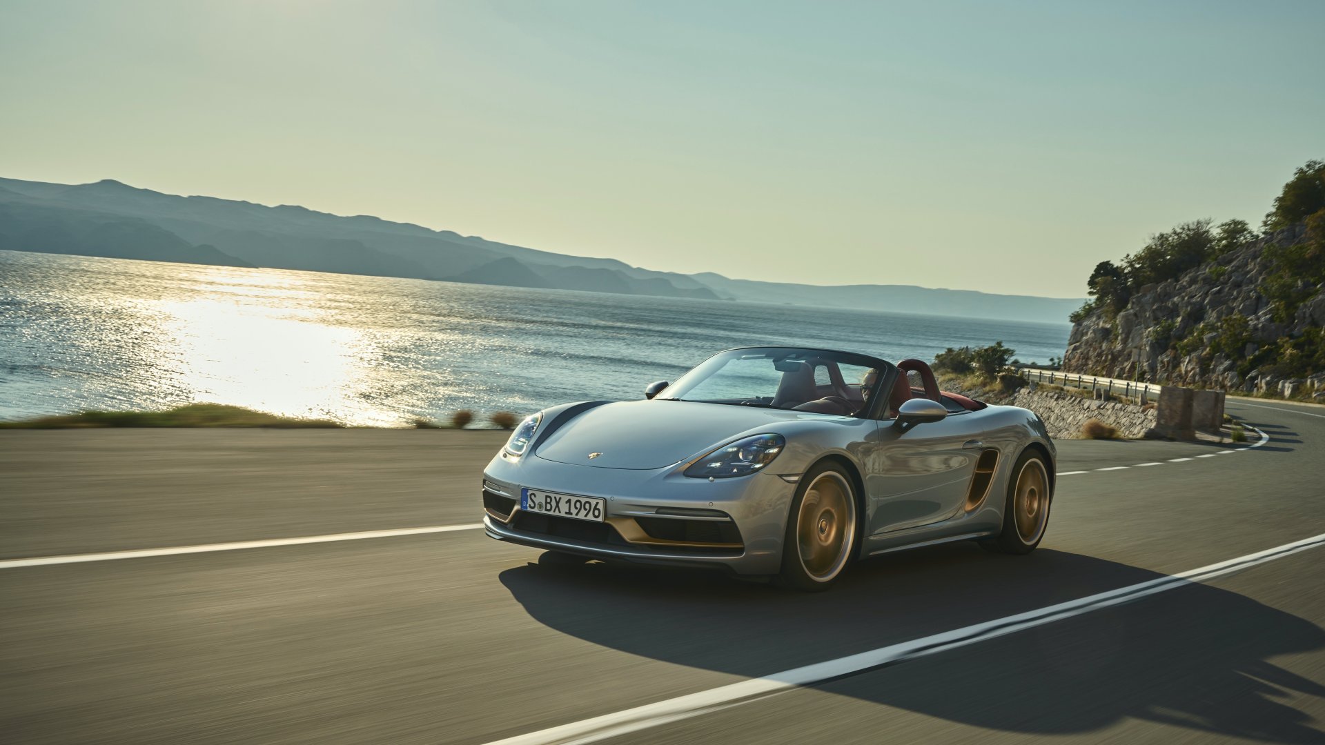 Boxster 25 years เปิดประทุนรุ่นพิเศษล่าสุด มันใช้พื้นฐานจาก 718 Boxster GTS 4.0 ตัวแรงที่เป็นรองเพียง Cayman GT4 เท่านั้น รถคันนี้ถอดแบบเปะๆ มาจาก 986 Boxster Concept ในปี 1993 ใช้ตัวถังสีเงิน GT Silver Metallic ที่ดูเรียบหรู เพิ่มความโดดเด่นด้วยสีทองอ่อนๆ Neodyme บริเวณช่องดักอากาศกันชนหน้า, ช่องดักอากาศข้างตัวรถ, ตรา 25 ปี ท้ายรถ และล้ออัลลอย 5 ก้าน ขนาด 20 นิ้ว สีทูโทนสุดคลาสสิค มีรายละเอียดอื่นเพิ่มเติมอย่างฝาถังน้ำมันอลูมิเนียมดีไซน์พิเศษ ท่อไอเสียสีเงิน sports exhaust system และหลังคาผ้าใบสีแดงมีลายนูน Boxster 25 ตัดกับเสากระจกบังลมหน้าสีดำ ส่วนถ้าไม่ชอบตัวถังสีนี้ยังมีให้เลือกเพิ่ม 2 สี คือดำ Deep Black Metallic กับขาว Carrara White Metallic แต่เราแนะนำว่าสีเงินนี่แหละบ่งบอกความเป็นความเป็นรุ่นพิเศษสุดละ