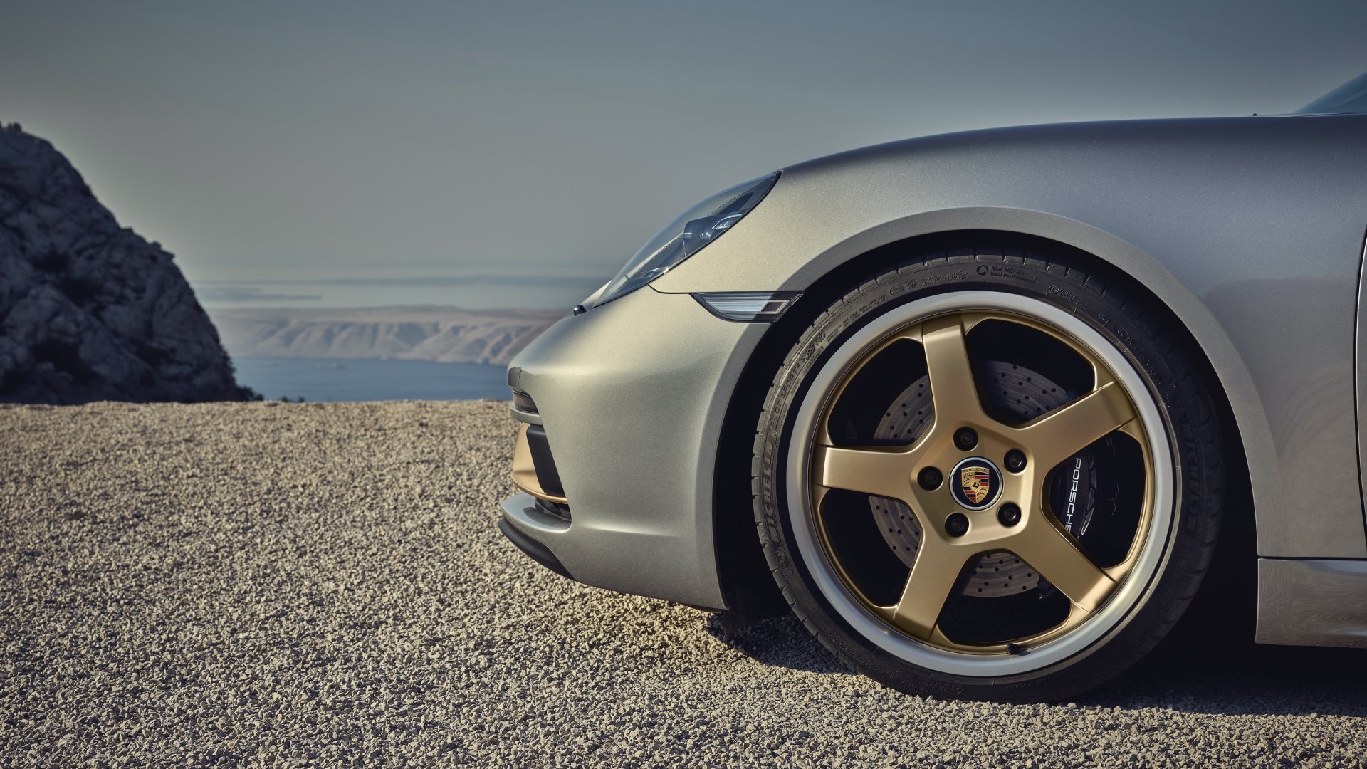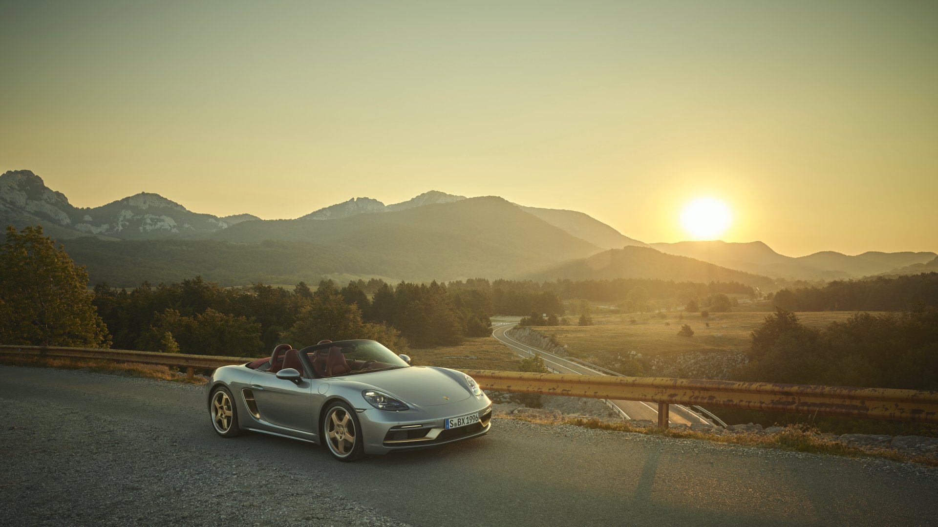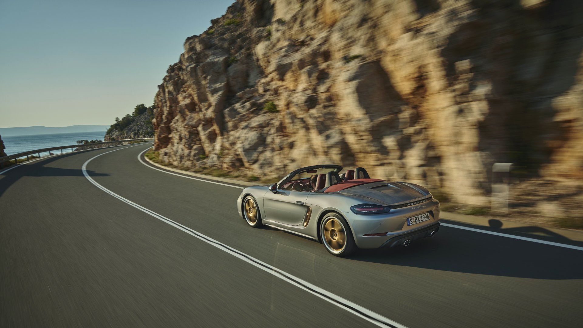 Boxster 25 years เปิดประทุนรุ่นพิเศษล่าสุด มันใช้พื้นฐานจาก 718 Boxster GTS 4.0 ตัวแรงที่เป็นรองเพียง Cayman GT4 เท่านั้น รถคันนี้ถอดแบบเปะๆ มาจาก 986 Boxster Concept ในปี 1993 ใช้ตัวถังสีเงิน GT Silver Metallic ที่ดูเรียบหรู เพิ่มความโดดเด่นด้วยสีทองอ่อนๆ Neodyme บริเวณช่องดักอากาศกันชนหน้า, ช่องดักอากาศข้างตัวรถ, ตรา 25 ปี ท้ายรถ และล้ออัลลอย 5 ก้าน ขนาด 20 นิ้ว สีทูโทนสุดคลาสสิค มีรายละเอียดอื่นเพิ่มเติมอย่างฝาถังน้ำมันอลูมิเนียมดีไซน์พิเศษ ท่อไอเสียสีเงิน sports exhaust system และหลังคาผ้าใบสีแดงมีลายนูน Boxster 25 ตัดกับเสากระจกบังลมหน้าสีดำ ส่วนถ้าไม่ชอบตัวถังสีนี้ยังมีให้เลือกเพิ่ม 2 สี คือดำ Deep Black Metallic กับขาว Carrara White Metallic แต่เราแนะนำว่าสีเงินนี่แหละบ่งบอกความเป็นความเป็นรุ่นพิเศษสุดละ