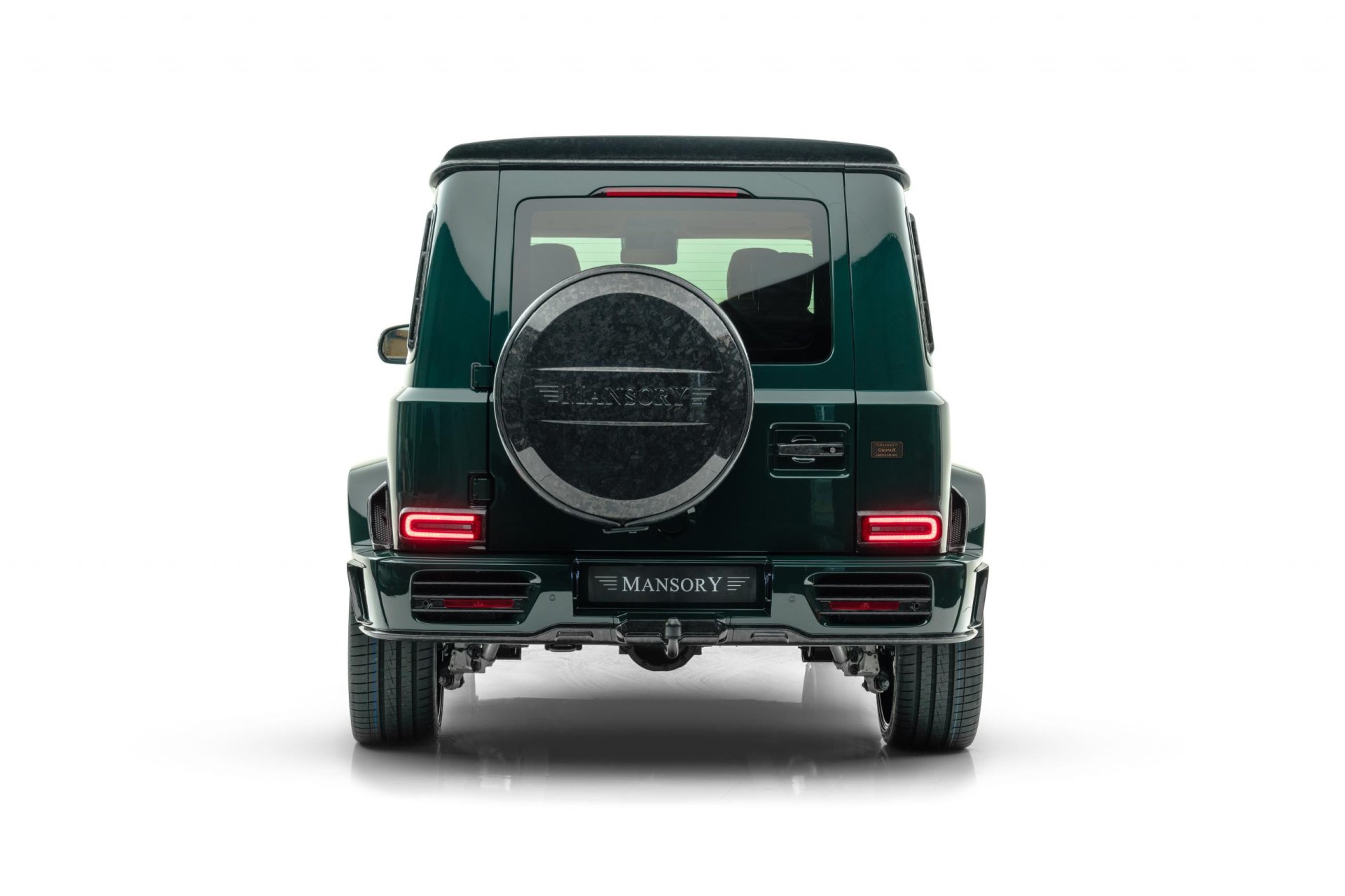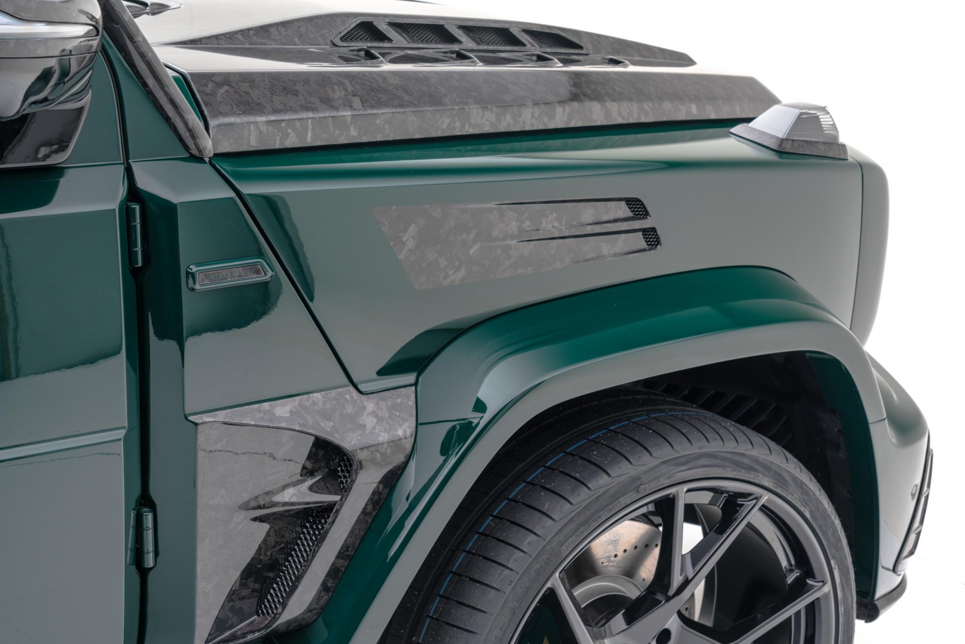 นี่คือ GRONOS 2021 เป็นการจับรถ G-Class G63 มาอัพเกรดโดย Mansory ตัวถังใช้สีเขียวพิเศษ British Racing Green ชิ้นงานด้านแอรโรไดนามิกถูกออกแบบใหม่ จัดหนักด้วย Forged Carbon สี Dark grey ตั้งแต่หน้าจรดท้าย ไม่ว่าจะเป็น ฝากระโปรงหน้า, ชุดกันชนหน้า, กระจังหน้า กระจกมองข้าง, มือจับประตู, ช่องลมด้านข้าง และฝาครอบล้ออะไหล่ บวกกับล้อ Forged ขอบ 24 นิ้ว สีดำเงา สวมพร้อมยางสมรรถนะสูงไซด์เดียวกันทั้งหมด 295/30 R24