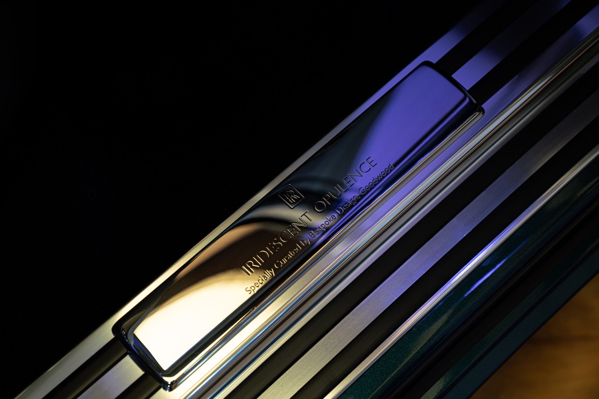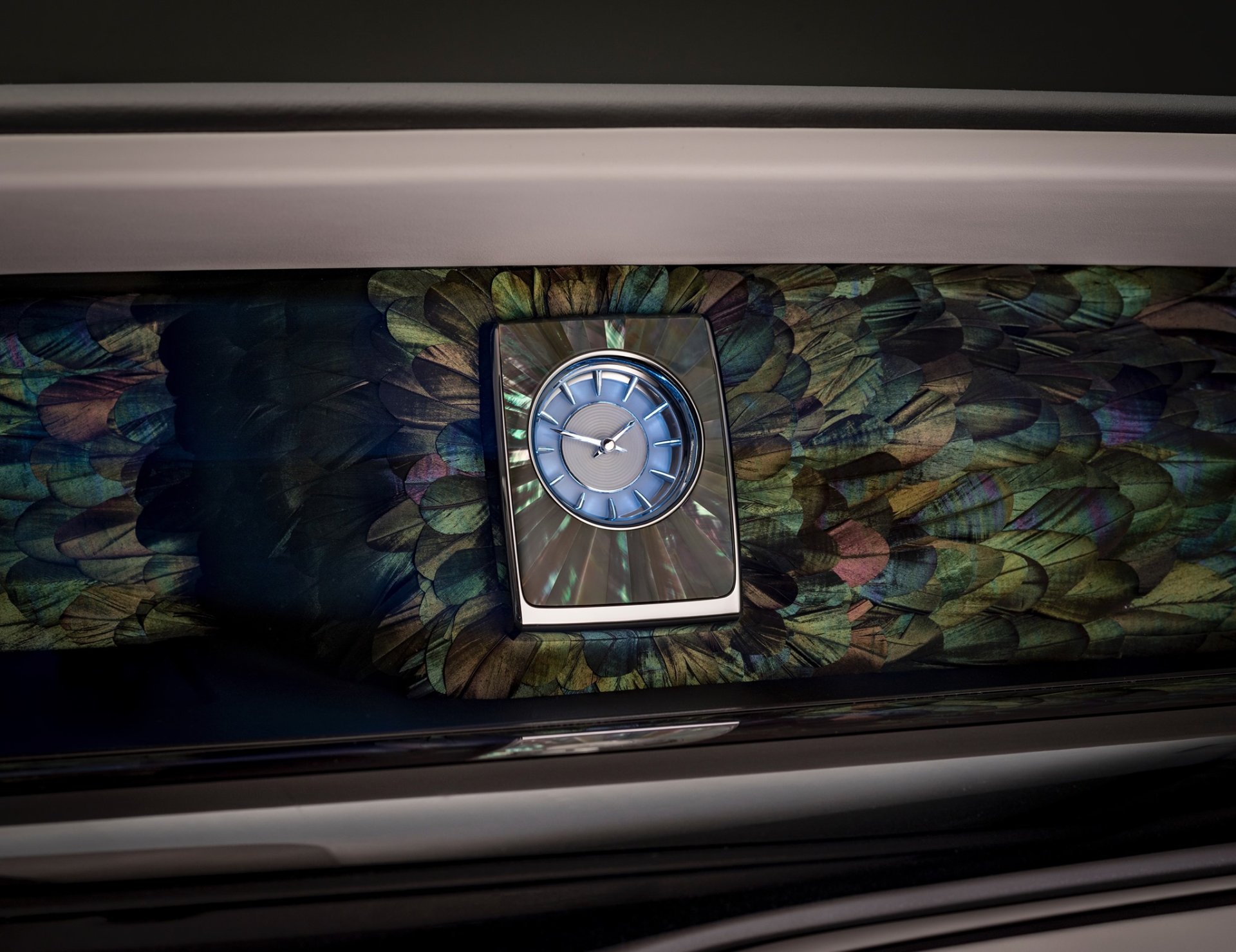 Rolls-Royce Phantom Extended คันนี้ถูกเปิดผ้าคลุมกันที่โชว์รูม Rolls-Royce Motor Cars Abu Dhabi Motors ประเทศสหรัฐอาหรับเอมิเรตส์ ต่อหน้าลูกค้า VIP ที่ได้รับเชิญมา มันใช้ชื่อว่า PHANTOM ‘IRIDESCENT OPULENCE’ ตัวถังภายนอกดูเรียบหรูแนวทูโทน ด้วยสีเขียว Dark Silk Teal ตัดสีเงิน Premier Silver พิเศษด้วยเส้น Coachline สีม่วงวาดเป็นลวดลายขนนก โดยไฮไลท์ของรถคันนี้อยู่ที่ห้องโดยสาร บนแผงคอนโซลหน้า 'The Gallery' ที่มีการตกแต่งพิเศษด้วยการนำขนนกส่วนหางคัดอย่างดีมากกว่า 3,000 ชิ้น นำมาเย็บต่อกันลงบนผ้าออกมามีสีแวววาวสวยงามดูธรรมชาติ ลงตัวกับนาฬิกาเข็มที่ฝังมุกสุดหรู ผลงานที่เราเห็นนี้ออกแบบโดยทาง Nature Squared ในสวิตเซอร์แลนด์ ก่อตั้งโดยคุณ Paul Hoeve และ Lay Koon Tan ซึ่งบริษัทนี้เขาเชี่ยวชาญในการเอาวัสดุจากธรรมชาติต่างๆ มาทำเป็นพื้นผิวกับงานเฟอร์นิเจอร์ภายในบ้านหรู หรือแม้กระทั่งเรือยอร์ช เครื่องบินเจ๊ท พวกเขาก็รับทำได้หมด