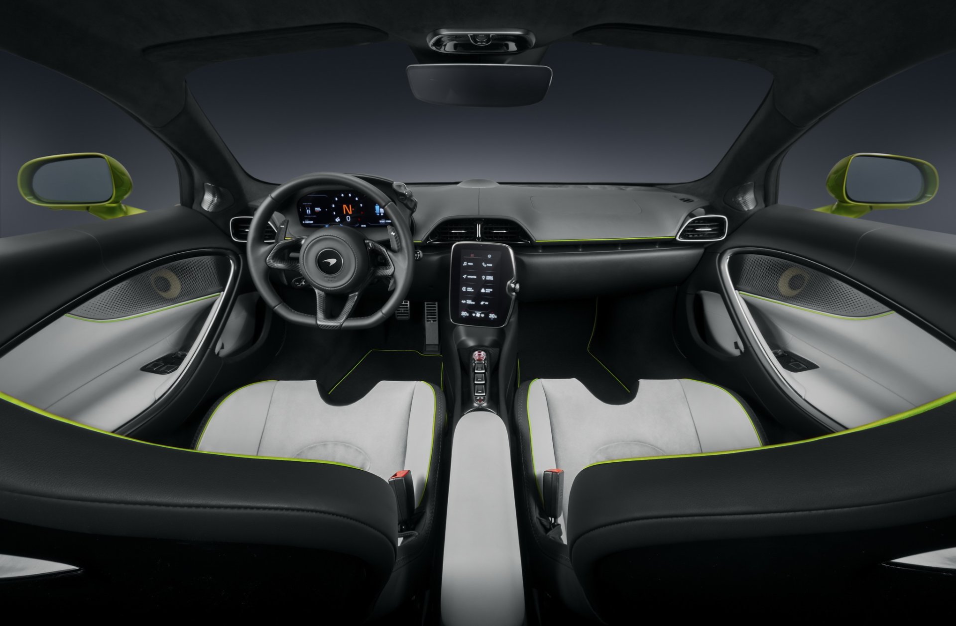 ภายในห้องโดยสารปรับรูปแบบใหม่ ในตัวมาตรฐานจะมาในโทนสีดำ Jet Black พวงมาลัยหุ้มหนัง แผงคอนโซล เบาะนั่งเป็นวัสดุ Alcantara ส่วนถ้าต้องการหนังแท้ Nappa โทนสีอื่นๆ ก็ต้องจ่ายเพิ่มกันไป มาตรวัดความเร็วเป็นแบบจอสี ถูกขนาบข้างด้วยปุ่มปรับโหมดการขับขี่ ส่วนกลางติดตั้งจอสัมผัสรุ่นใหม่ McLaren Infotainment System II ขนาด 8 นิ้ว รองรับ  Apple CarPlay และ Android Auto  ส่วนใครจะเอาไปวิ่งเล่นในสนามแข่งสามารถสั่งออฟชั่น Track Telemetry ตัวจับเวลา และกล้องวิดีโอมาติดได้