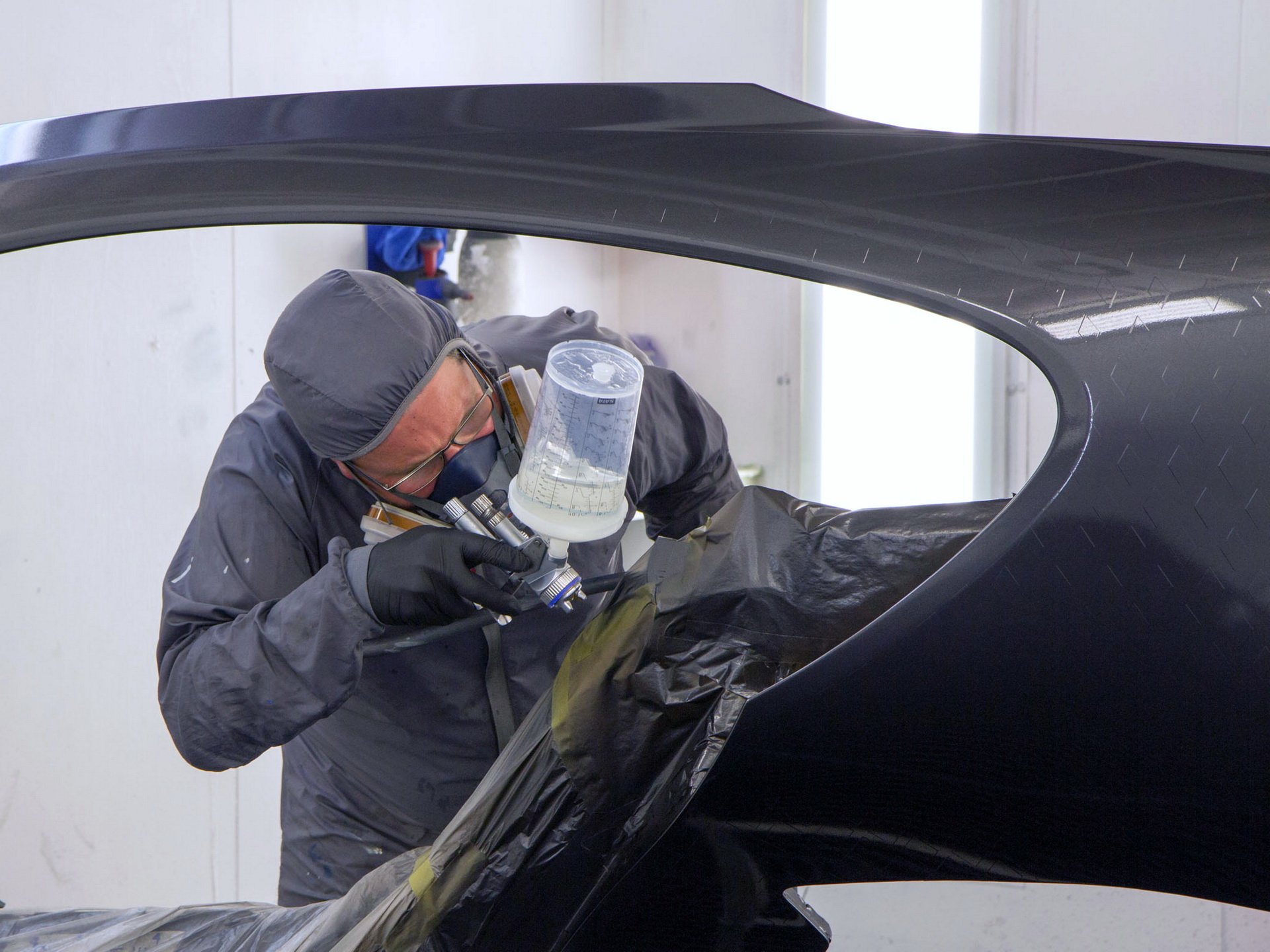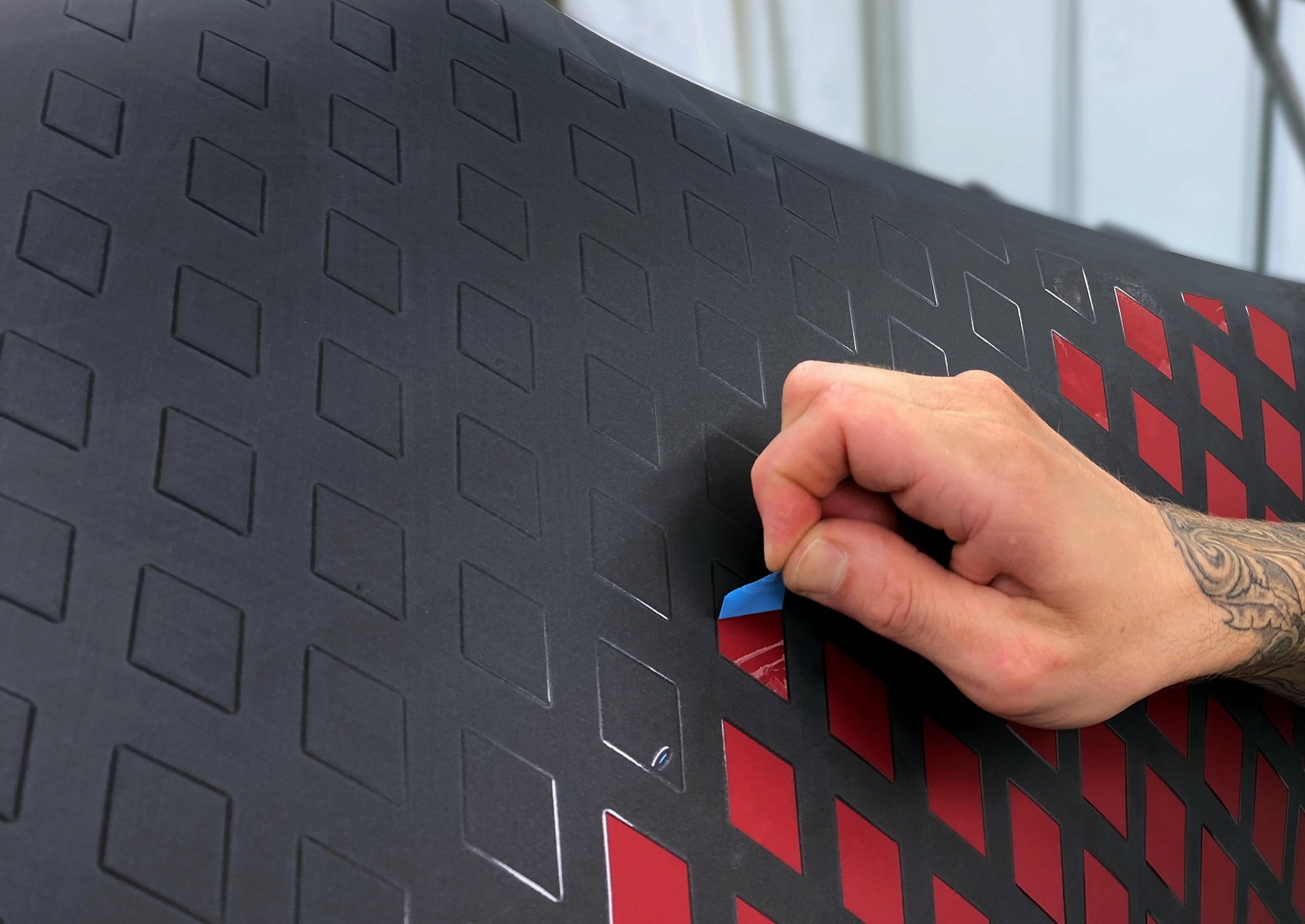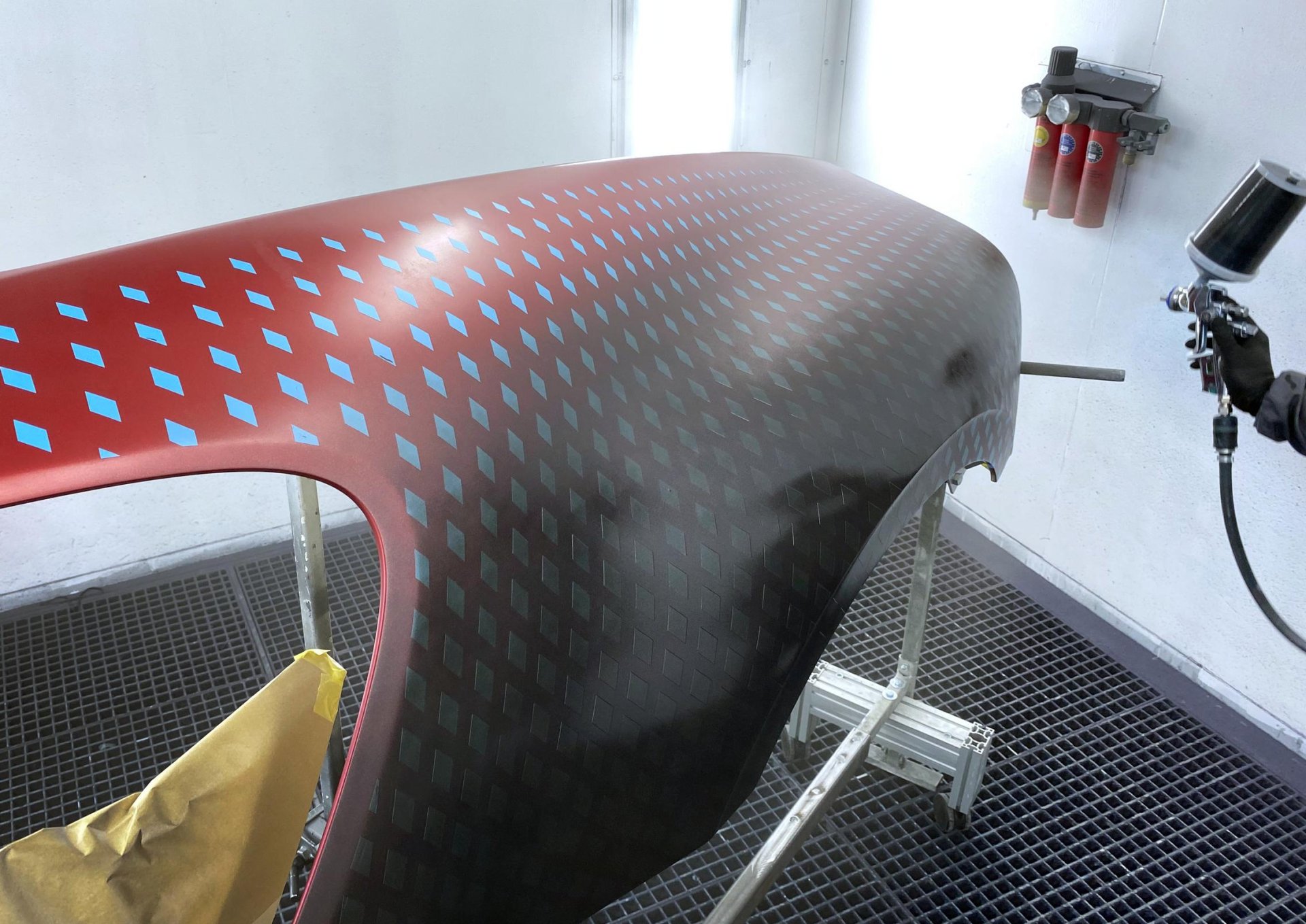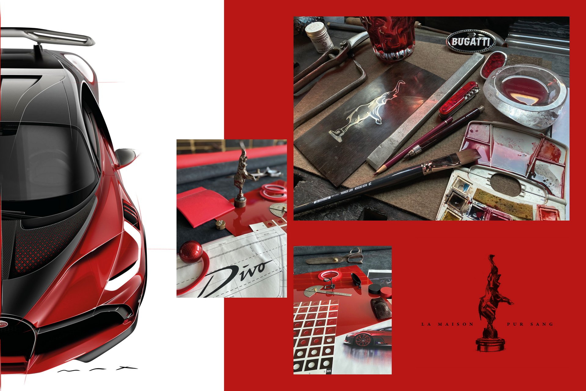 Bugatti DIVO คันนี้มีนามว่า ‘Lady Bug’ เป็นงานสั่งทำพิเศษของลูกค้านักสะสมจาก USA ตัวถังเลือกใช้สีพิเศษแบบเมทัลลิก 2 เฉด คือ แดง 'Customer Special Red' ตัดกับสีเทา 'Graphite' ส่วนจุดที่บอกว่าใช้เวลาทำร่วมปีครึ่ง คือบริเวณตัวถังที่มีลวดลายสี่เหลี่ยมเพชรราว 1,600 เม็ด รอบคัน เรียกว่าทำเอาทีมงาน Bugatti แทบจะถอดใจไปเลย พวกเขาใช้โปรแกรม CAD จำลองเพชร 2 มิติ แต่เมื่อนำไปใช้กับตัวถังรถจริง (รถทดสอบ) กลับเจอปัญหามากมายทั้งรูปทรงเพชรบิดเบี้ยวตามมุมโค้งต่างๆ ดูไม่เสมอกัน พลาดแค่มิลลิเมตรเดียวงานก็ต้องถูกเริ่มใหม่หมด จึงมีการปรับแก้งานนับไม่ถ้วนเพื่อให้ออกมาสมบูรณ์แบบที่สุด การสร้างเอฟเฟ็กนี้เริ่มจากการพ่นสีแดงทั่วทั้งคัน ต่อด้วยการติดฟิล์มลายเพชรขนาด 20 ฟุต เมื่อเช็คตำแหน่งแล้วว่าไม่มีจุดไหนผิดเพี้ยน ก็จะเริ่มพ้นสีเทา Graphite ทับลงไป แล้วจบด้วยการแกะฟิล์มแต่ละเม็ดออก ก็จะเผยให้เห็นเพชรสีแดงเรียงกันสวยงามนั้นเอง