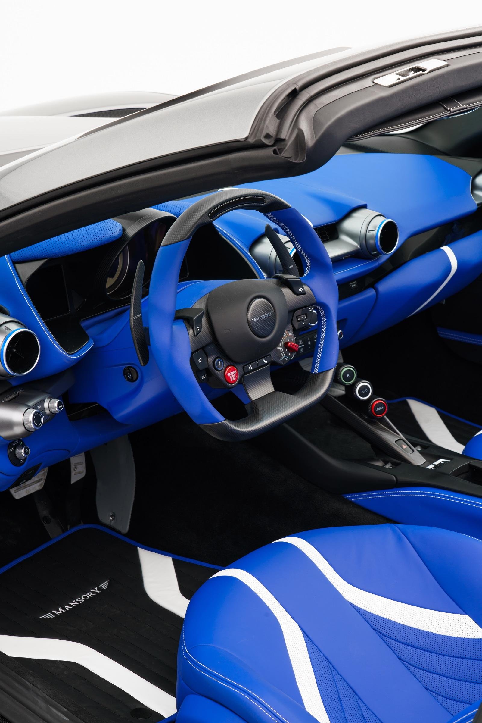ภายห้องโดยสารรื้อทำใหม่ จัดเต็มด้วยการหุ้มวัสดุหนังแท้ที่เน้นความนุ่มนวลสะดวกสบาย ตัดเย็บด้วยมือทั้งหมด ใช้โทนสีน้ำเงินตัดเด่นด้วยสีขาวดูหรูหรา พวงมาลัยทรงสปอร์ตหนังสลับคาร์บอนไฟเบอร์ออกแบบมาพิเศษ แป้นเหยียบอลูมิเนียม มีการปักตรา Mansory บนเบาะนั่ง พรมวางเท้า และที่ธรณีประตูสร้างความแตกต่างไม่เหมือนใคร