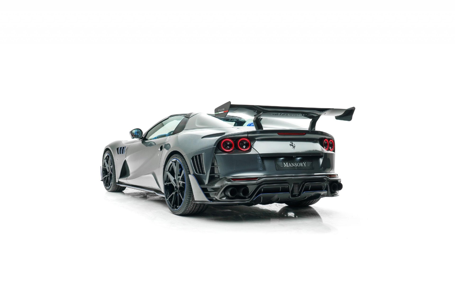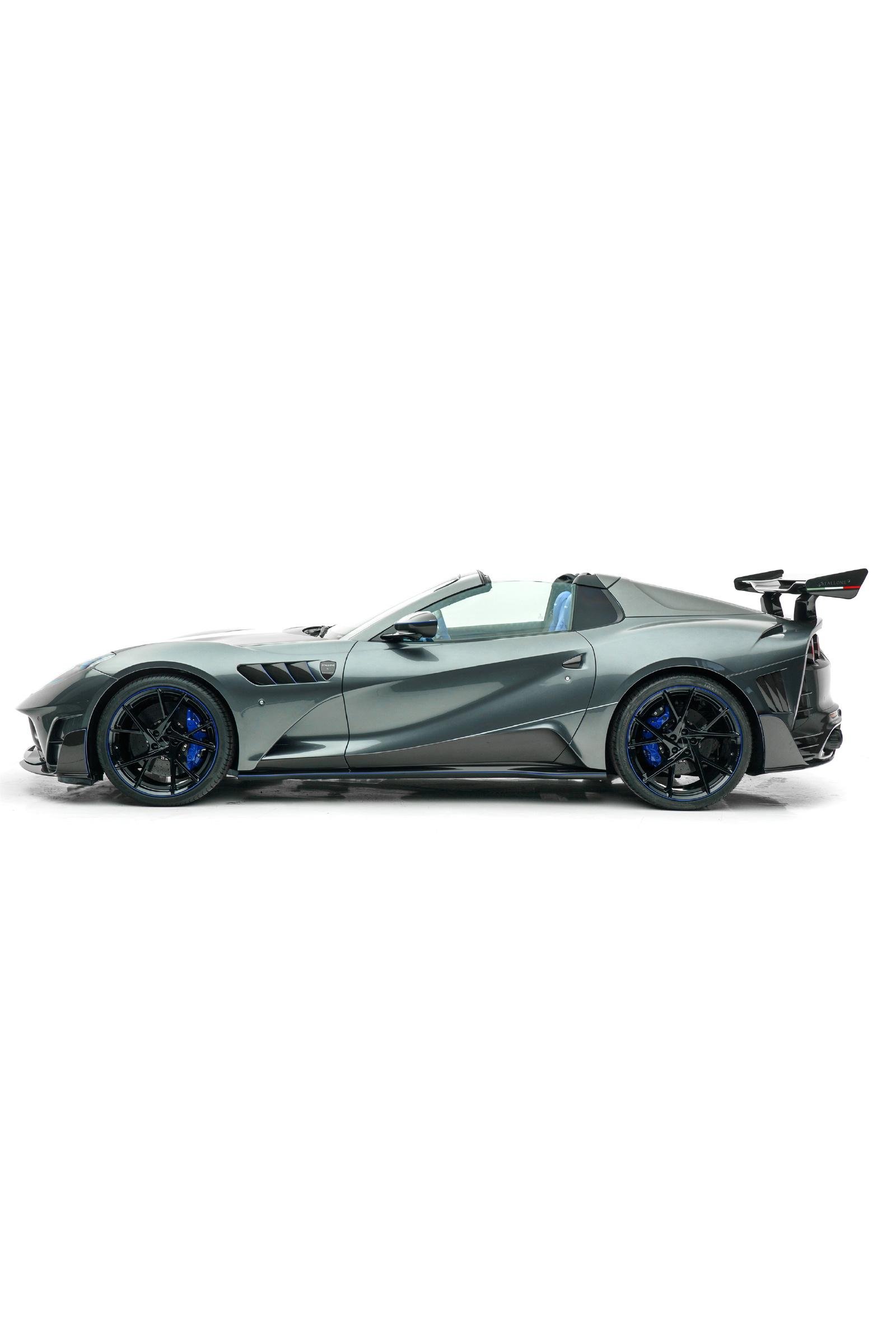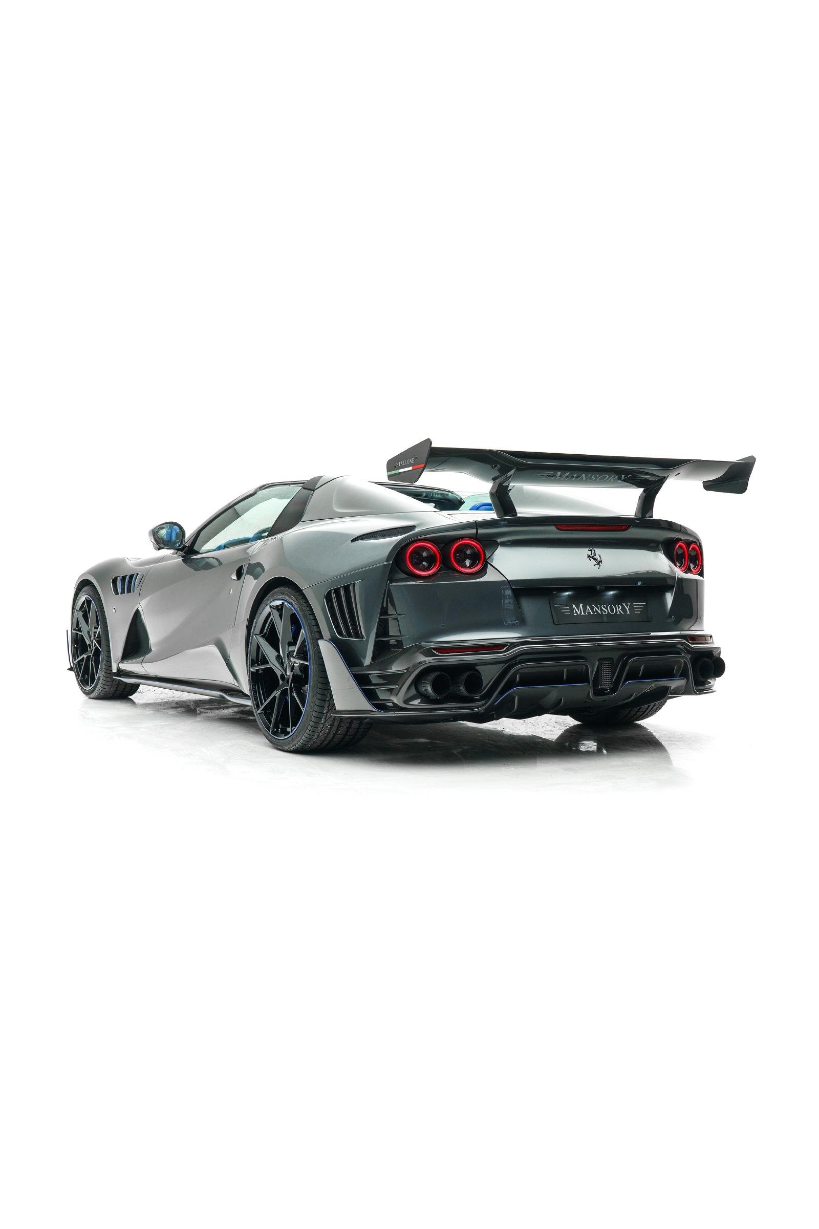 MANSORY Stallone GTS เป็นการปรับโฉมใหม่รอบคันของ Ferrari 812 GTS มากับตัวถังสีเทาพิเศษ Daytona-Grey และใช้สีน้ำเงินเข้มตัดเส้นรอบคัน ระบบช่วงล่างมีการเซ็ทใหม่ ได้ล้อ Forged น้ำหนักเบา ด้านหน้าขนาด 21 นิ้ว หลัง 22 นิ้ว สวมพร้อมยางประสิทธิภาพสูง ชิ้นส่วนพาร์ทเป็นคาร์บอนไฟเบอร์ทั้งหมด ประสิทธิภาพด้านแอร์โรไดนามิกก็ดีขึ้นด้วย ทั้งชุดกันชนหน้าใหม่, ฝากระโปรง, แผงครีบข้างตัวรถ, สเกิร์ตข้าง, กระจกมองข้างเสริมครีบ บั้นท้ายที่มองแล้วโดนใจ กันชนพร้อม Diffuser ชิ้นใหม่หมด ระบบท่อไอเสียก็ของใหม่จัดจ้านกว่าเดิม และปีกท้ายชิ้นโตที่จะช่วยเพิ่ม Downforce ได้อย่างยอดเยี่ยมทีเดียว